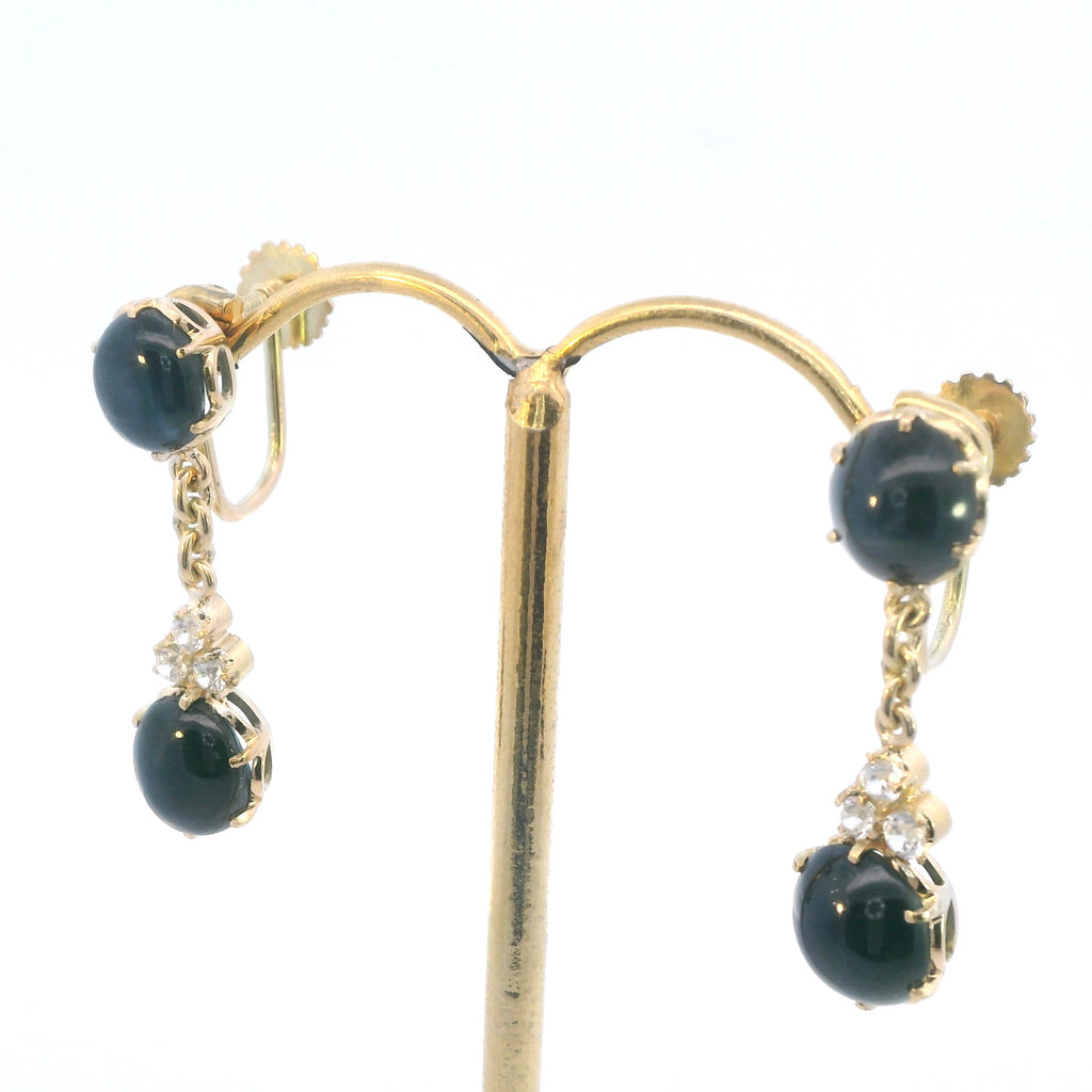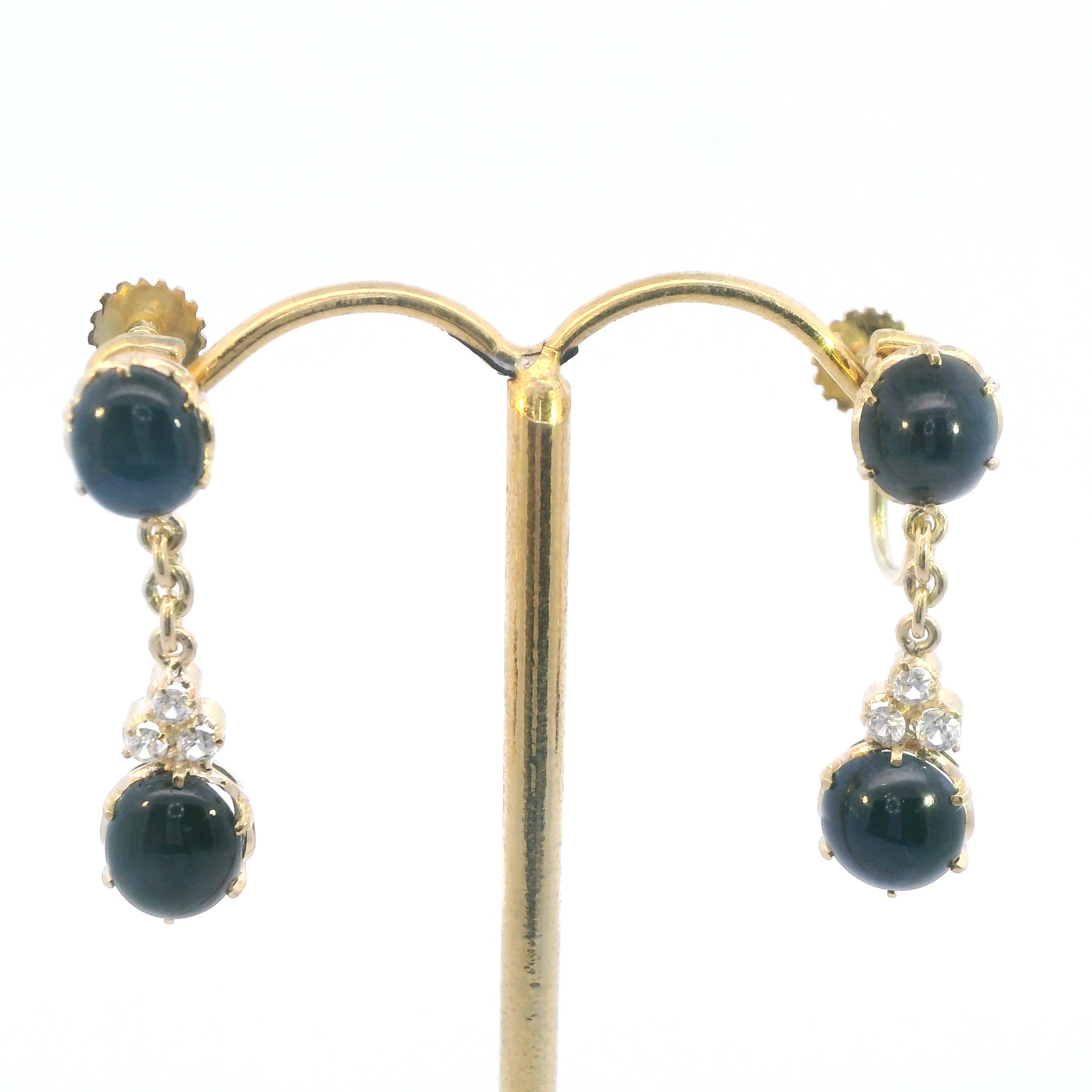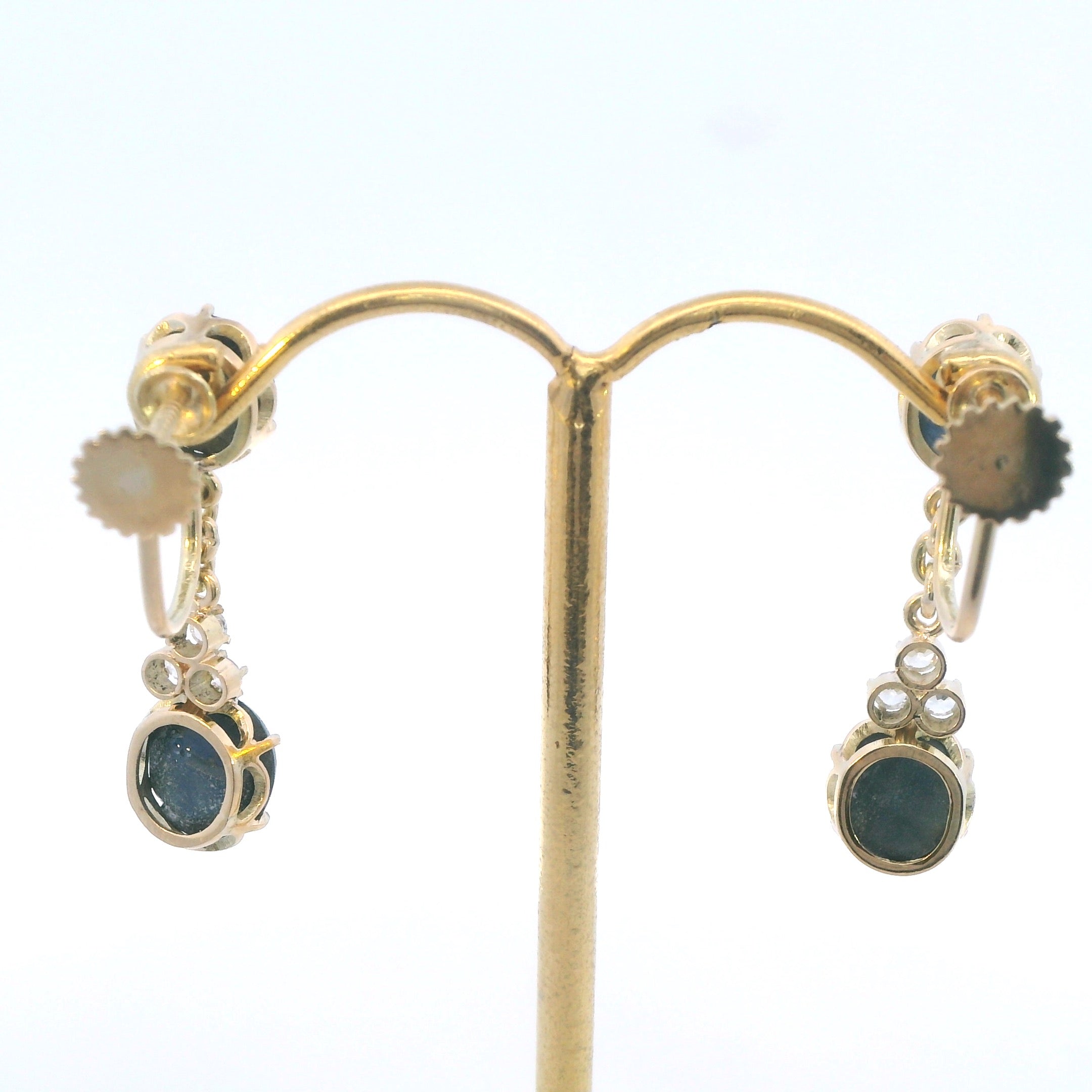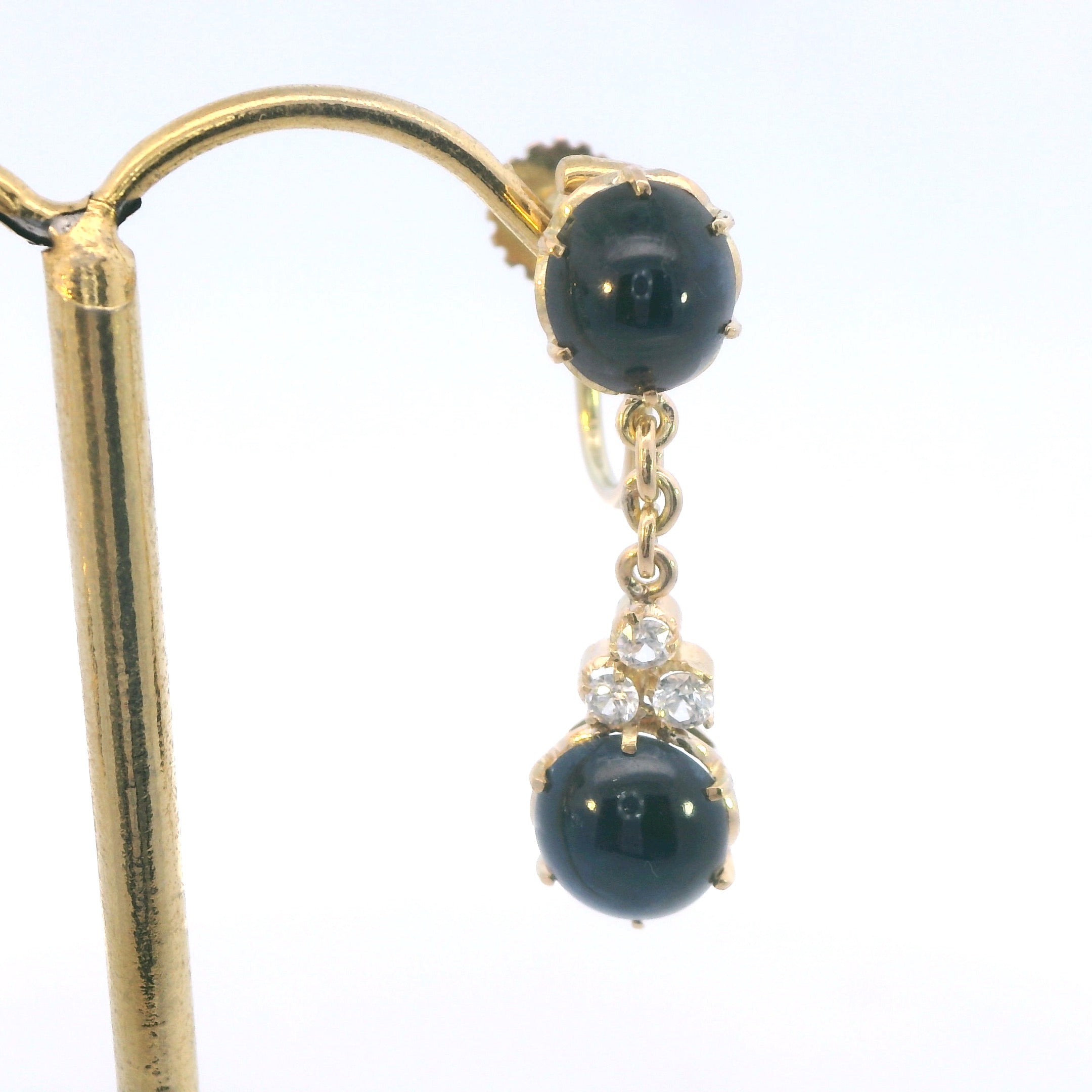 This stunning pair of yellow gold sapphire and diamond drop stud earrings is a true testament to elegance and craftsmanship. Each earring is set with two mesmerizing oval star sapphire cabochons, known for their enchanting star-like reflection caused by light interacting with the stone’s internal structure. These captivating gemstones, one measuring 8mm x 7mm and the other 7mm x 6mm, bring a unique and mystical allure to the earrings.
