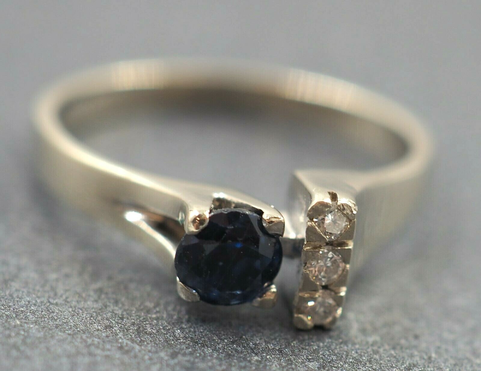 This classic petite ring features a beautiful dark blue Sapphire with three gorgeous diamonds set in white gold. The ring is a very simple and classic in style and absolutely lovely! The diamonds are of good eye clear colour and clarity and the ring is in good condition.