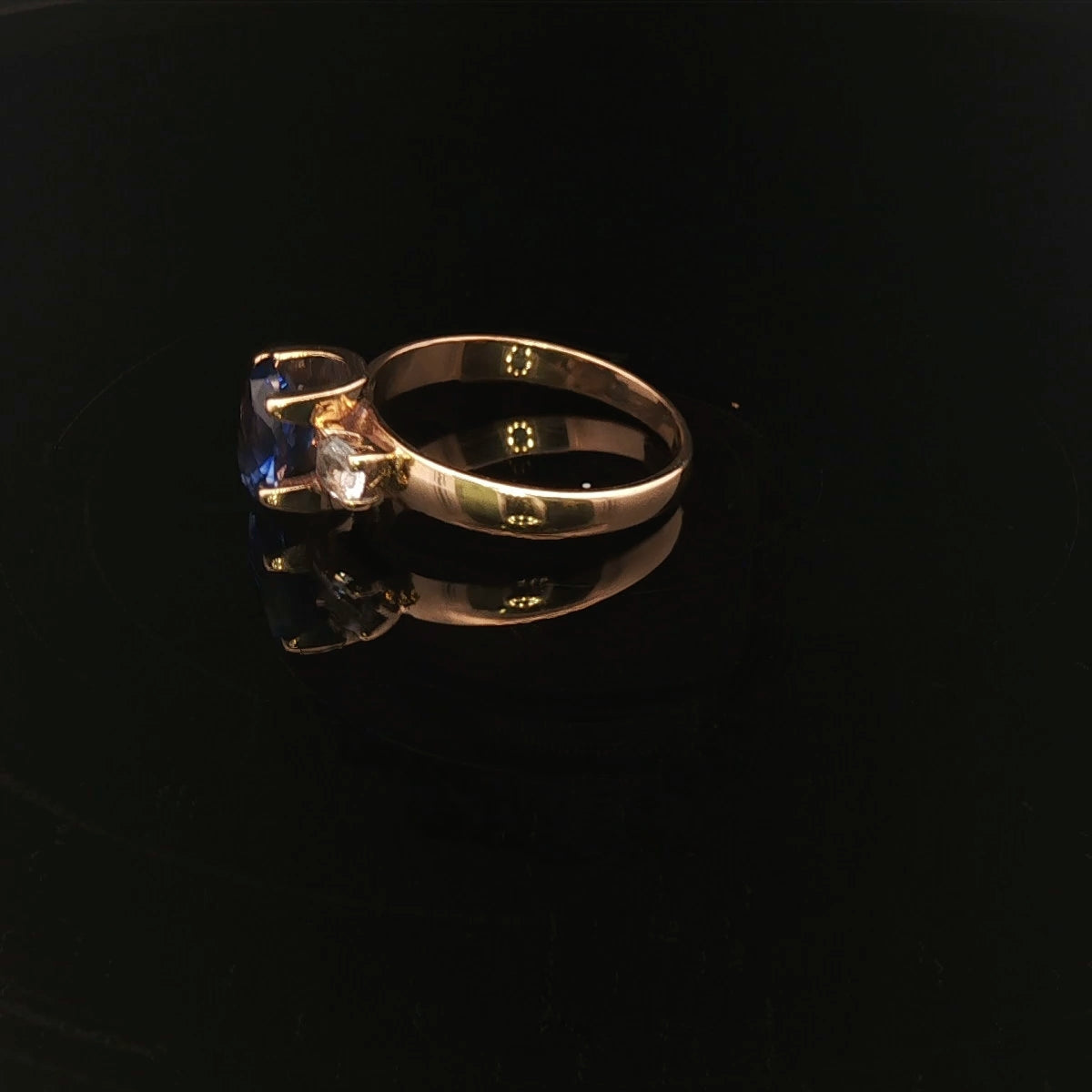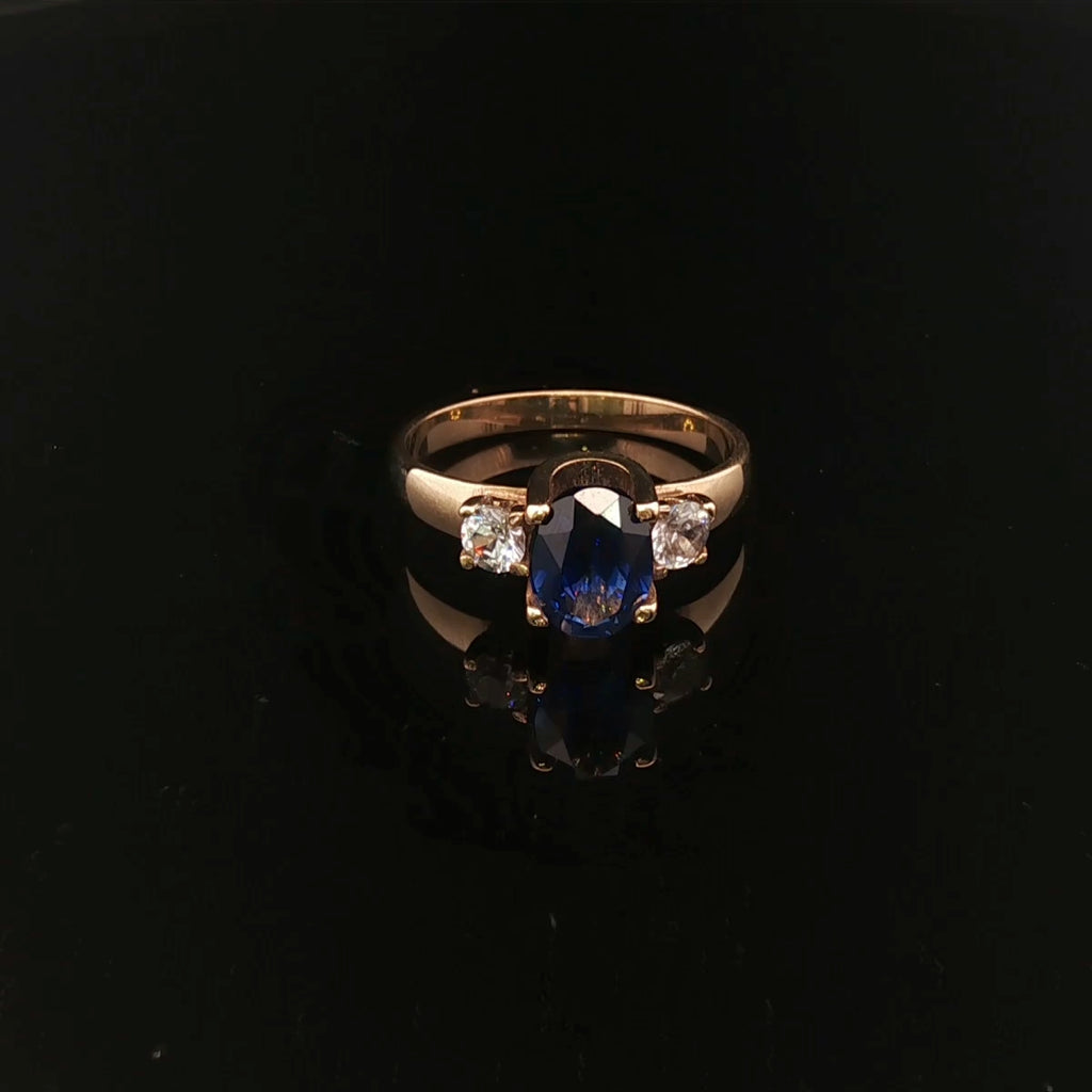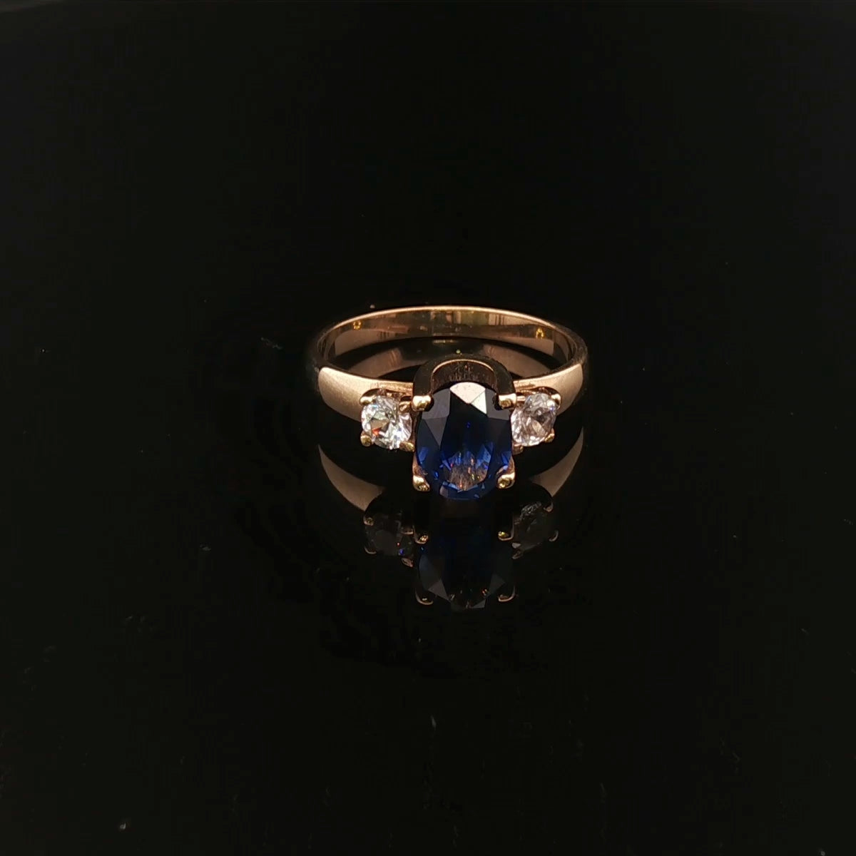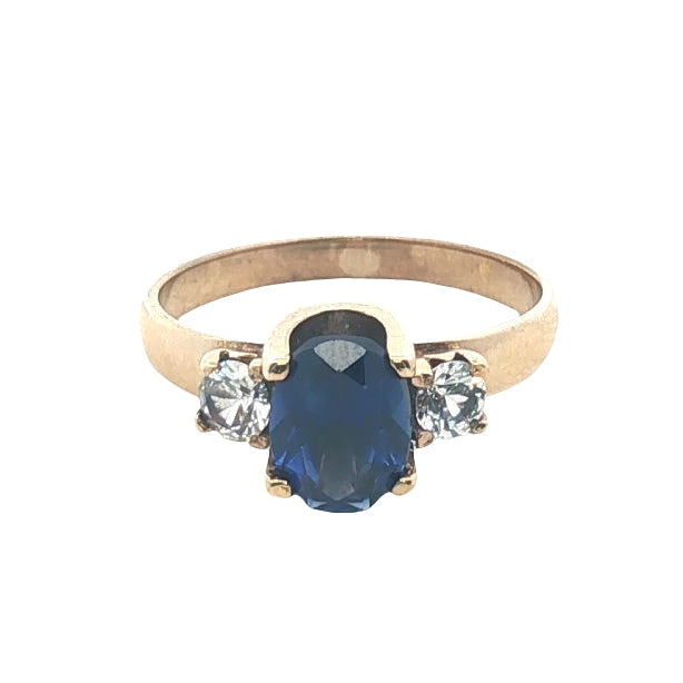 This gorgeous 9ct yellow gold ring features a vibrant oval-cut created blue sapphire set at its centre, beautifully complemented by a clear cubic zirconia on each shoulder. The contrast of the deep blue gemstone against the warm gold band creates a striking, timeless design that radiates elegance and style.