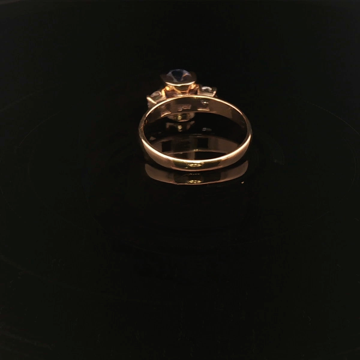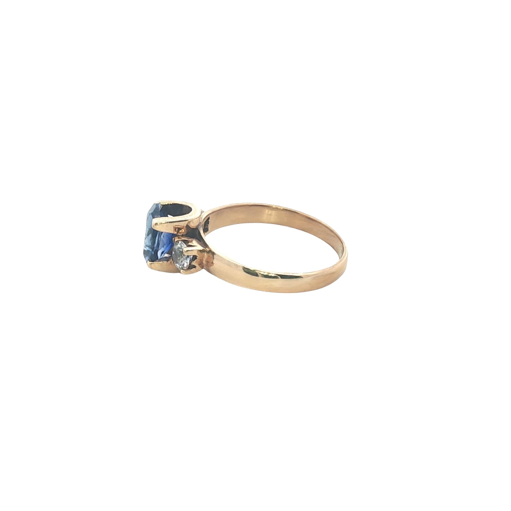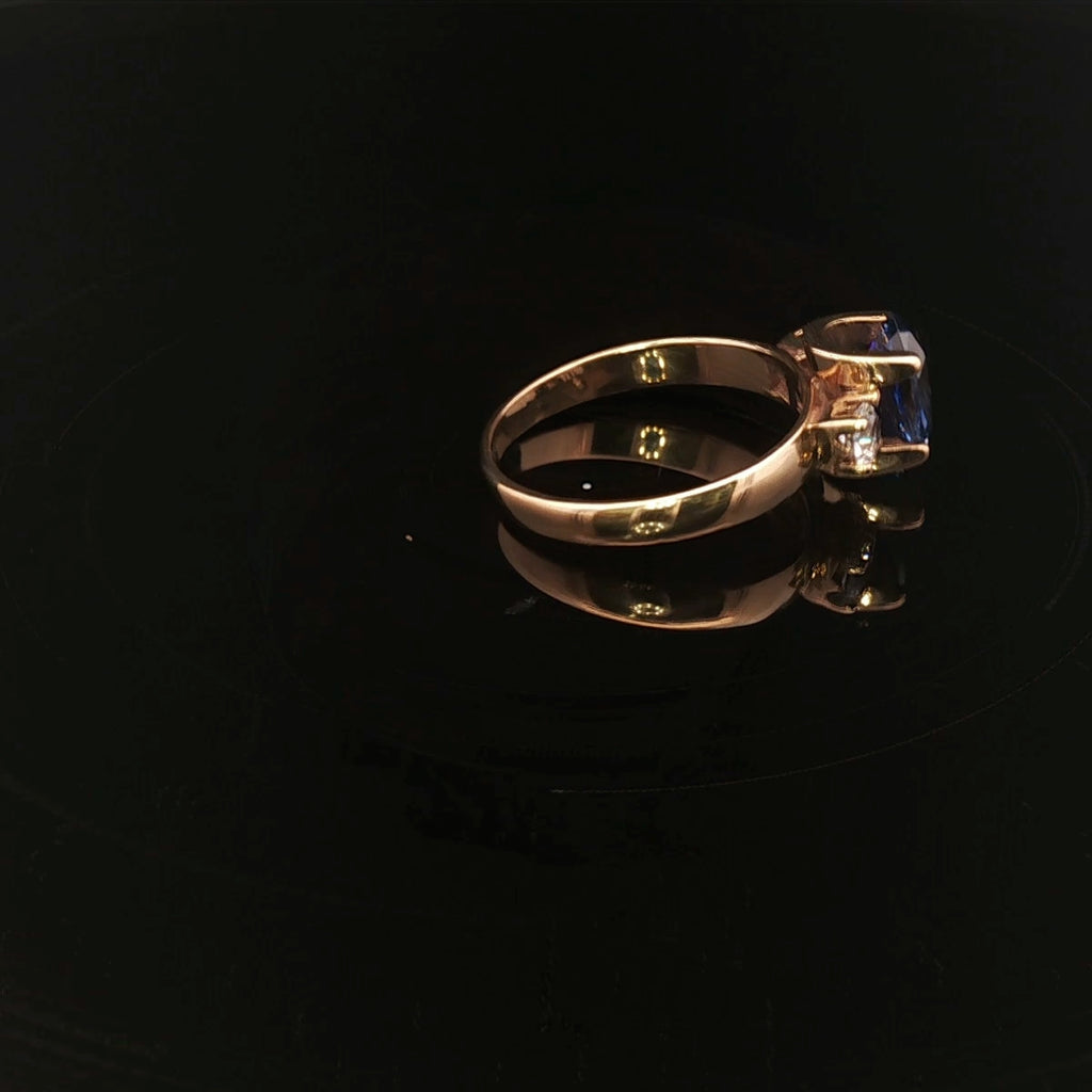 This gorgeous 9ct yellow gold ring features a vibrant oval-cut created blue sapphire set at its centre, beautifully complemented by a clear cubic zirconia on each shoulder. The contrast of the deep blue gemstone against the warm gold band creates a striking, timeless design that radiates elegance and style.