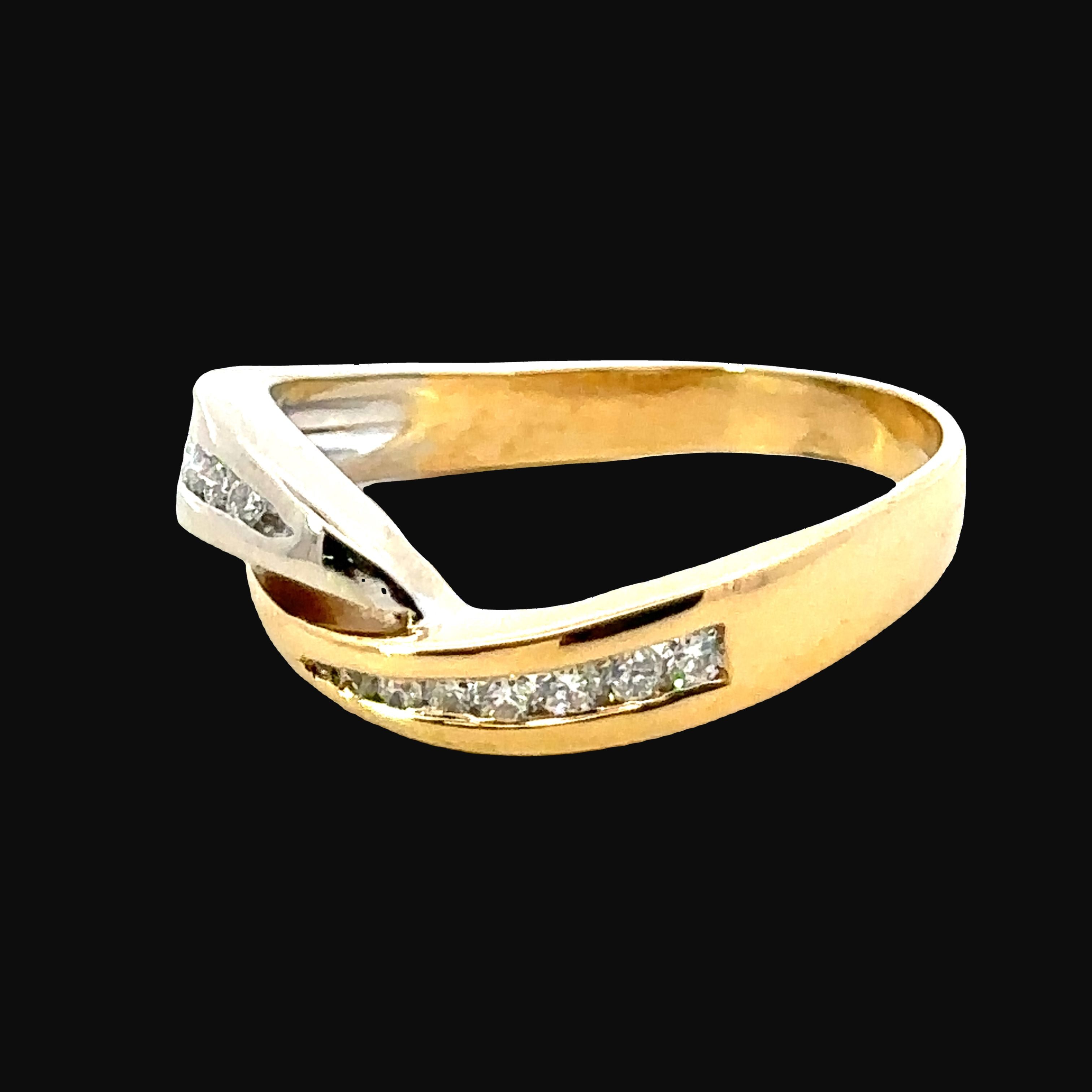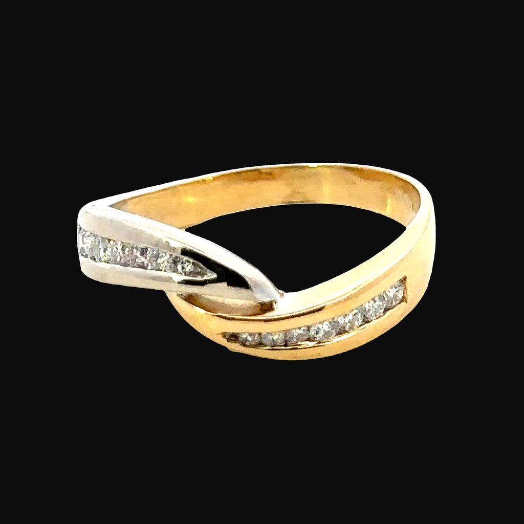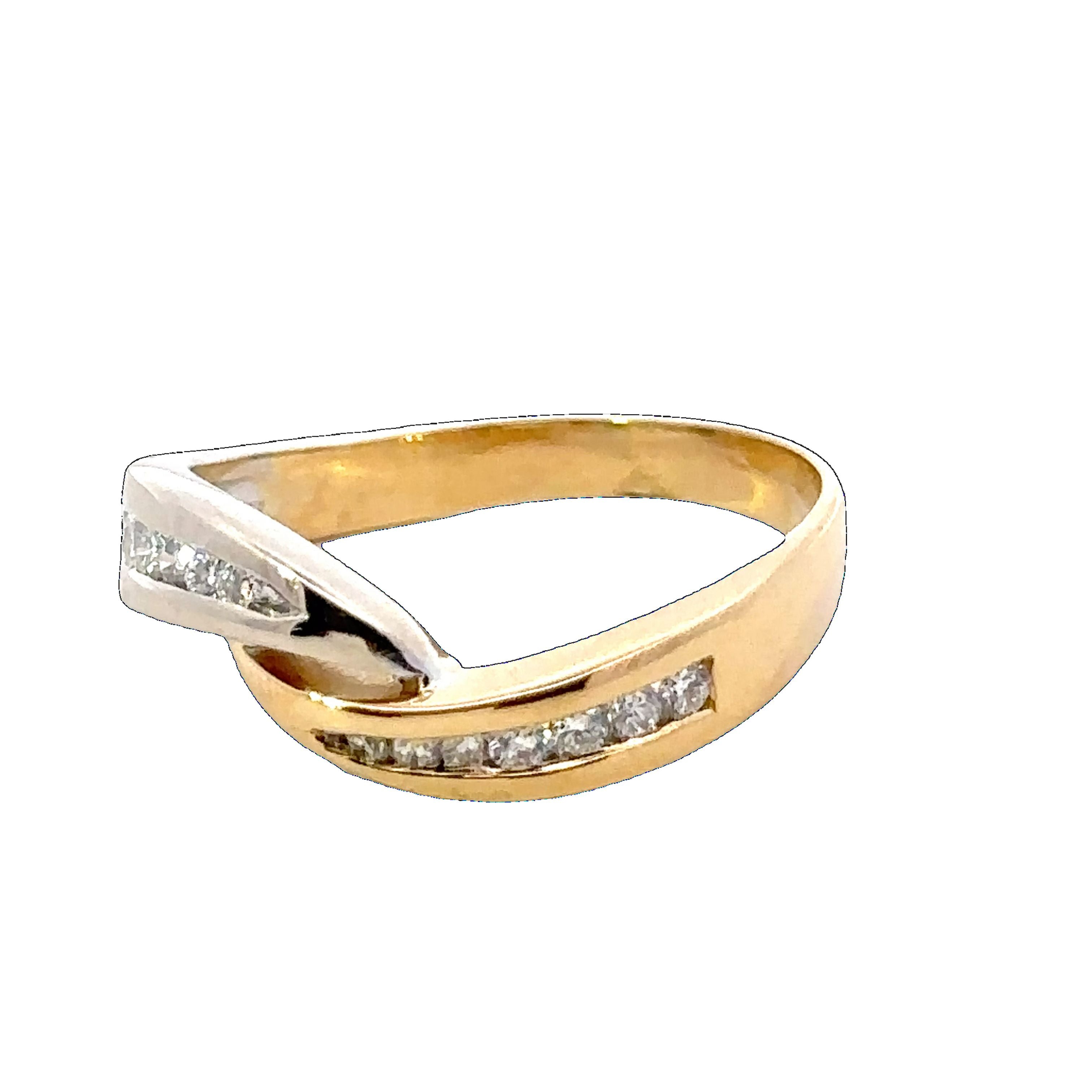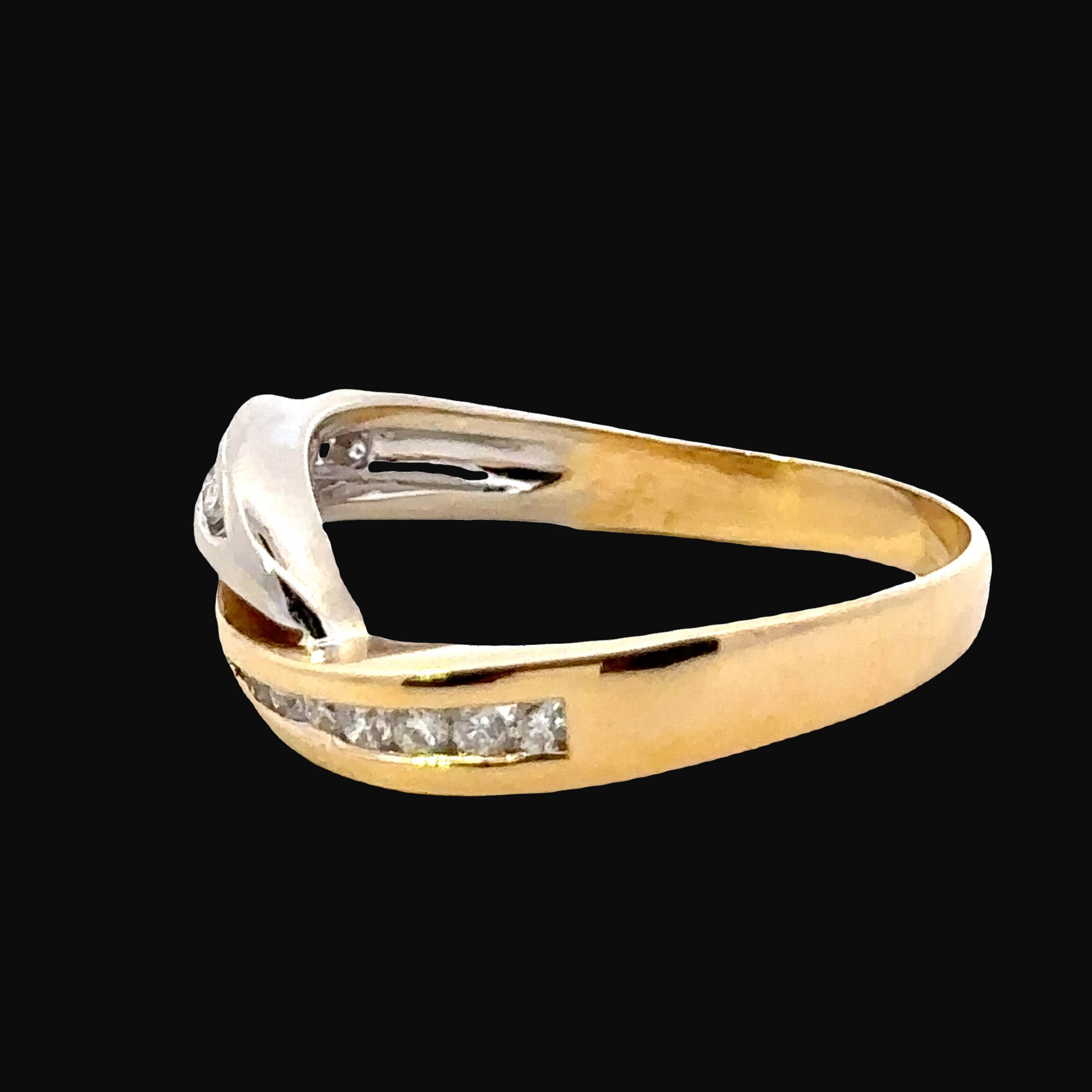 This stunning ring features a captivating arrangement of 14 round brilliant cut diamonds, expertly channel-set in a pointed cross-over design atop a two-tone yellow gold band. The contrasting colours of yellow and white gold add a touch of sophistication to the overall aesthetic, creating a harmonious blend of elegance.