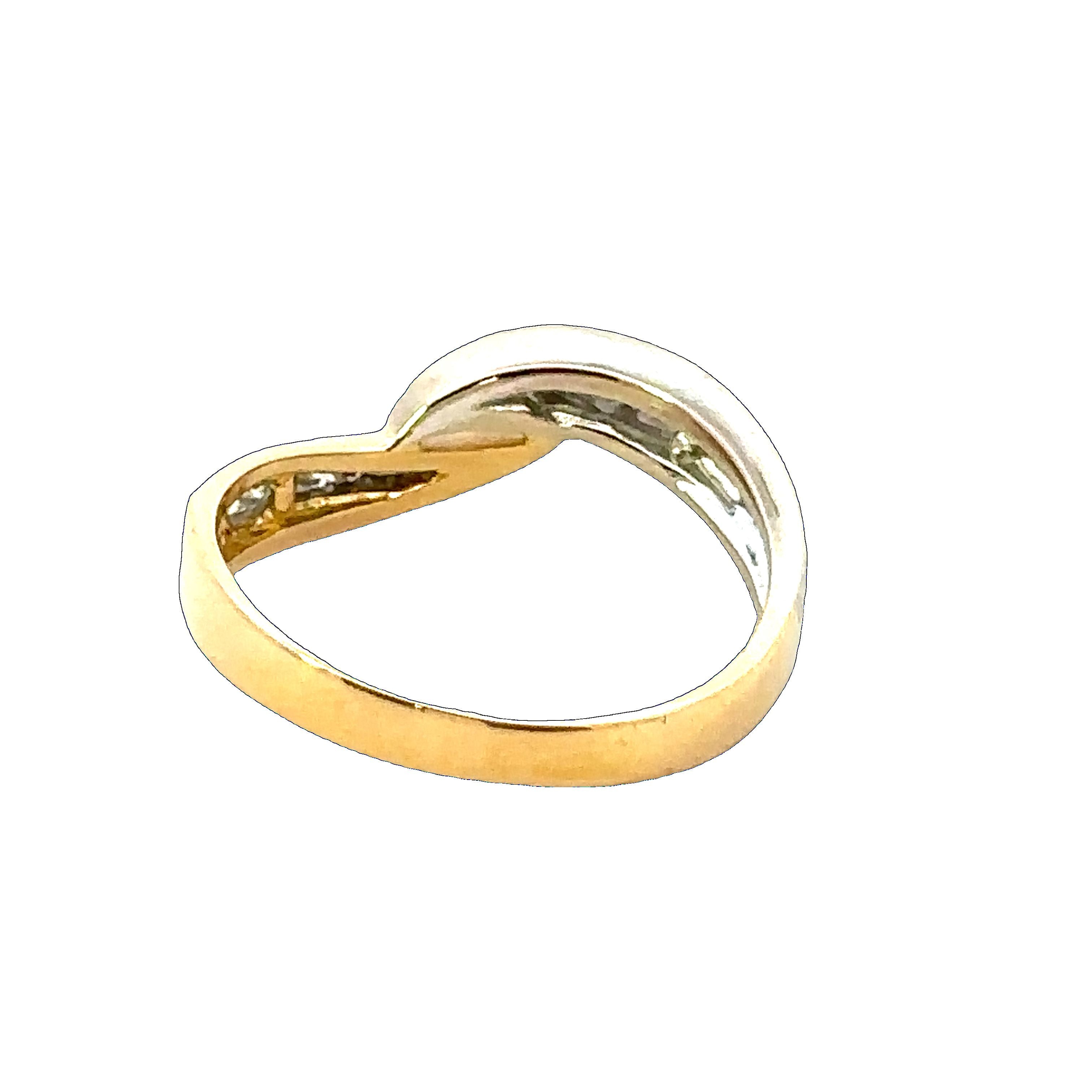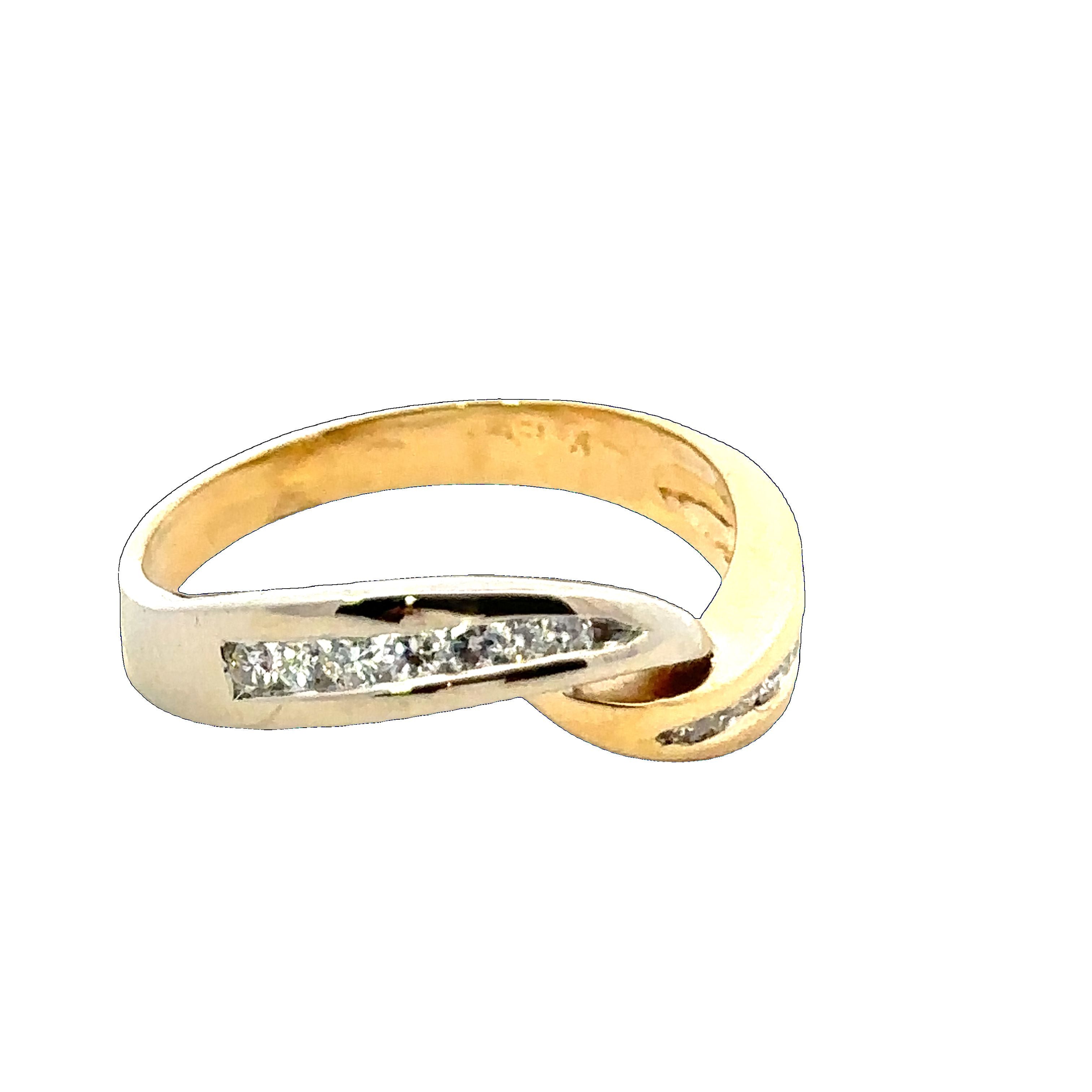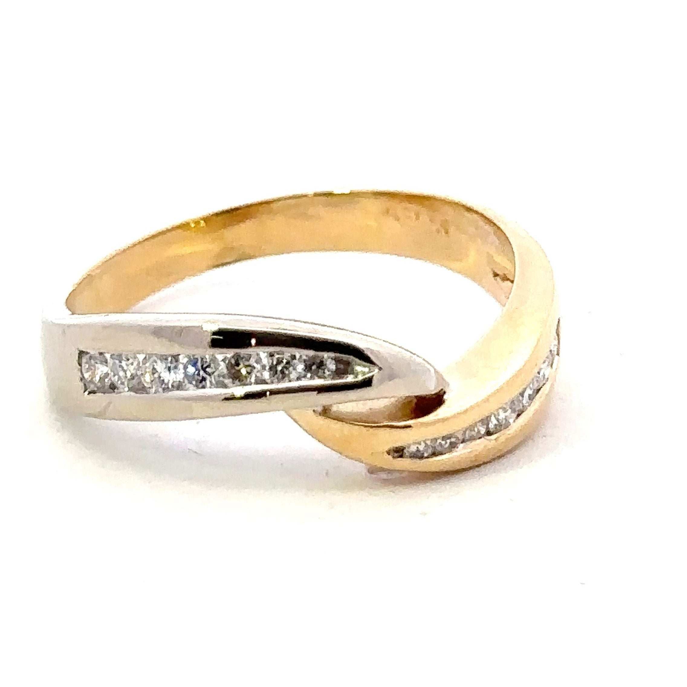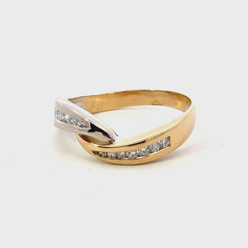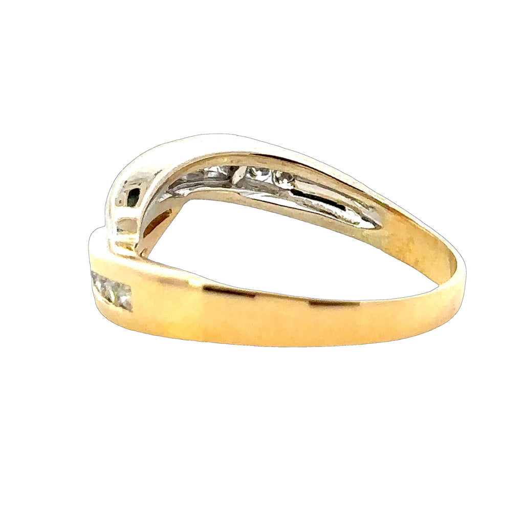This stunning ring features a captivating arrangement of 14 round brilliant cut diamonds, expertly channel-set in a pointed cross-over design atop a two-tone yellow gold band. The contrasting colours of yellow and white gold add a touch of sophistication to the overall aesthetic, creating a harmonious blend of elegance.