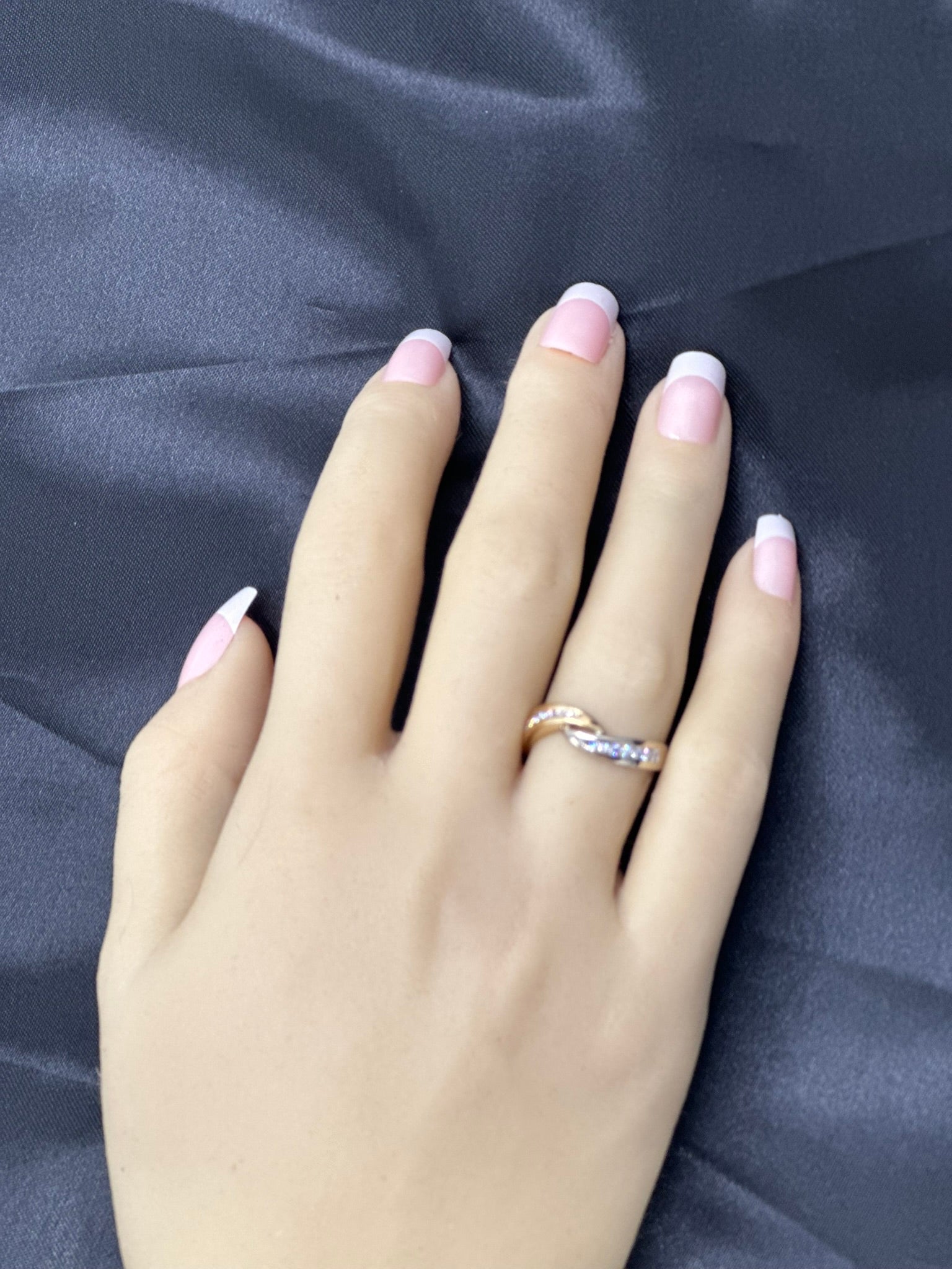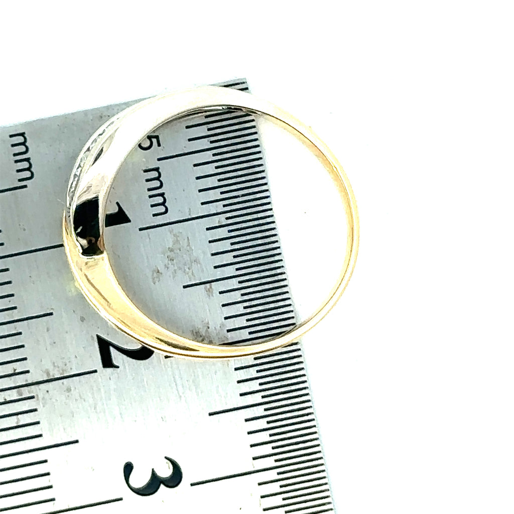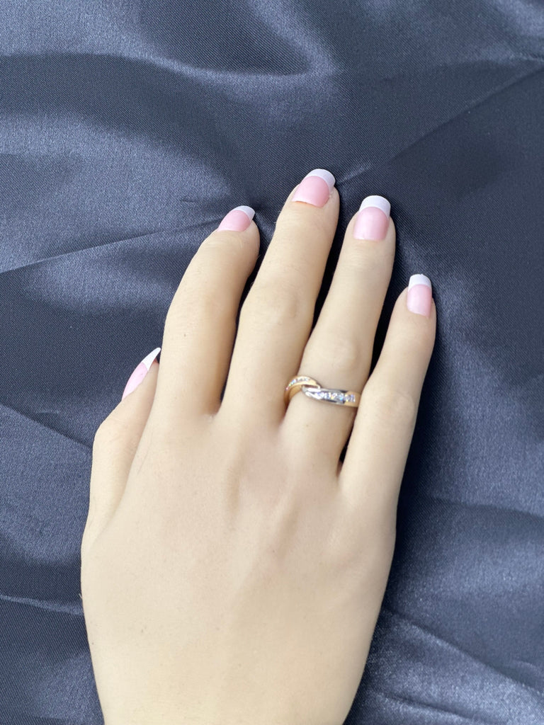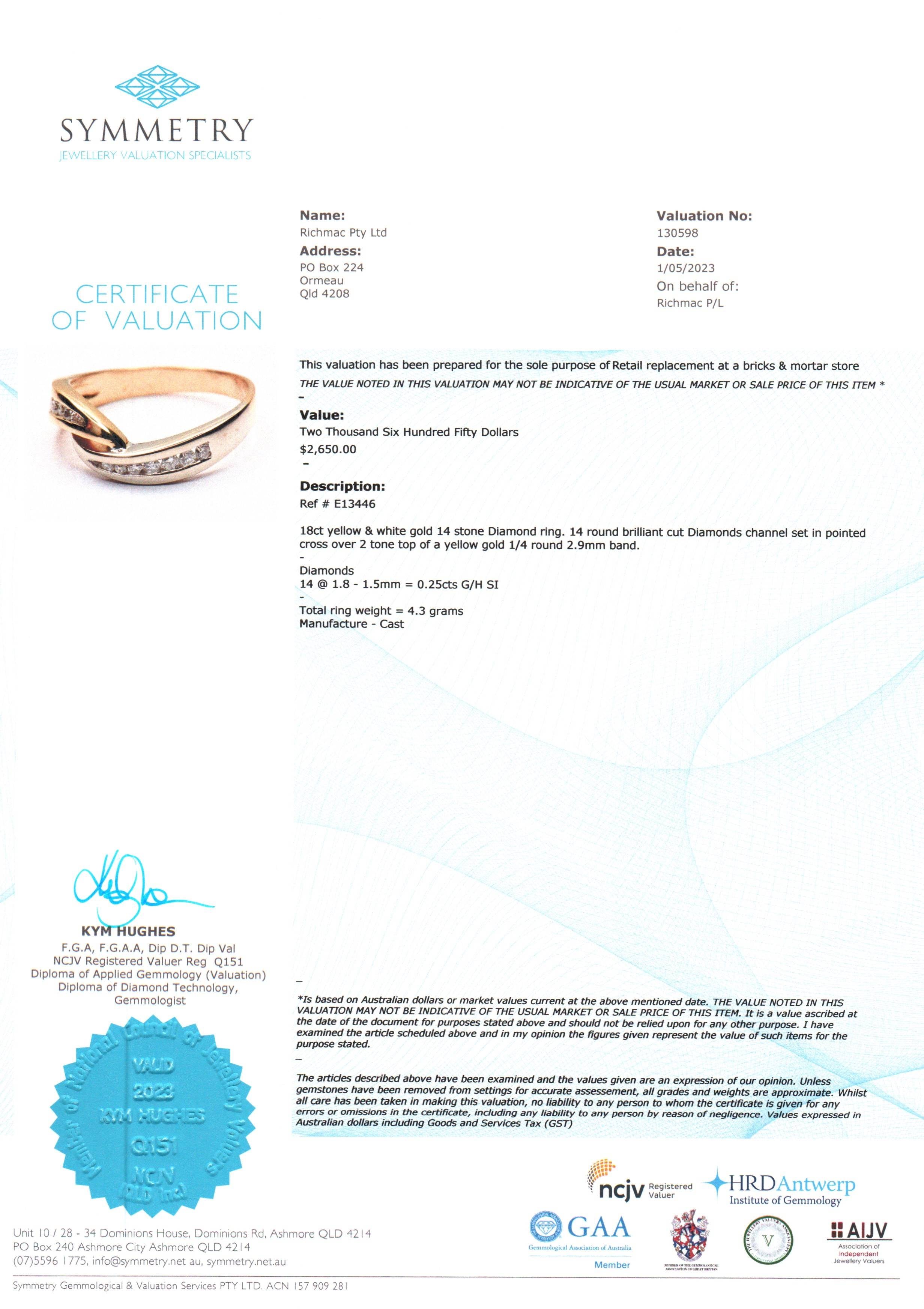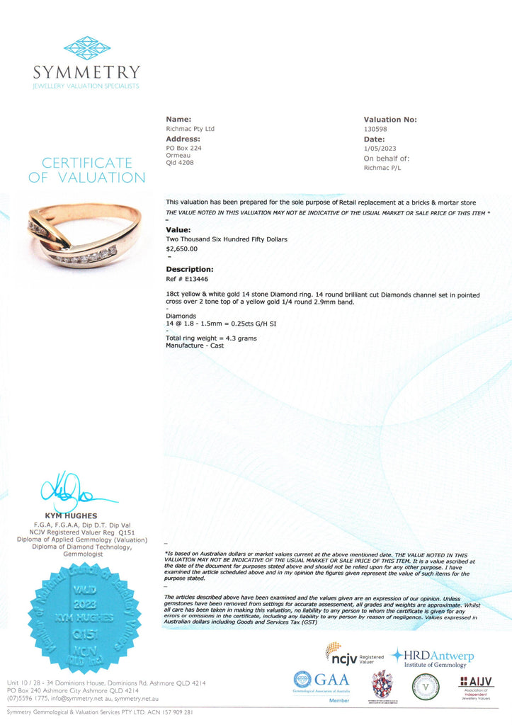 This stunning ring features a captivating arrangement of 14 round brilliant cut diamonds, expertly channel-set in a pointed cross-over design atop a two-tone yellow gold band. The contrasting colours of yellow and white gold add a touch of sophistication to the overall aesthetic, creating a harmonious blend of elegance.