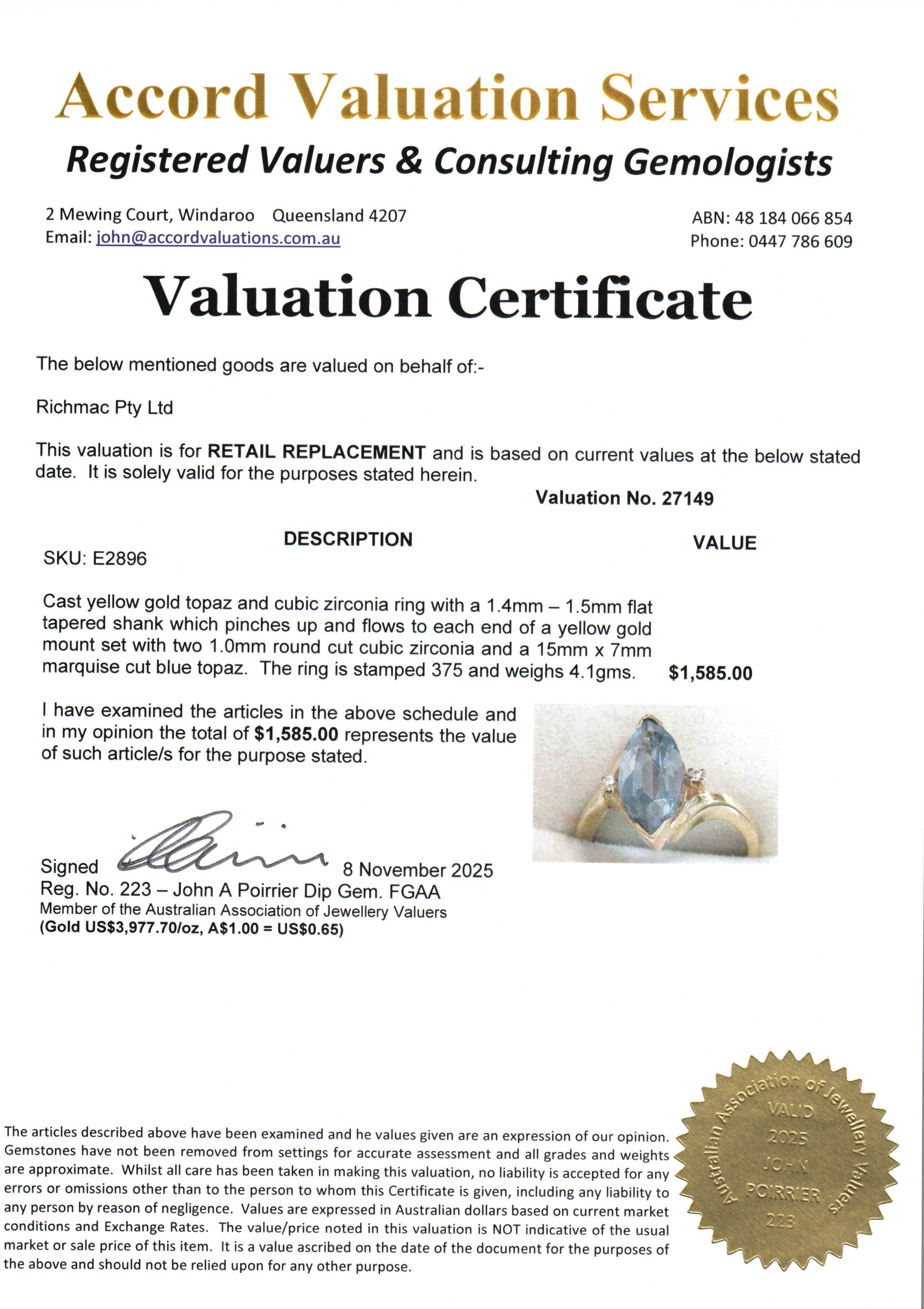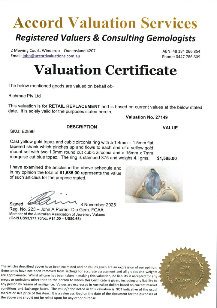 💎 Elegant 9ct Yellow Gold Blue Topaz & Cubic Zirconia Ring – Valuation $1585 💎