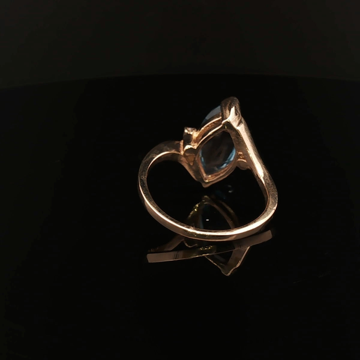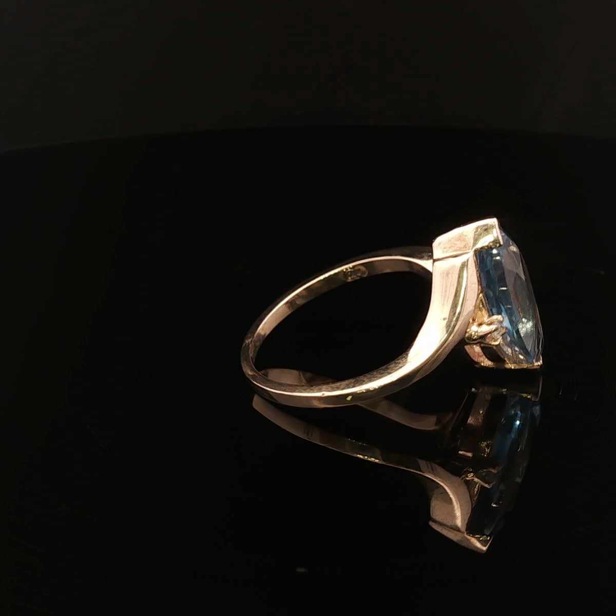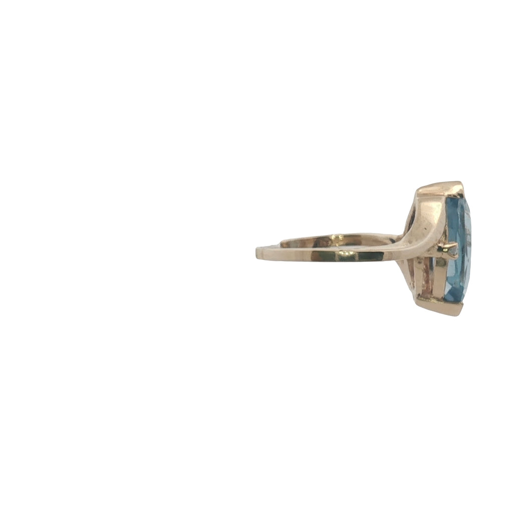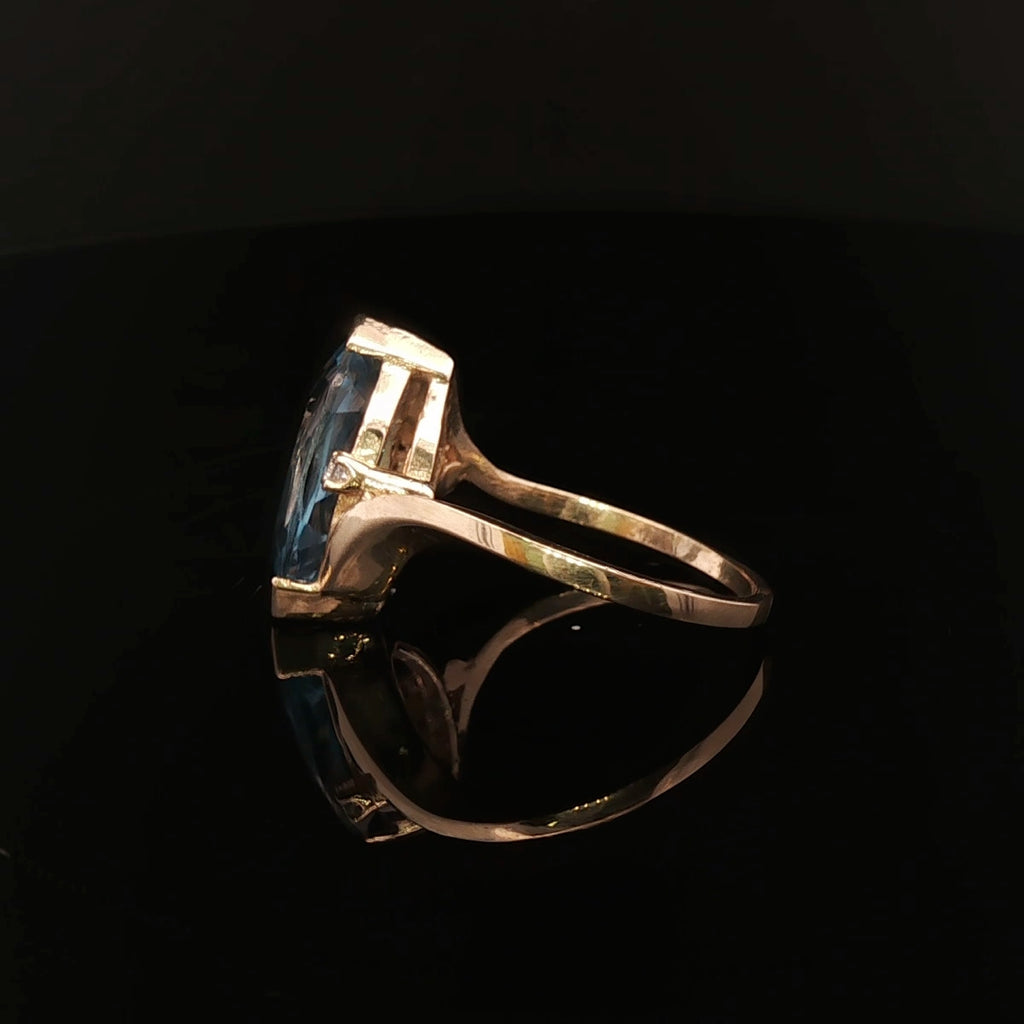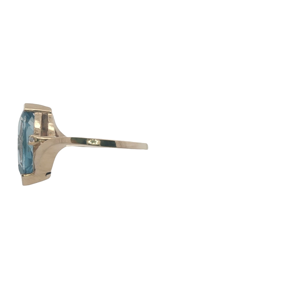 The ring has been cast in solid 9ct yellow gold, featuring a 1.4mm–1.5mm flat tapered shank that gracefully narrows to meet a yellow gold mount. The setting holds a beautifully cut 15mm × 7mm blue topaz accented by two 1.0mm round cubic zirconias on the shoulders. The contrast between the icy blue topaz and the sparkle of the CZs adds just the right amount of brilliance.
