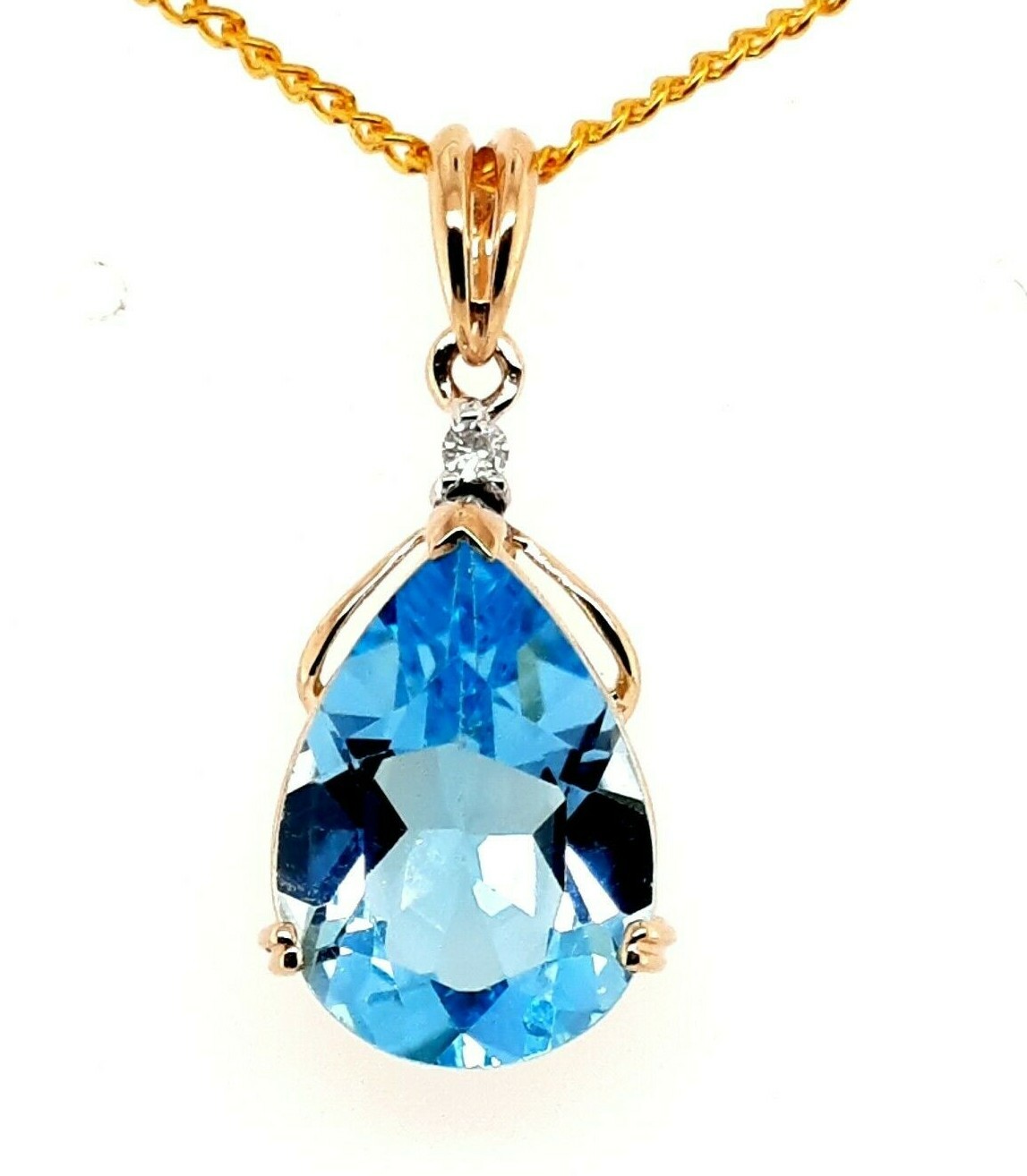 A beautiful 9ct yellow gold pendant featuring a pretty blue Topaz with a Diamond set above.
