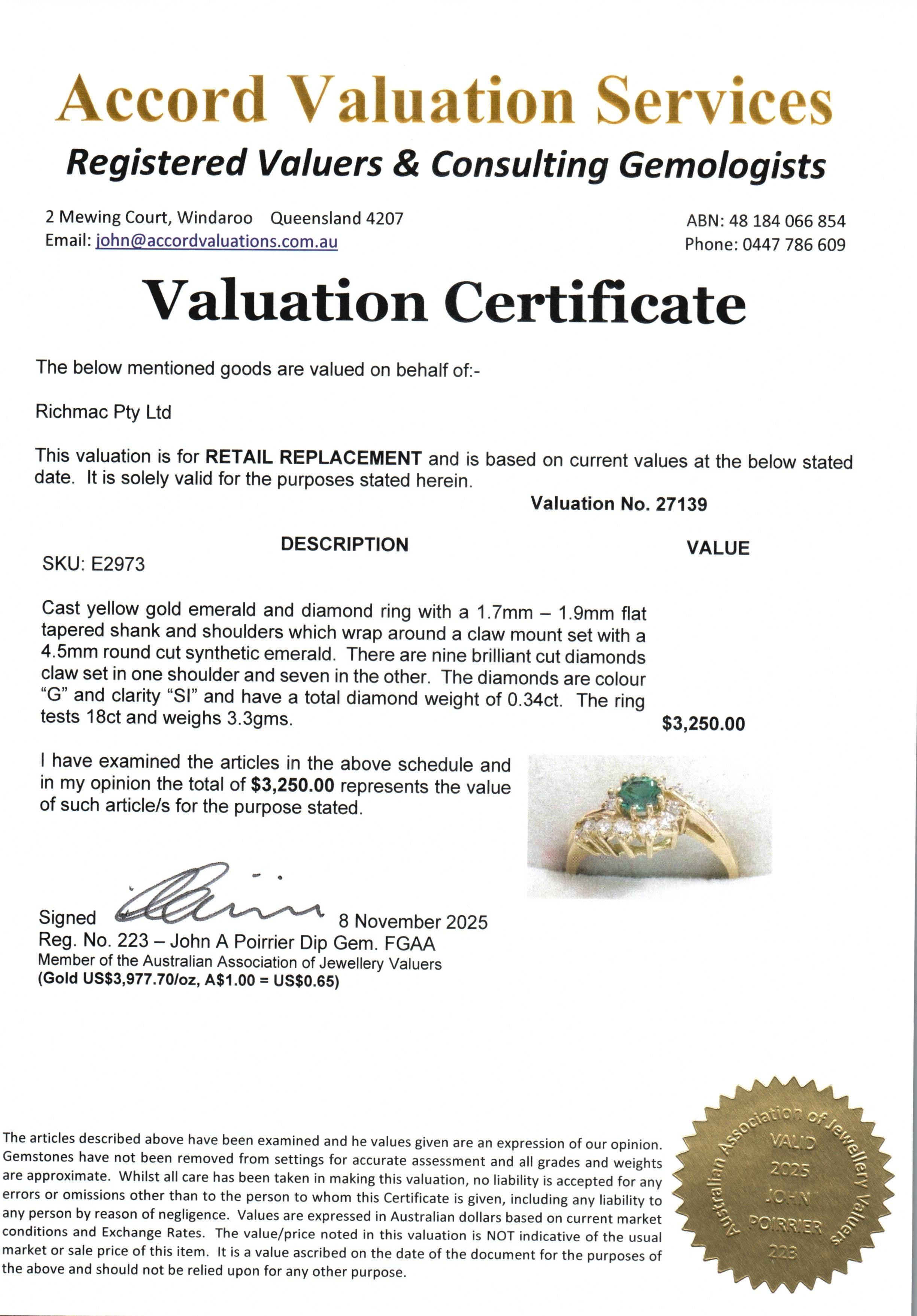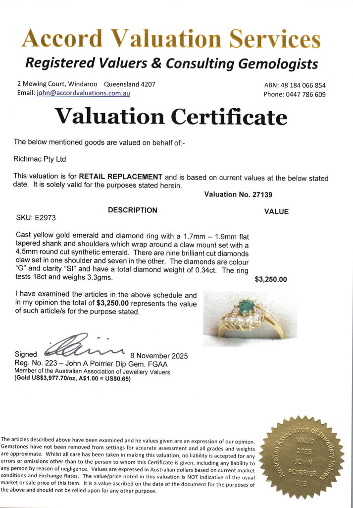 Weighing 3.3 grams, this ring has been tested as 18ct gold and is accompanied by an independent valuation certificate confirming an insurance replacement value of $3250.
