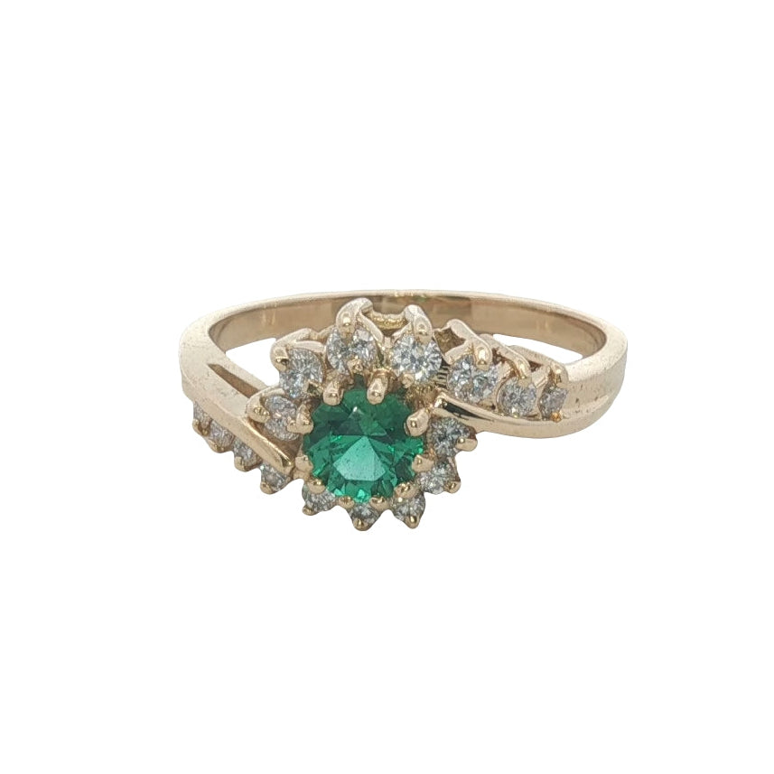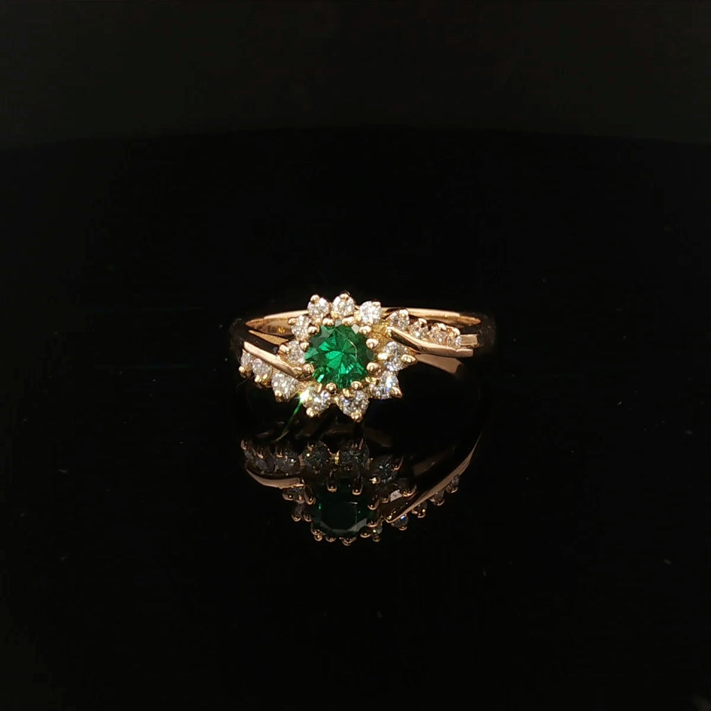 A stunning 18ct yellow gold ring featuring a radiant round-cut created emerald framed by a glittering arrangement of sixteen brilliant-cut diamonds. This exquisite piece exudes elegance and would make a beautiful engagement or wedding ring, or a cherished gift for someone special.