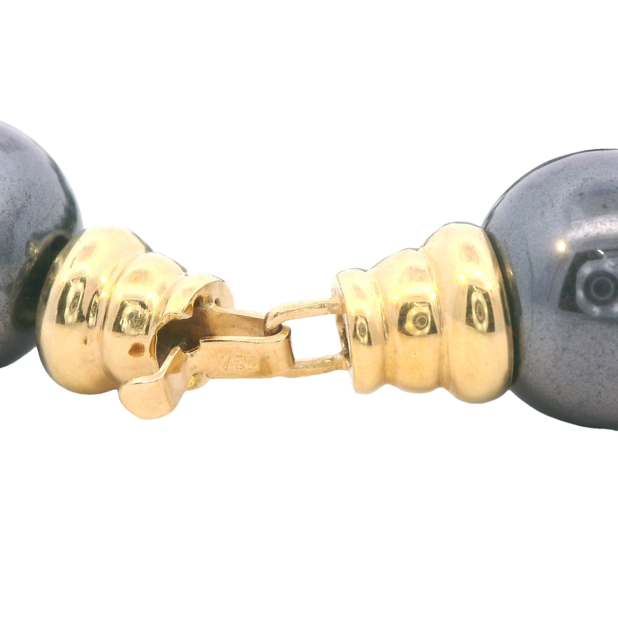 The necklace is finished with an 18ct yellow gold clasp, which adds a luxurious touch to the already stunning design. The contrast between the rich dark tones of the hematite and the warm glow of the yellow gold creates a truly timeless piece that is perfect for any occasion. Whether worn casually or for a more formal event, this necklace is sure to make a statement.