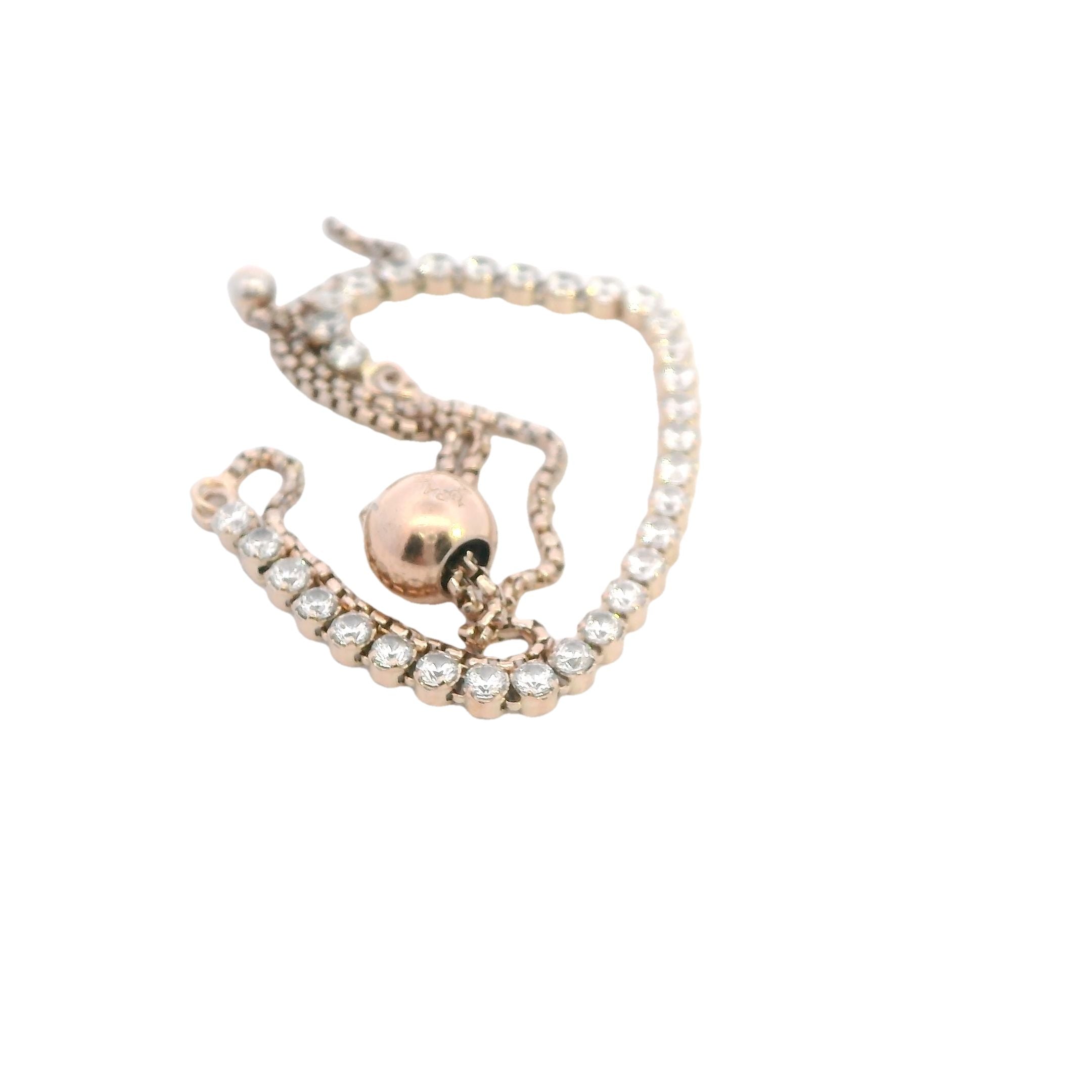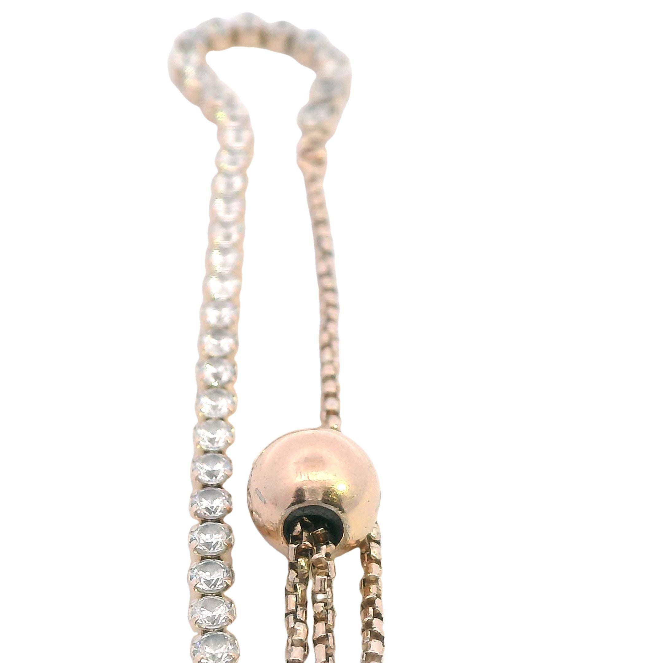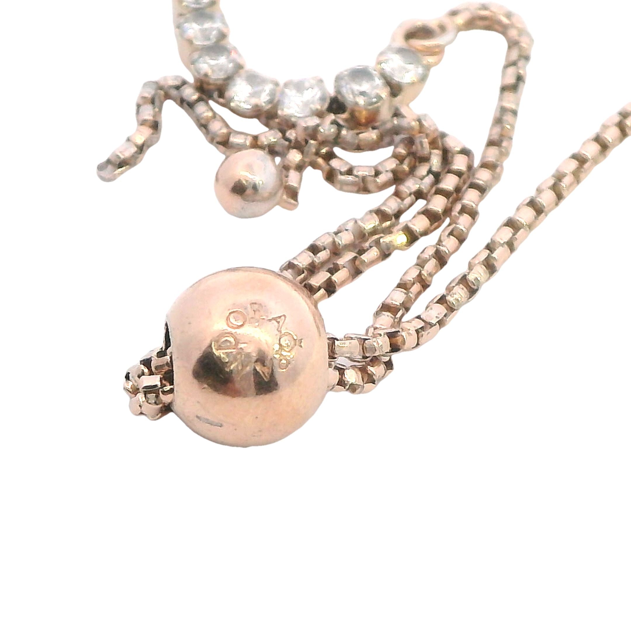 A stunning Pandora sparkling slider tennis bracelet, rose gold plated and adorned with cubic zirconias. Measures 33cm in length and weighs 2.41gms, offering a touch of elegance and shine.