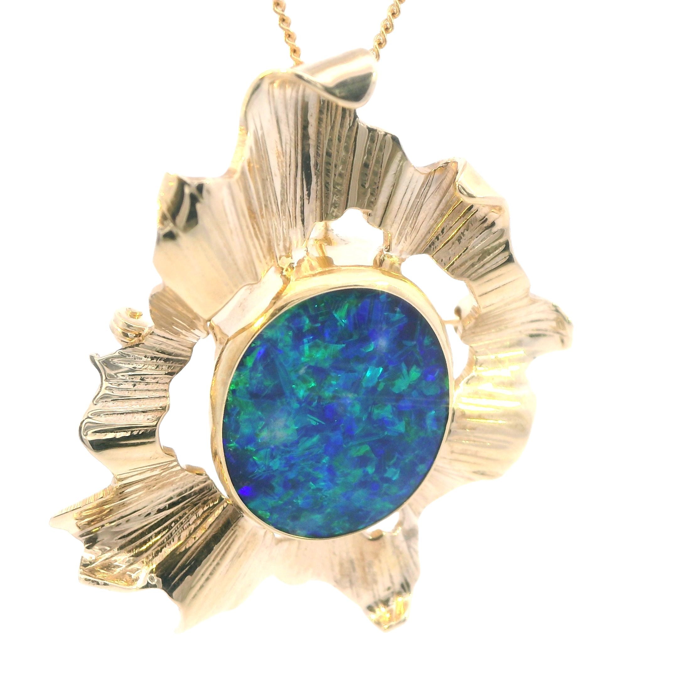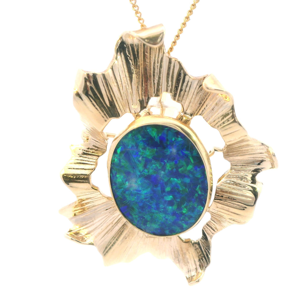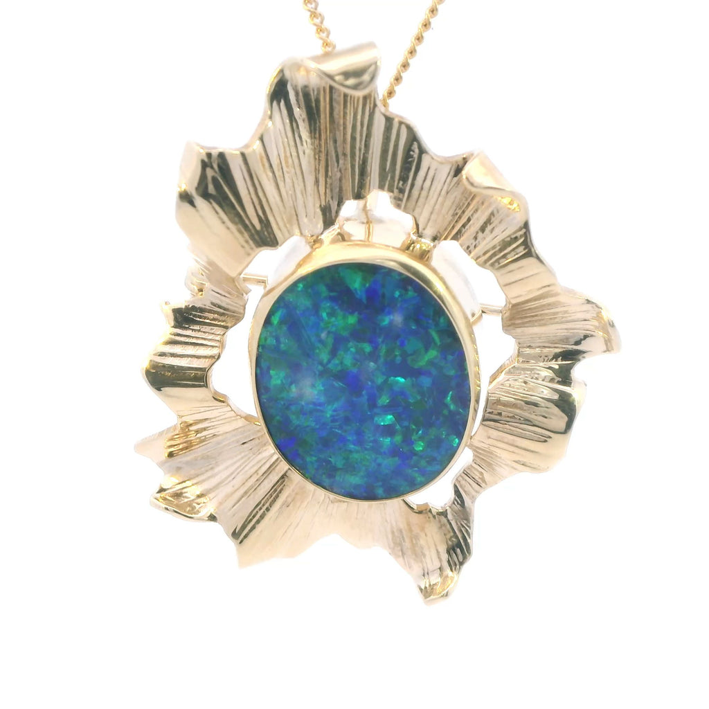 This exquisite yellow gold opal pendant, which can also be worn as a brooch, is a true masterpiece of elegance and versatility. Crafted with care and precision, this cast and assembled piece offers the flexibility to be worn in two ways—either as a statement pendant or a beautiful brooch—allowing you to adapt it to any occasion or style.