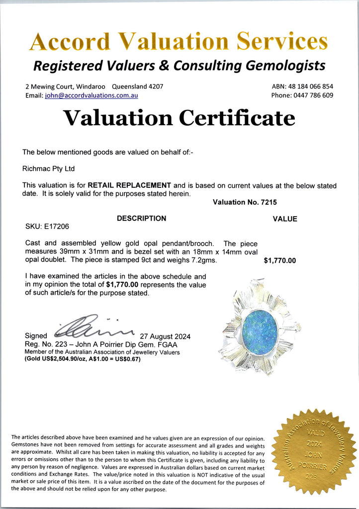 The opal is securely bezel set, framed in luxurious 9ct yellow gold, which complements the vibrant colors of the gemstone. The pendant/brooch measures 39mm x 31mm, offering a bold yet elegant size that ensures it stands out whether worn on a chain or pinned to clothing. The piece is stamped 9ct, certifying the quality of the gold, and weighs 7.2gms, making it lightweight yet durable for everyday wear or special occasions.