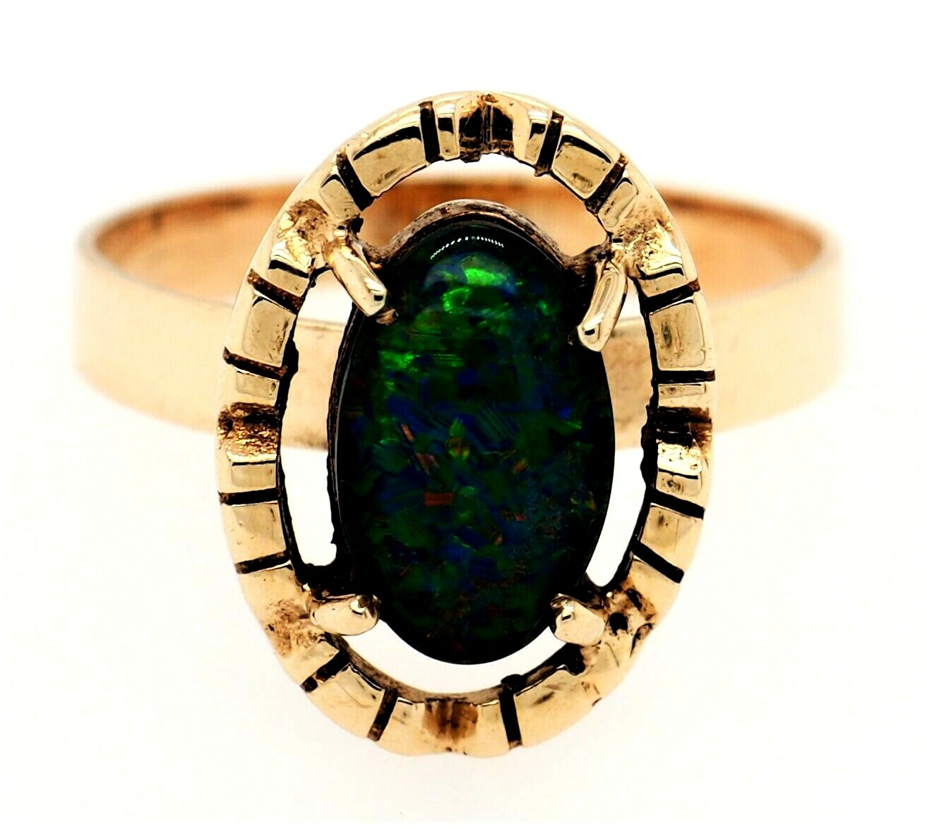 A stunning ring featuring a striking Opal Triplet with gorgeous flashes of blue, green and orange on a 9ct yellow gold band and surround.