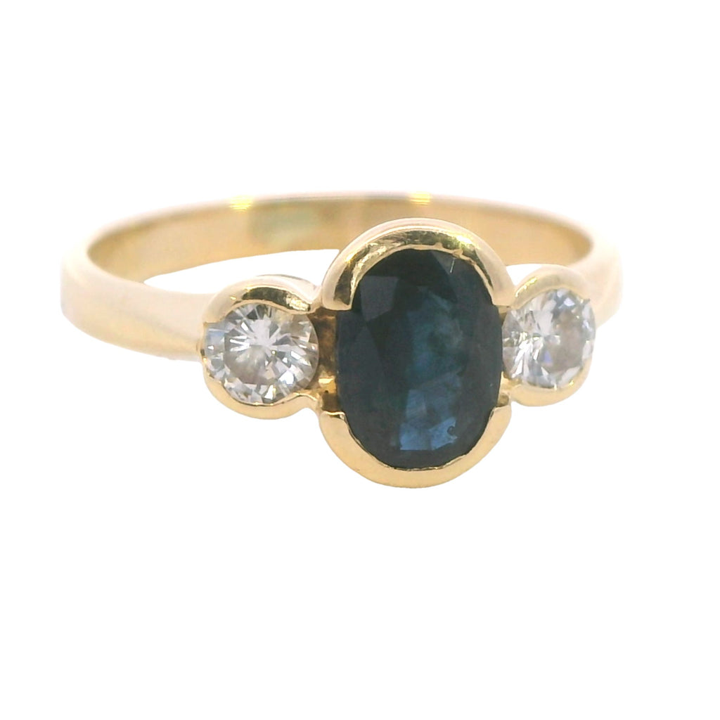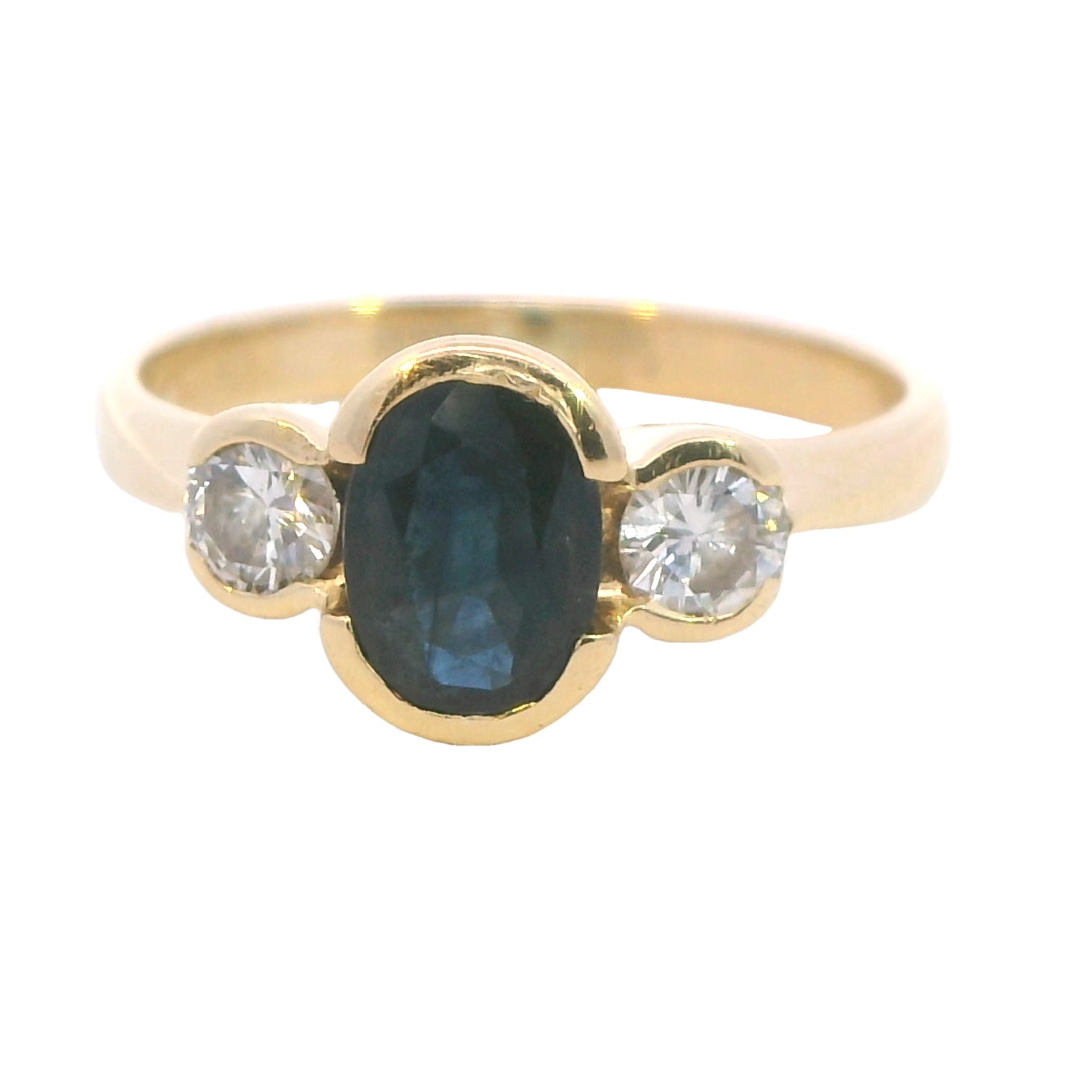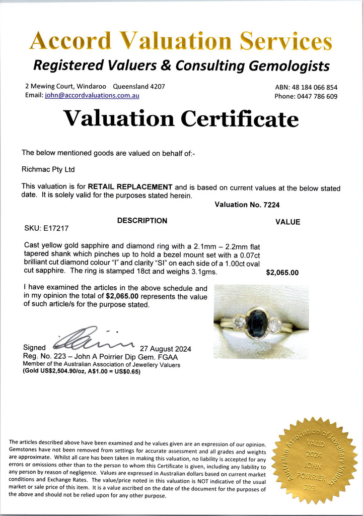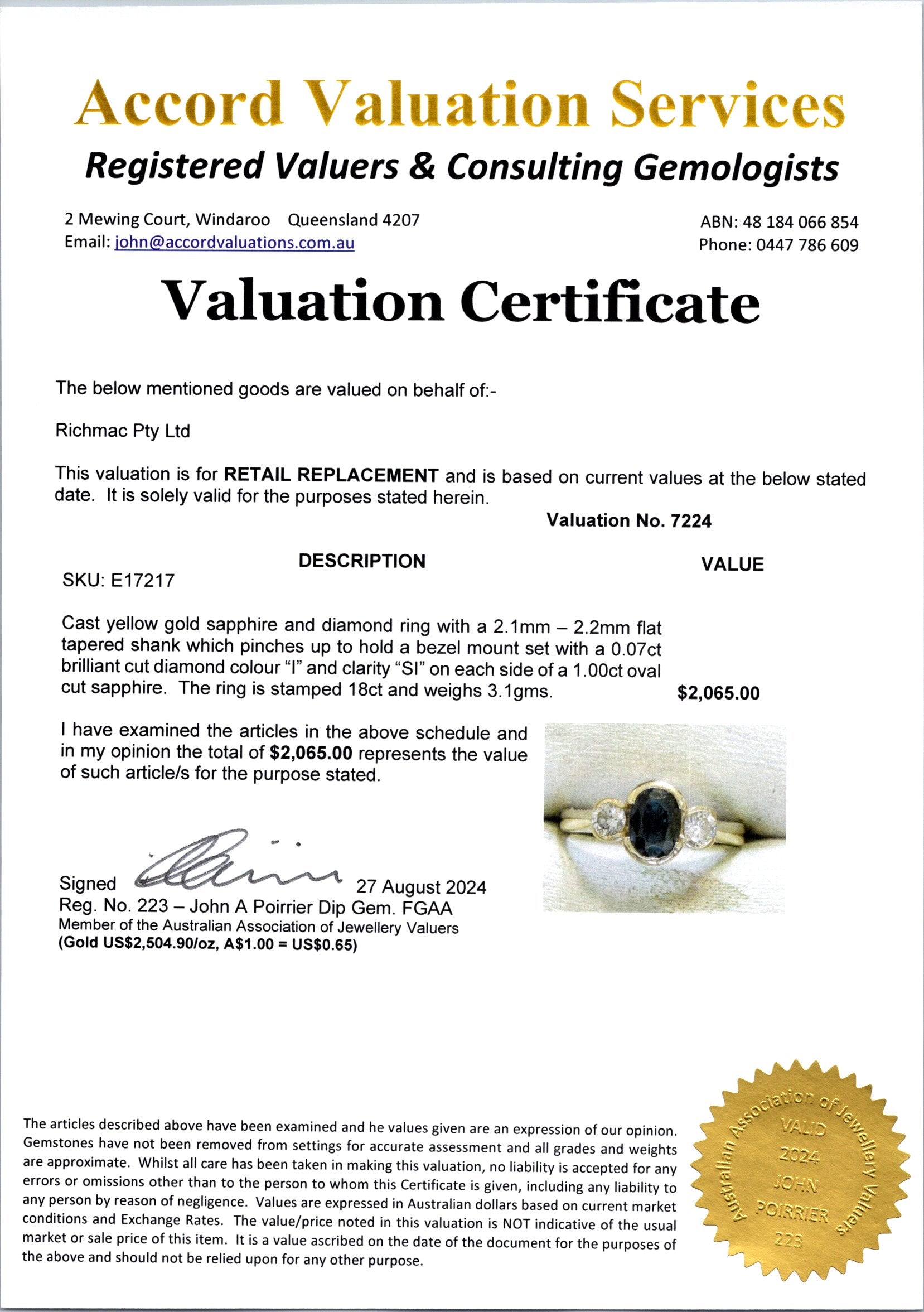 - Gemstones: 1.00ct Oval-Cut Sapphire, 2 x 0.07ct Brilliant-Cut Diamonds