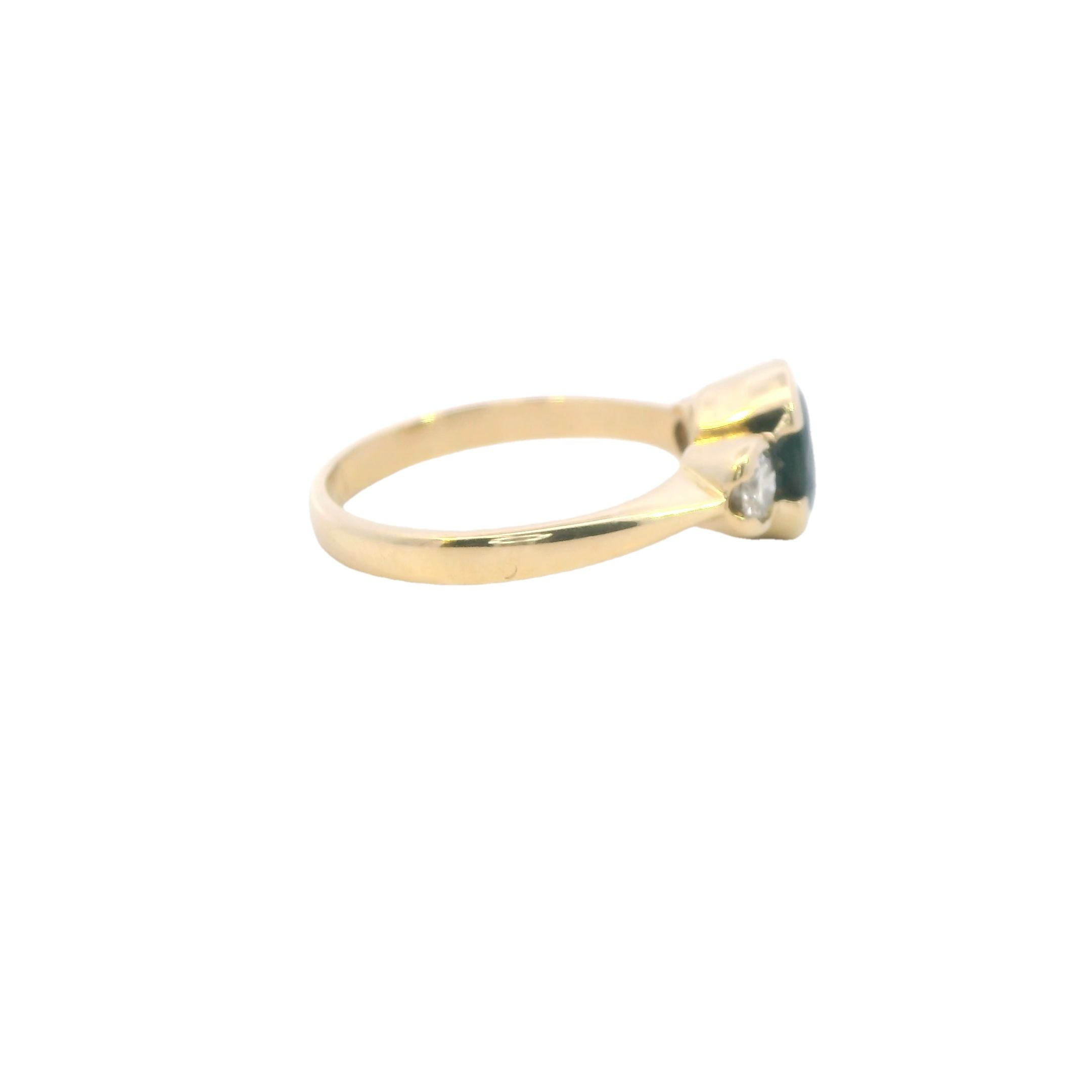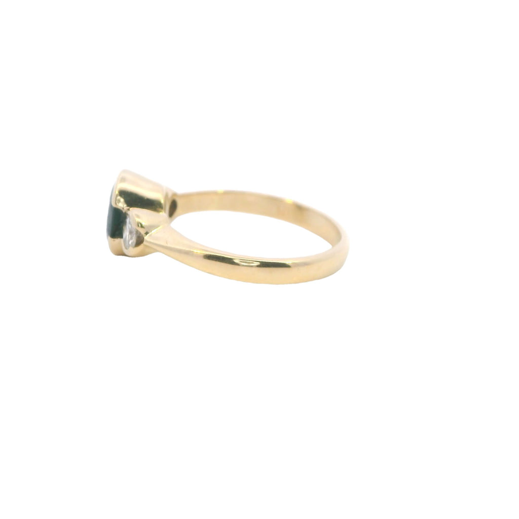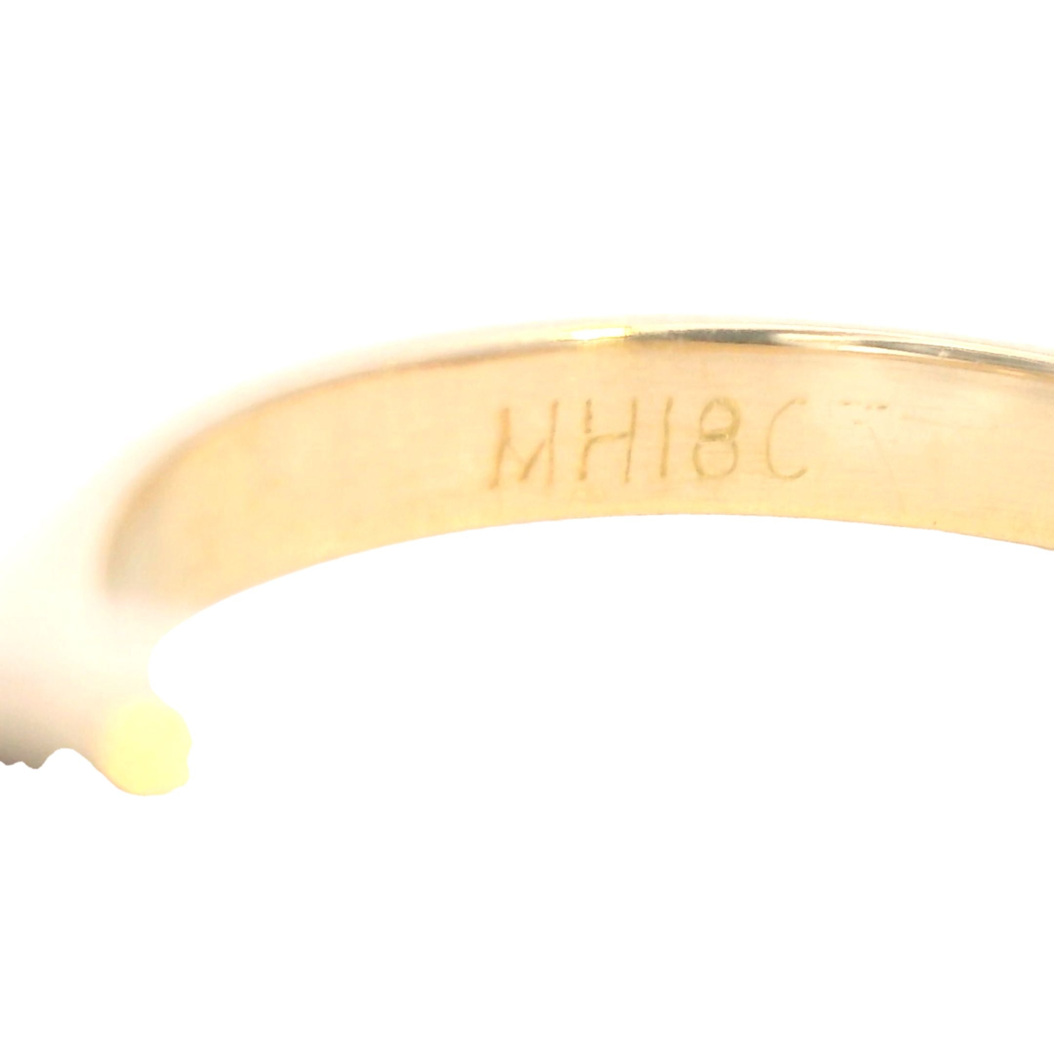 The ring's 2.1mm - 2.2mm flat tapered shank gently pinches up to hold the bezel-set stones, creating a sleek and elegant profile. Stamped 18ct, this ring weighs 3.1gms, providing a comfortable yet substantial feel on the finger.