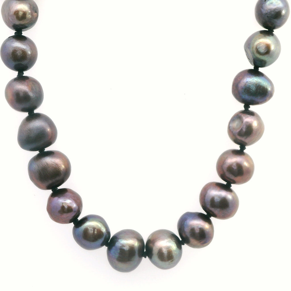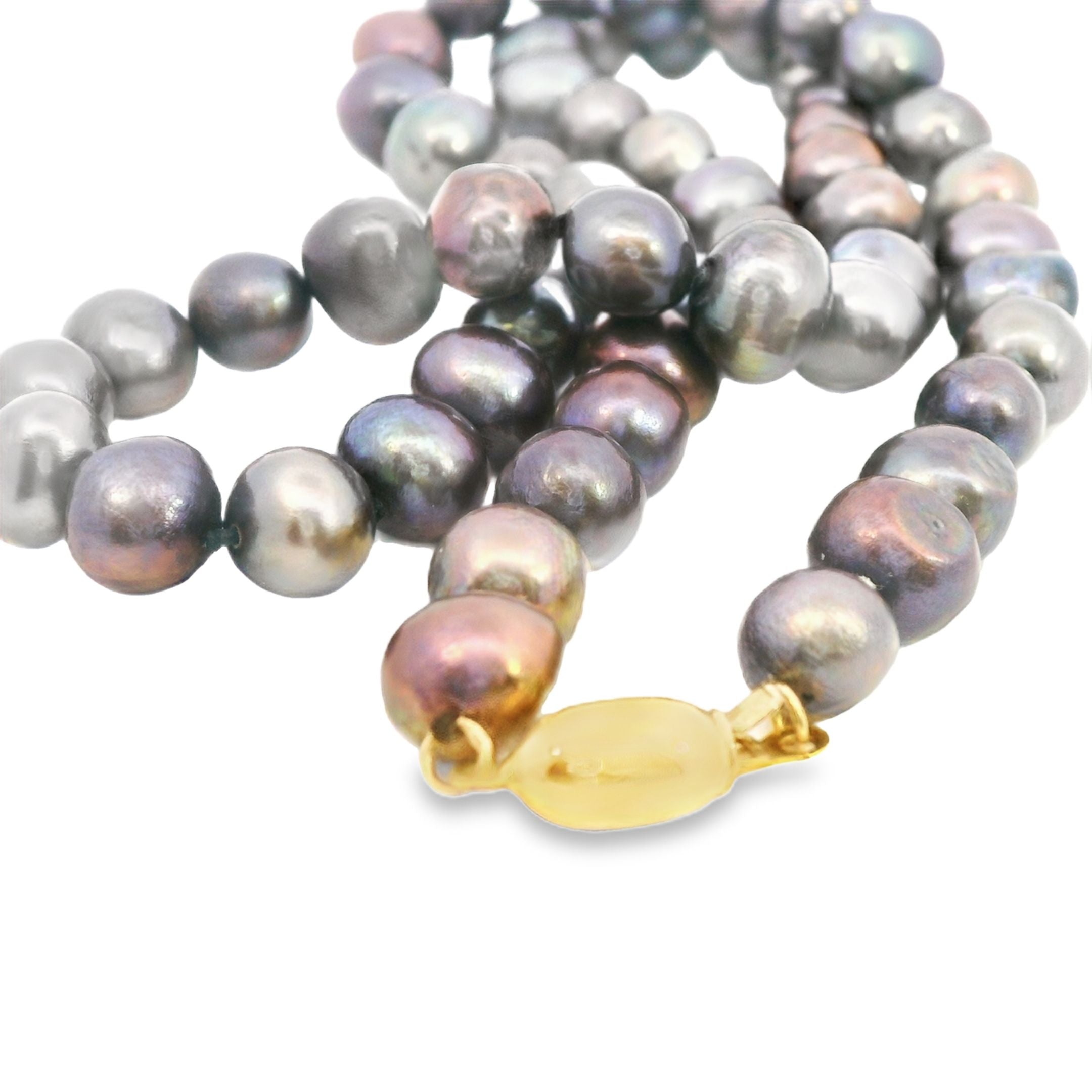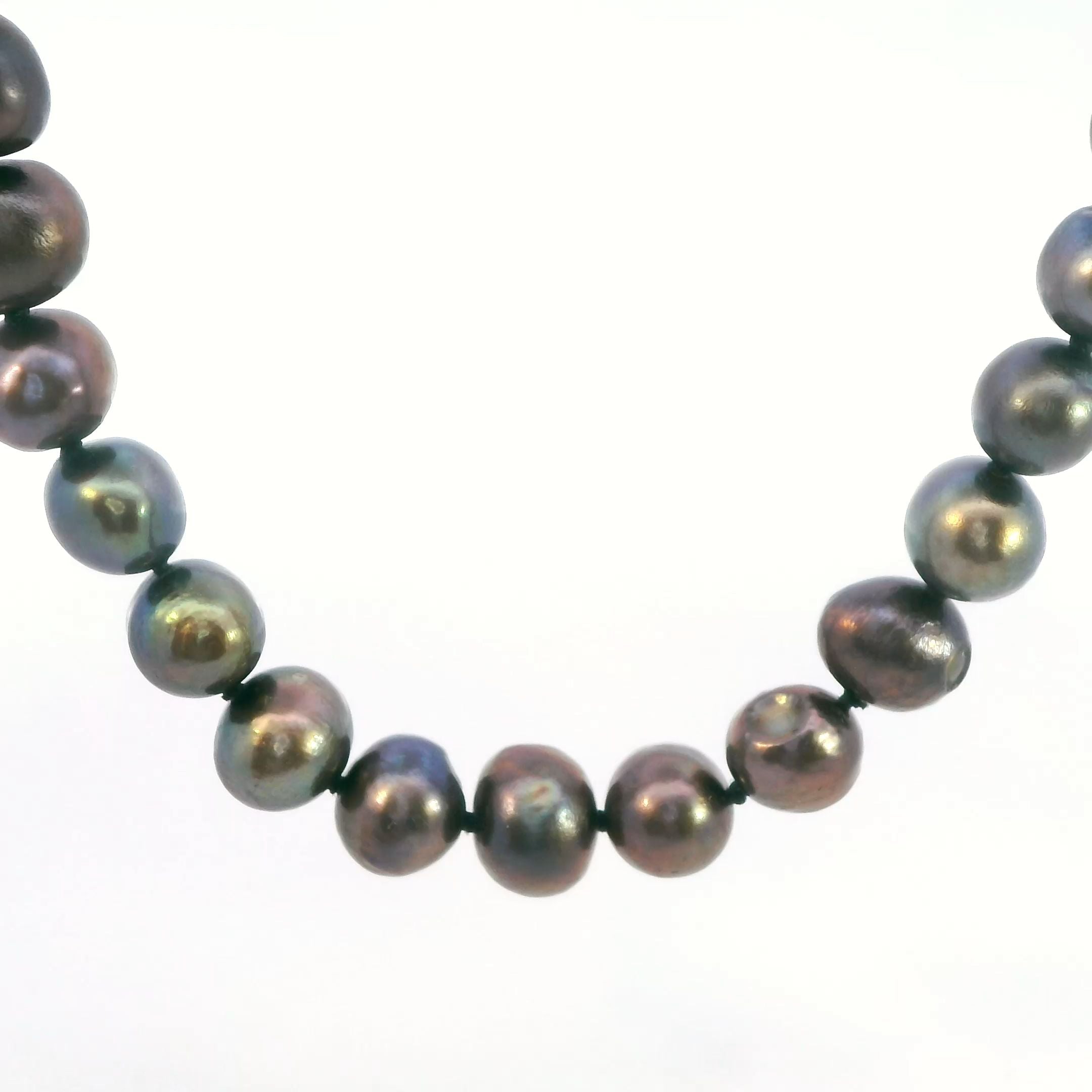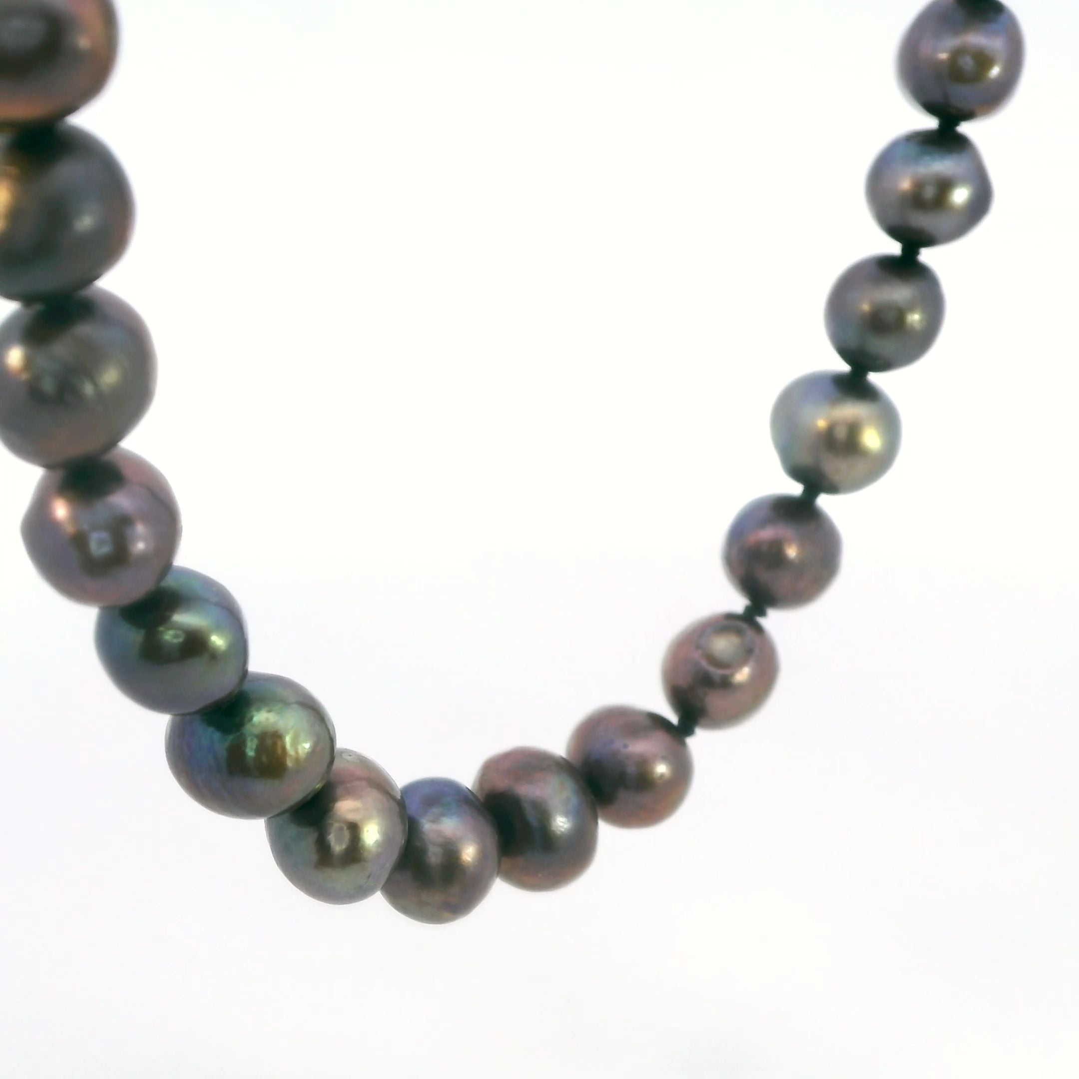 This strand of black cultured freshwater pearls is a timeless piece, perfect for those who appreciate the beauty of nature and the elegance of pearls. Whether worn for formal events or to elevate everyday attire, this necklace adds an air of mystery and sophistication to any ensemble.