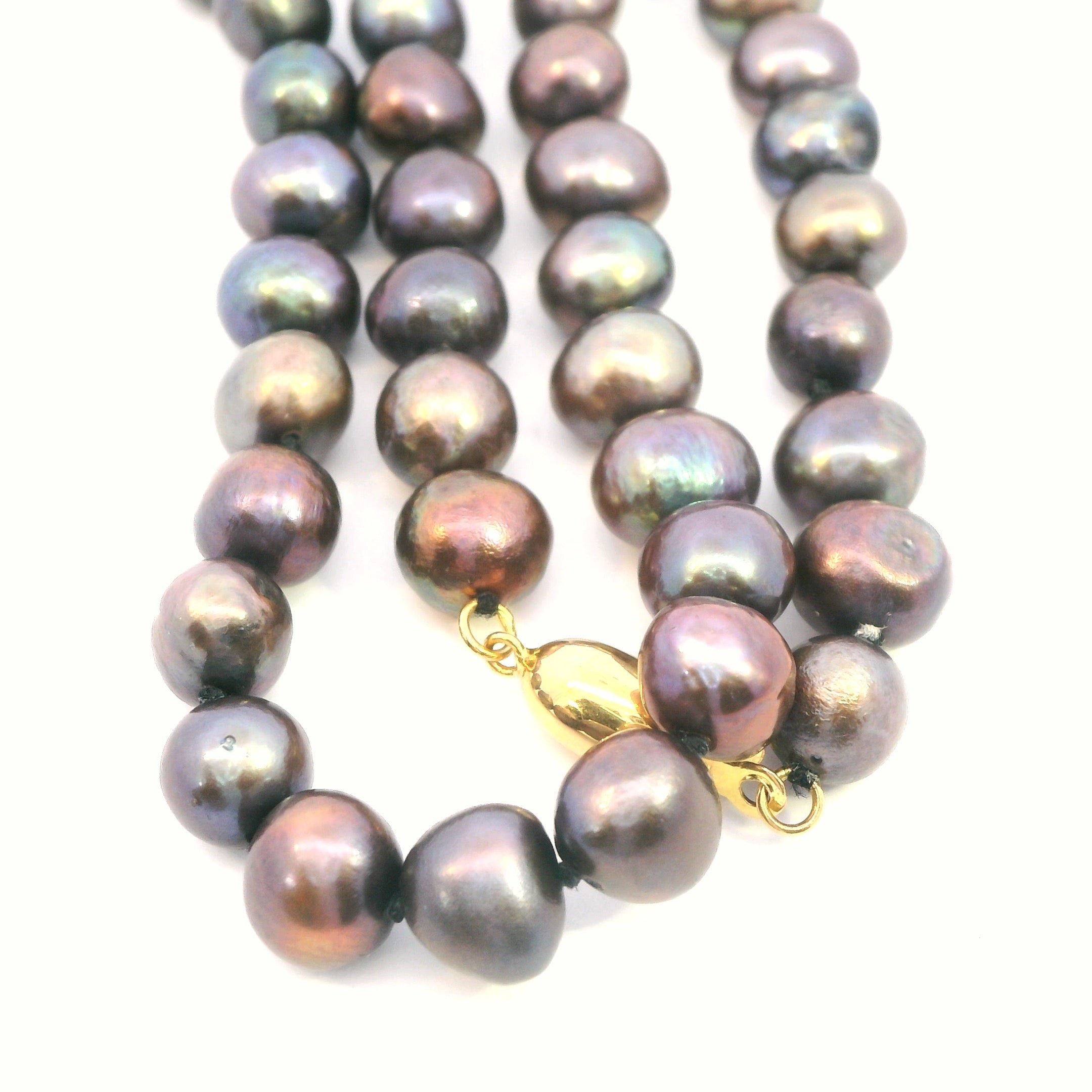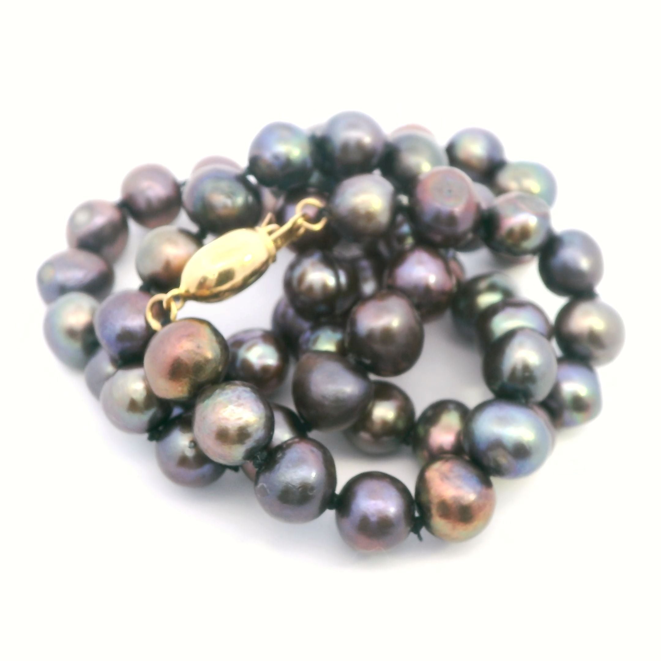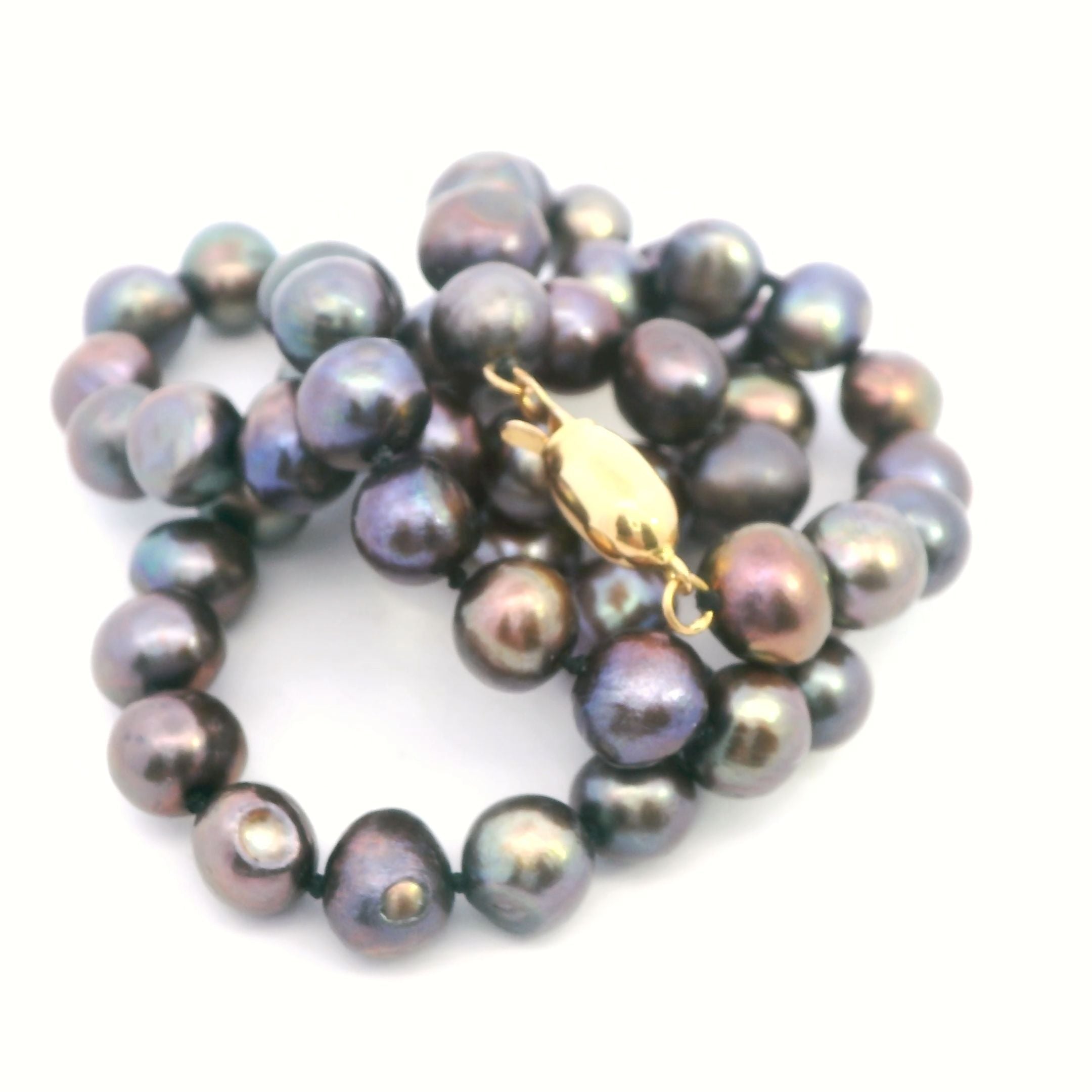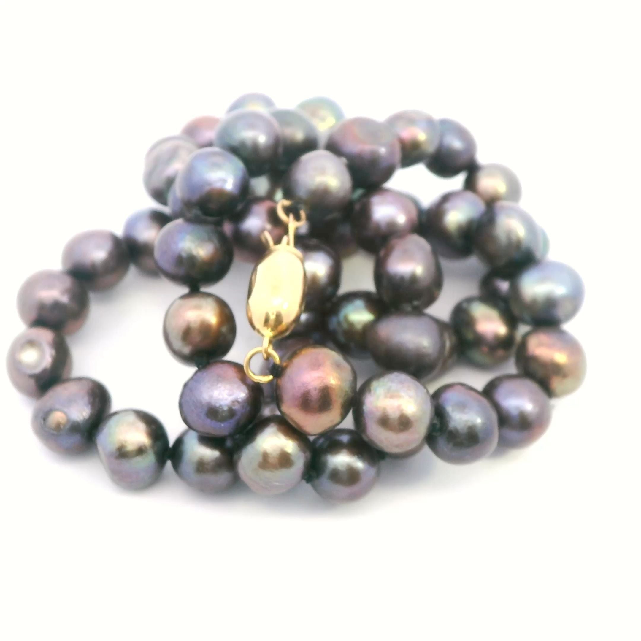 This exquisite strand of dyed off-round cultured freshwater pearls showcases the deep and captivating beauty of black pearls. Known for their mysterious and alluring tones, these pearls make a bold statement, blending sophistication with a touch of exotic charm. Each pearl in this strand has been carefully selected, with its own unique character and beauty.
