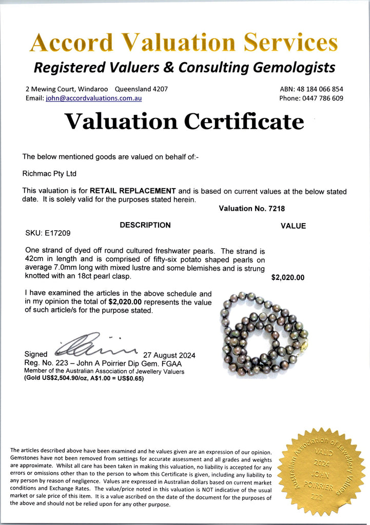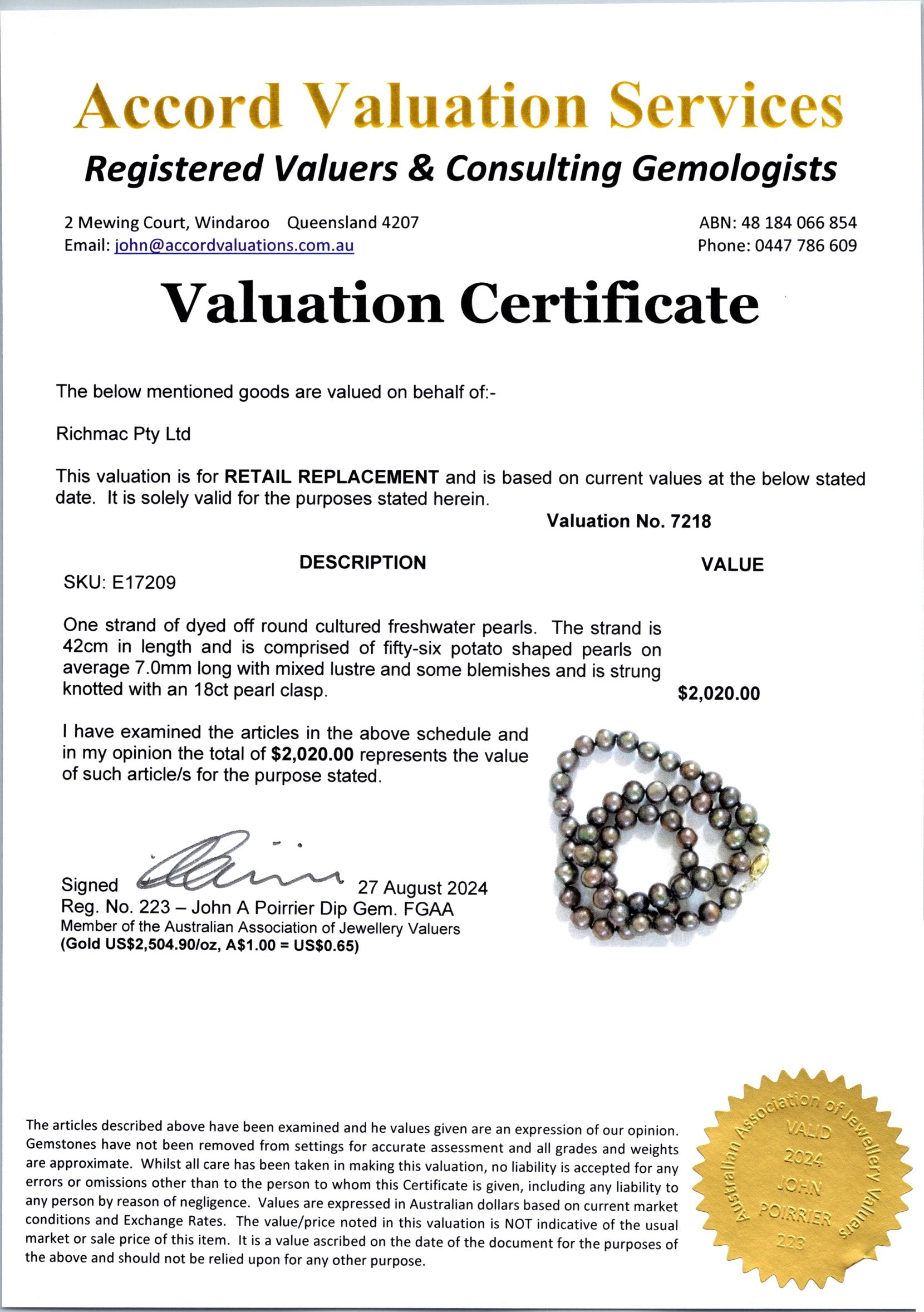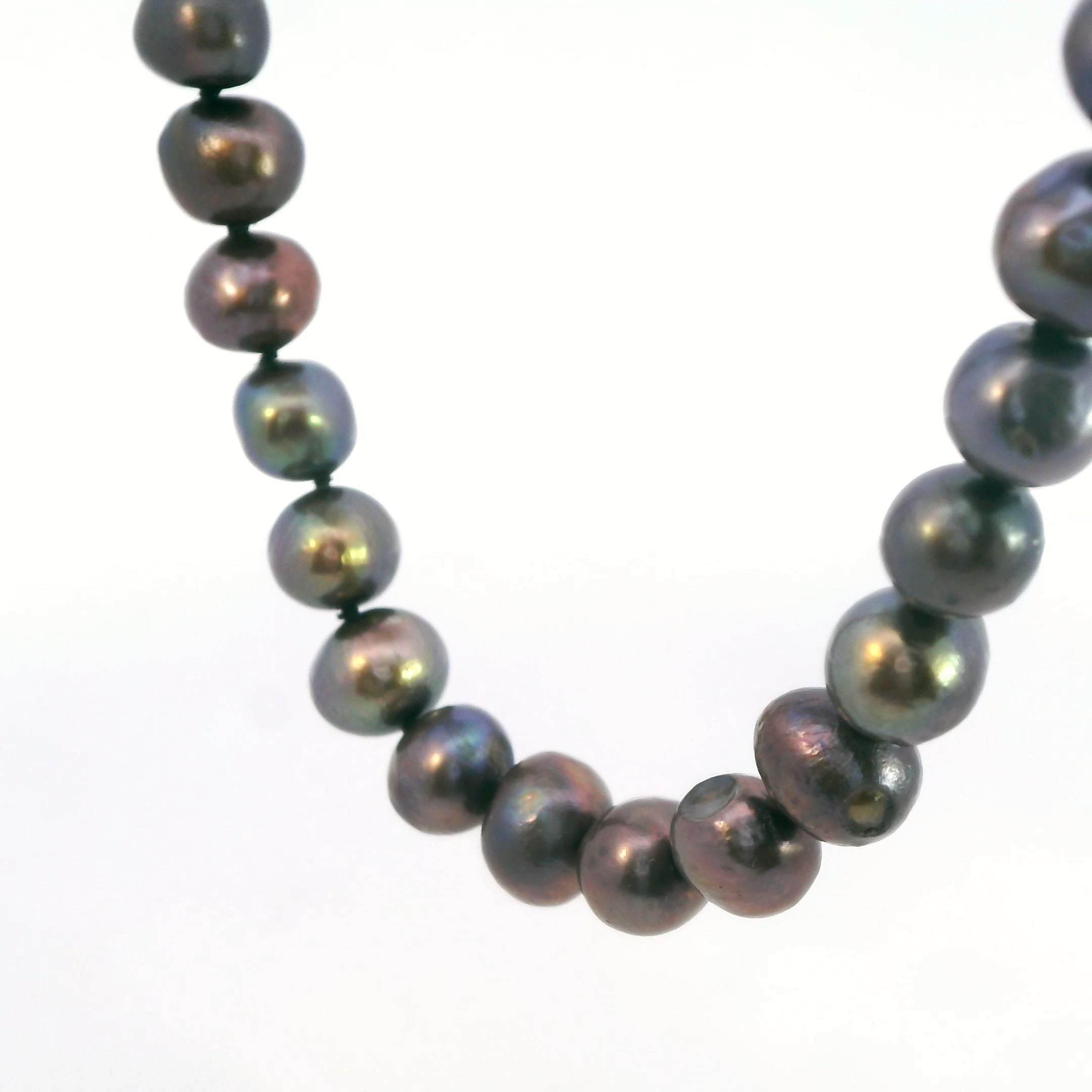 The strand measures 42cm in length and is comprised of fifty-six potato-shaped pearls, each averaging 7.0mm in length. These pearls exhibit a mixed luster, providing a natural and organic feel, while some minor blemishes add to their authenticity and charm. The deep black hue of the pearls creates a striking contrast against the skin, making this necklace an eye-catching accessory for any occasion.