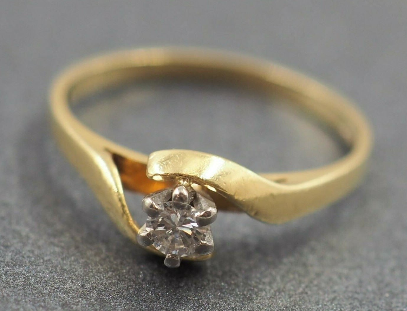 18ct yellow & white gold single stone Diamond ring. Round brilliant cut Diamond white gold 6 claw set with pointed cross over swept up shoulders on a flat 1.41mm band.