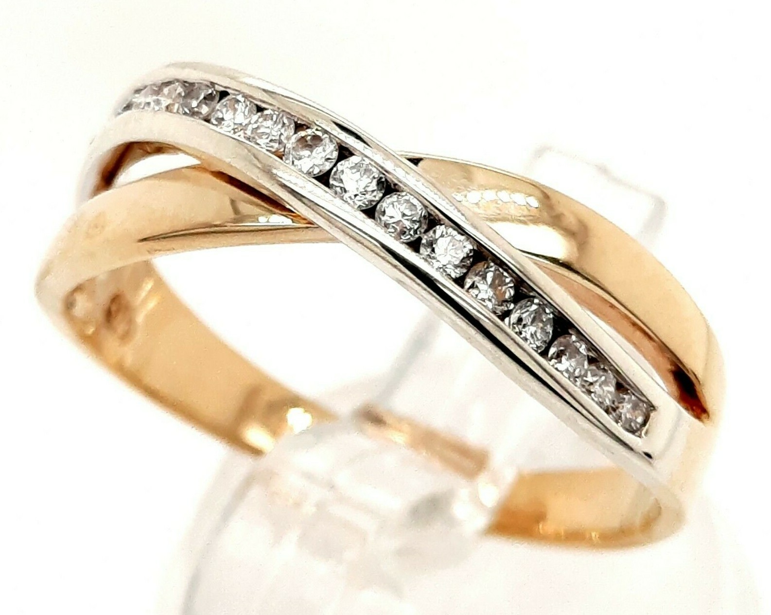 This item is a gorgeous Michael Hill ring featuring a 9ct yellow gold band with a yellow & white gold cross over front set with 17 Diamonds along the white gold cross over. This beautiful ring has a classic style and exudes timeless elegance. The ring will make a sublime wedding ring and is sure to be admired.