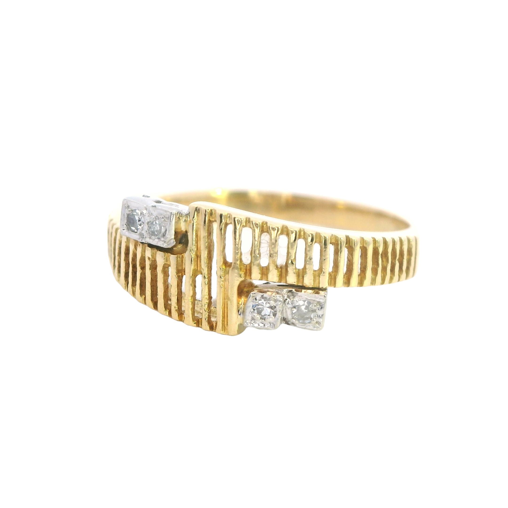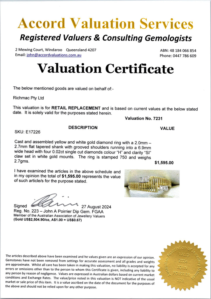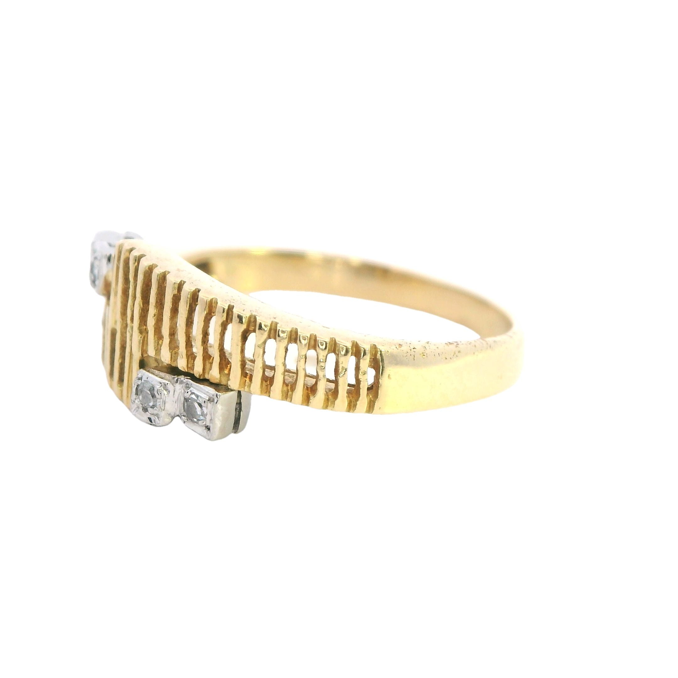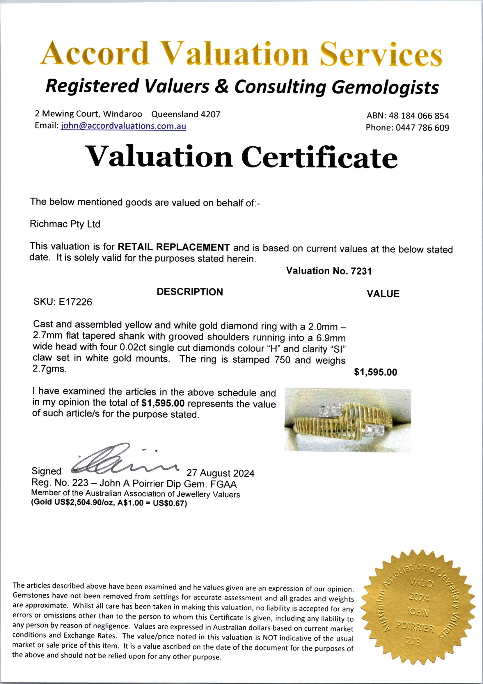Crafted from 18ct yellow and white gold, this ring features a flat tapered shank measuring 2.0mm - 2.7mm, offering both comfort and durability. The grooved shoulders flow effortlessly into a 6.9mm wide head, creating a sophisticated, modern look. The head of the ring is adorned with four 0.02ct single-cut diamonds, each claw set in a white gold mount. The diamonds, graded as colour "H" and clarity "SI," add just the right amount of sparkle to this classic piece.
