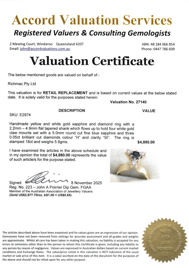 Meticulously handcrafted, the ring features a 2.2mm–4.9mm flat tapered shank that gracefully flows upward to four white gold claw mounts. The centre stone is a 5.0mm round-cut fine blue sapphire, complemented by three 0.05ct diamonds (colour “H”, clarity “SI”) that enhance its brilliance and sophistication.