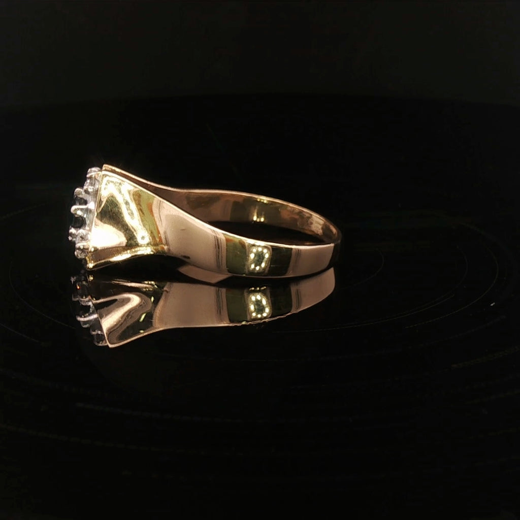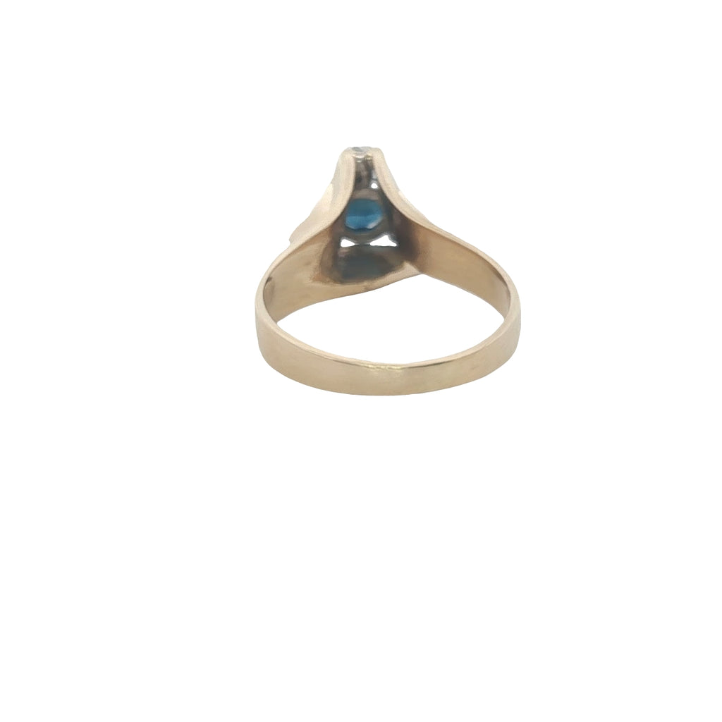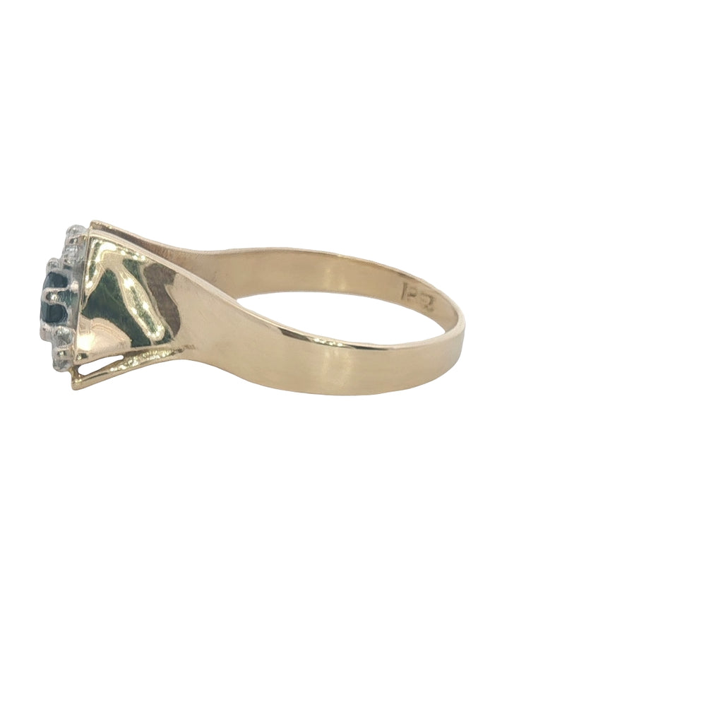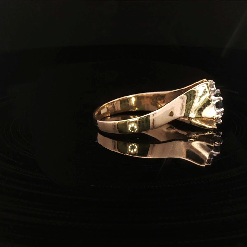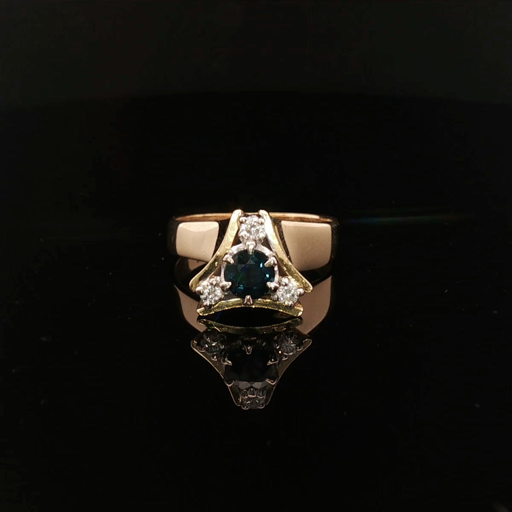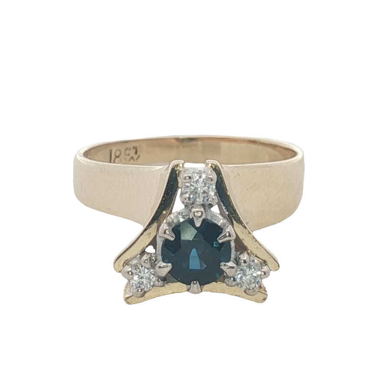 An exceptional handmade 18ct yellow and white gold ring featuring a stunning fine blue sapphire at its centre, beautifully surrounded by three sparkling brilliant-cut diamonds. This elegant design highlights the perfect harmony between the rich hue of the sapphire and the radiant sparkle of diamonds — a timeless piece of refined luxury.
