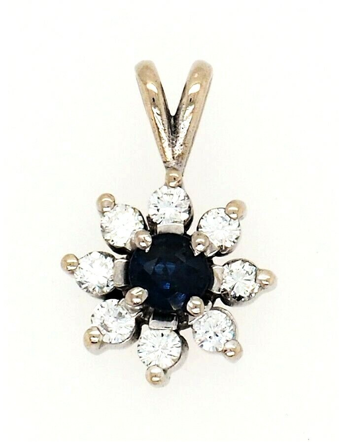 A pretty 18ct white gold cluster pendant featuring a Sapphire surrounded by 8 Diamonds.
