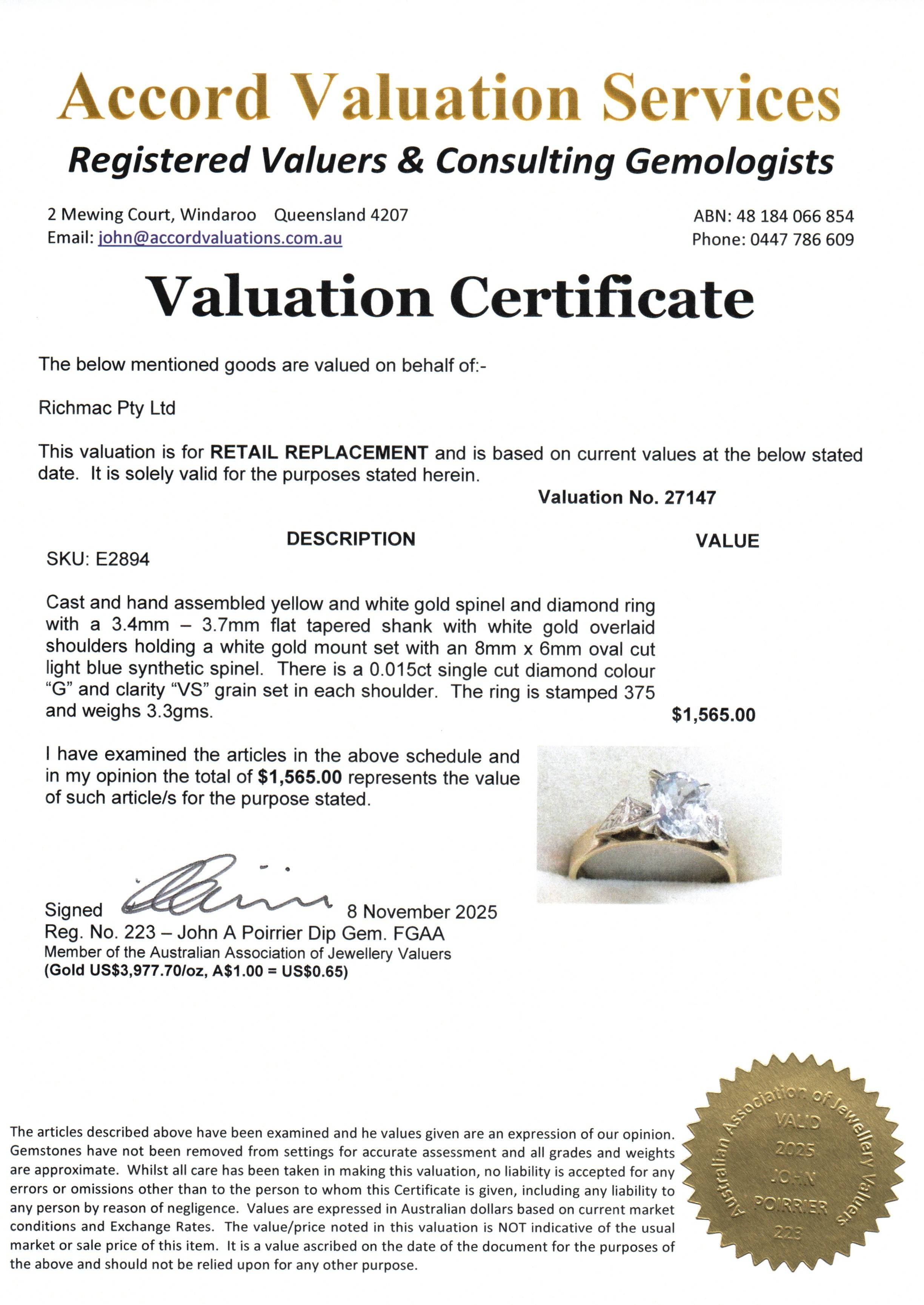💙 9ct Yellow & White Gold Created Blue Spinel & Diamond Ring – Valuation $1565 💙