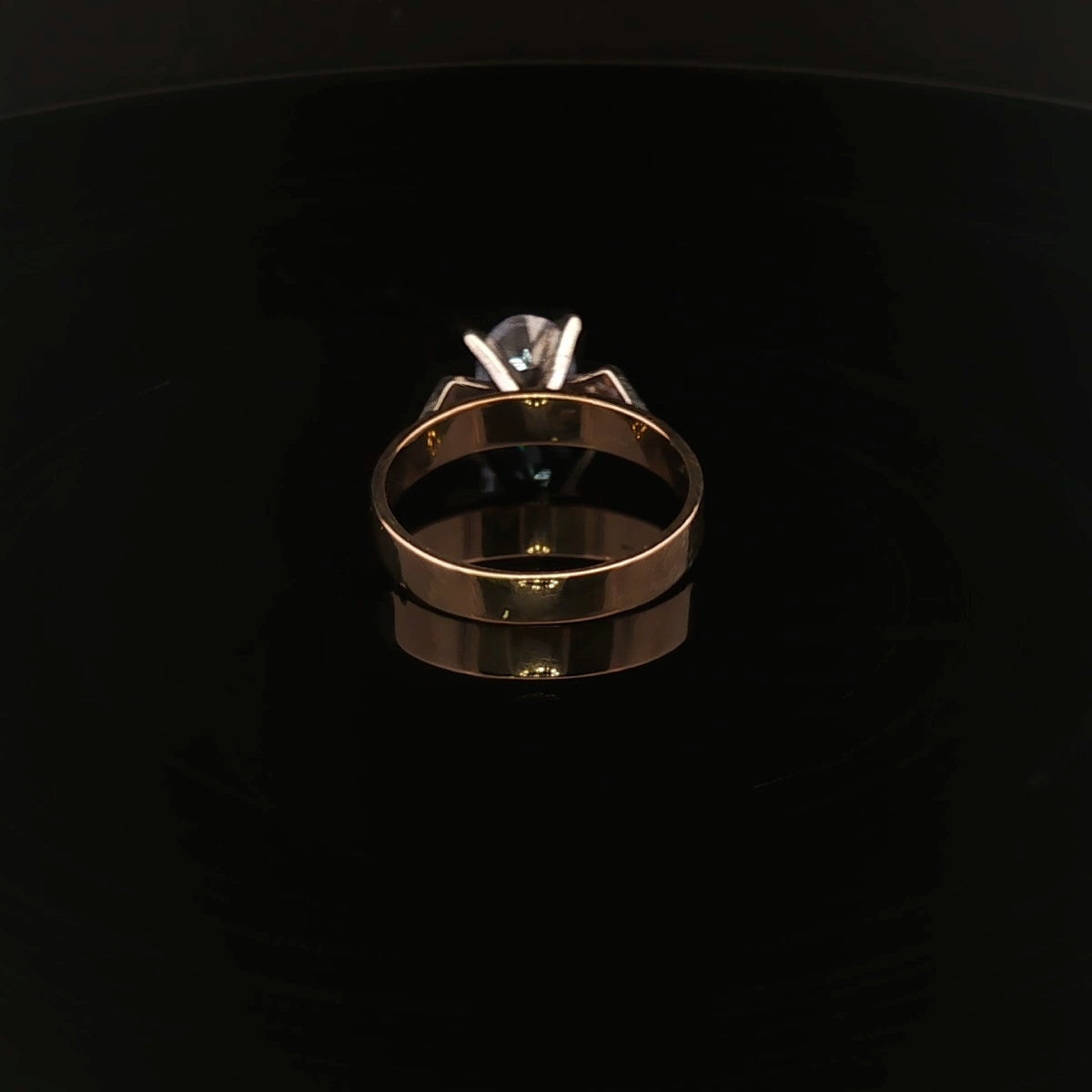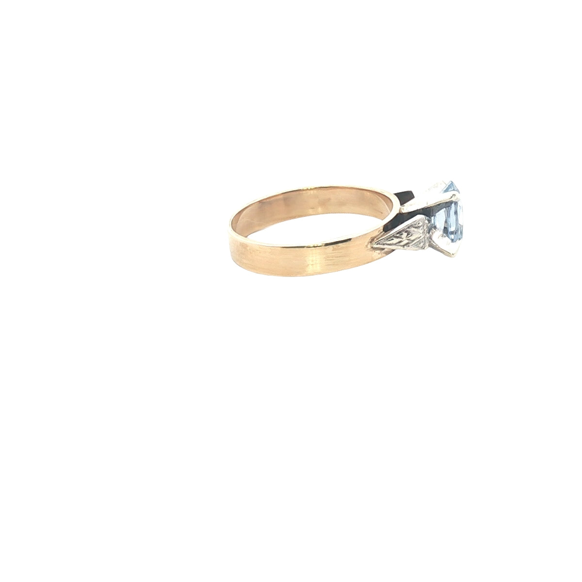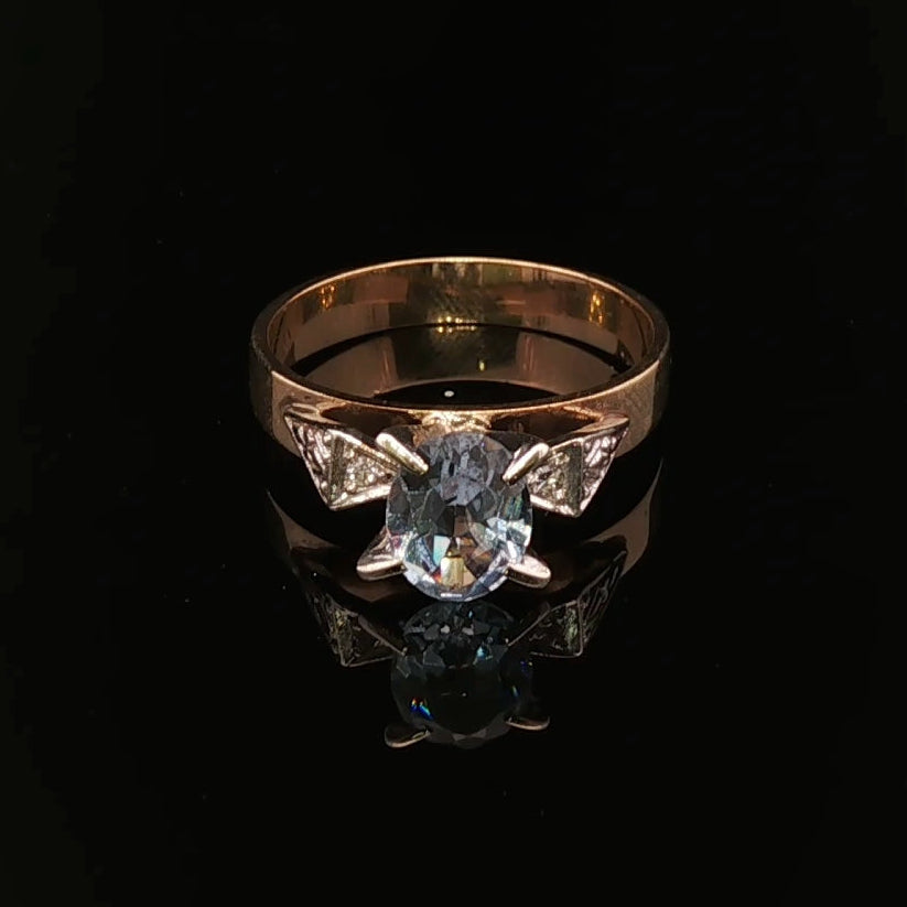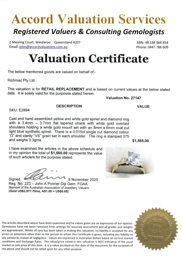 The ring is cast and hand assembled, featuring a 3.4mm – 3.7mm flat tapered shank with white gold overlaid shoulders leading into a white gold claw mount that secures an oval-cut light blue Spinel. Each shoulder holds a delicate single cut diamond, adding just the right touch of sparkle and refinement.
