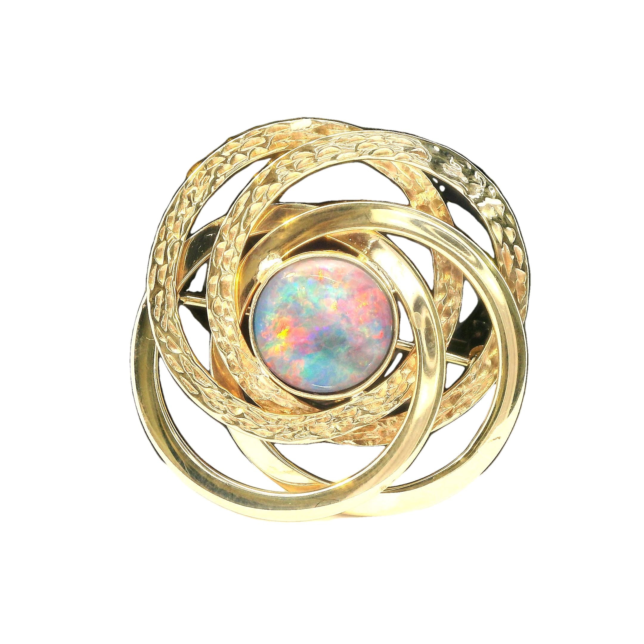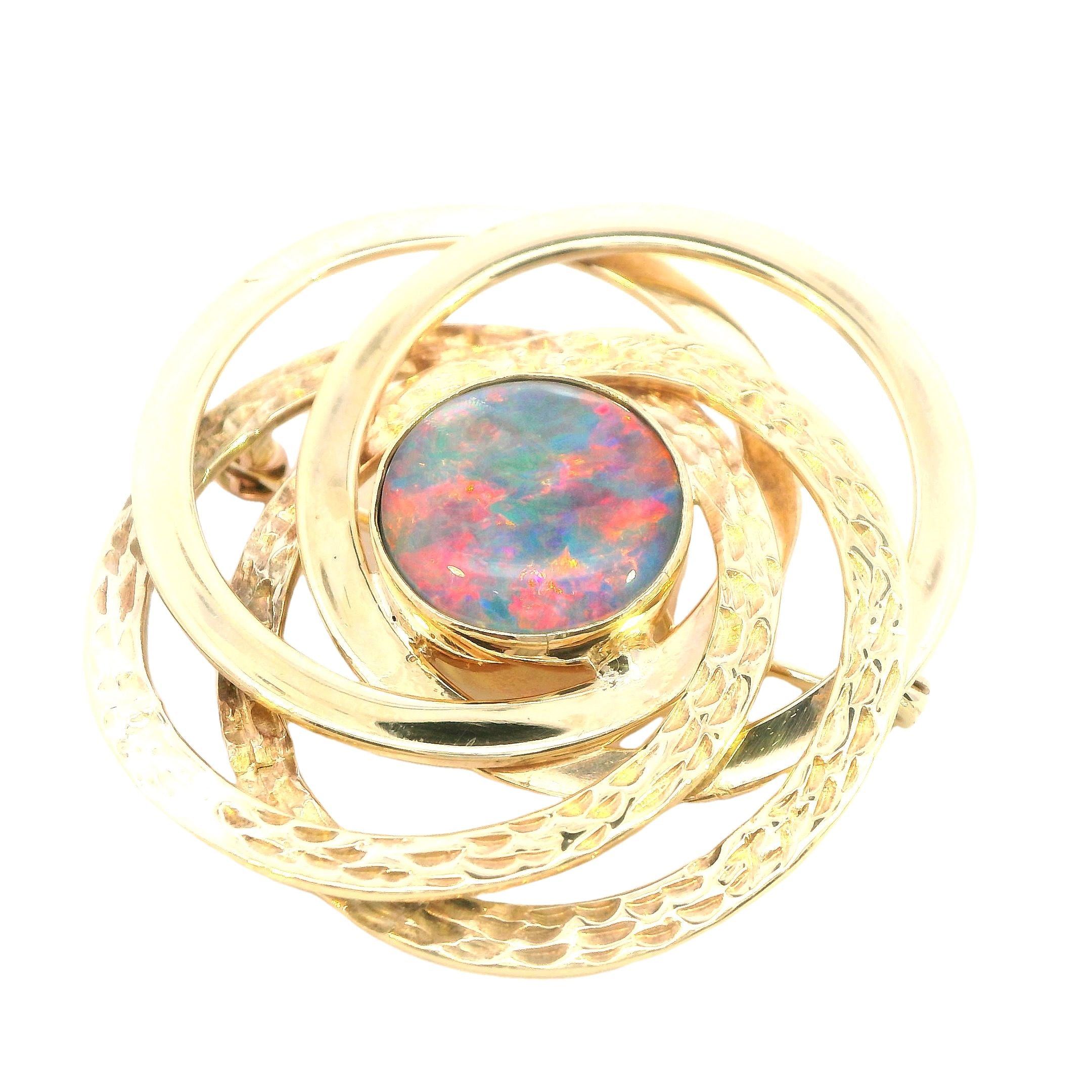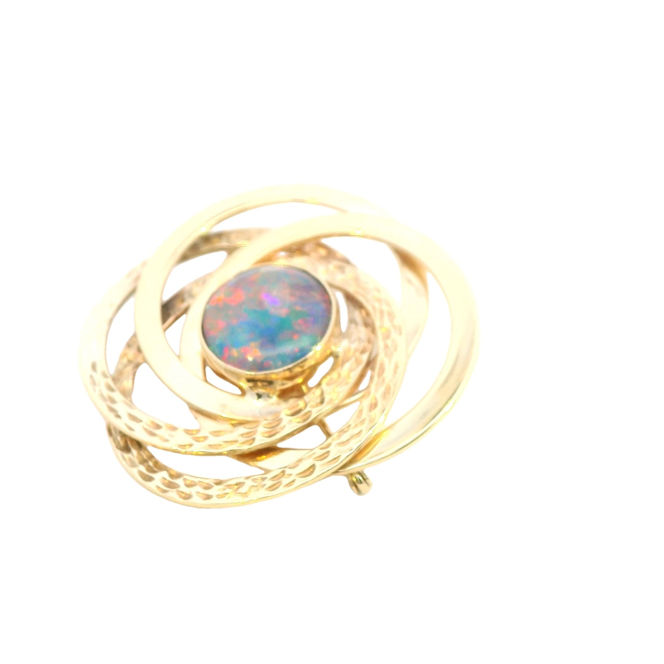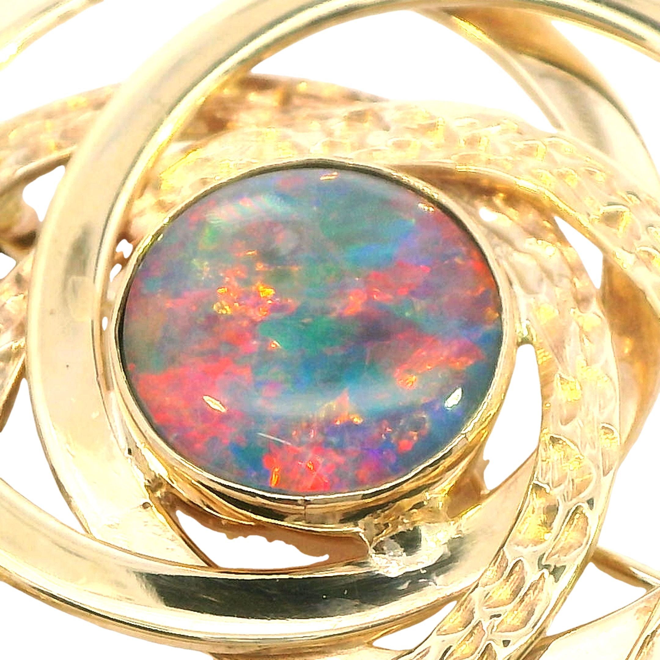 This stunning brooch is a beautiful example of the elegance and sophistication that opals can bring to fine jewelry. The brooch is cast and assembled in rich yellow gold, stamped with 9ct for authenticity. It features a round, 12mm opal triplet, bezel set to enhance and protect the gemstone while allowing its vibrant colors to shine through.