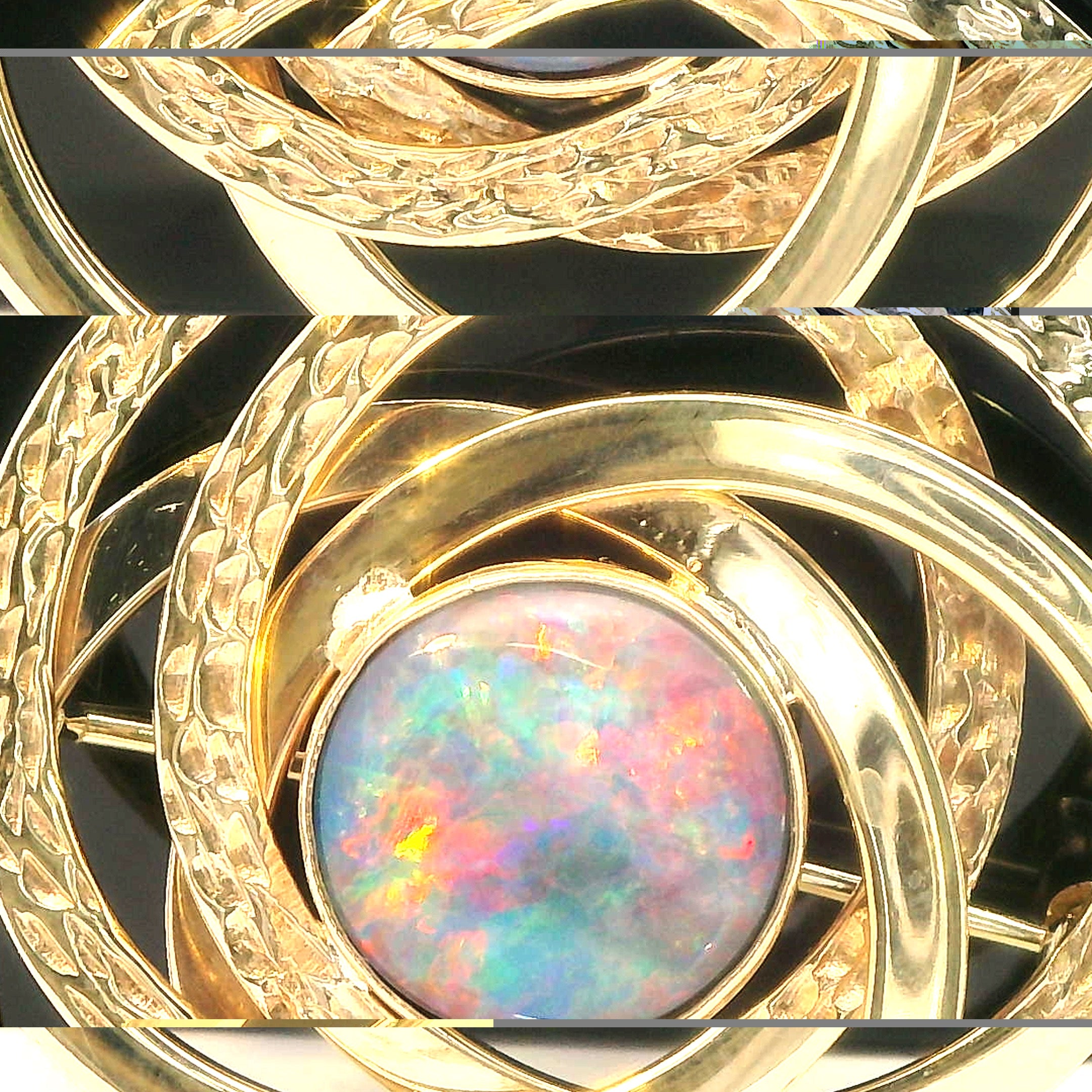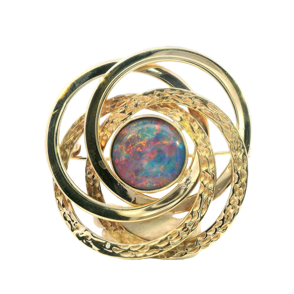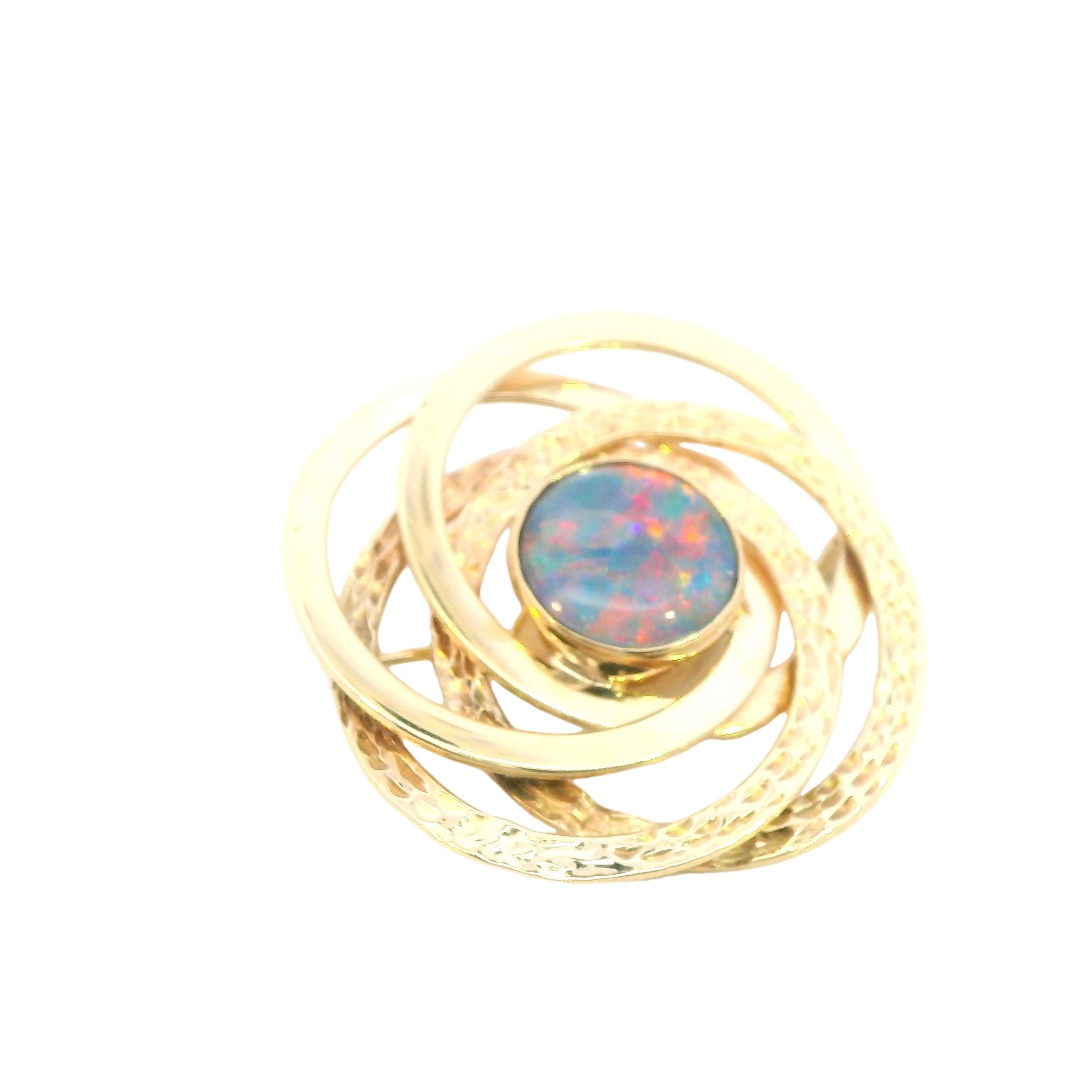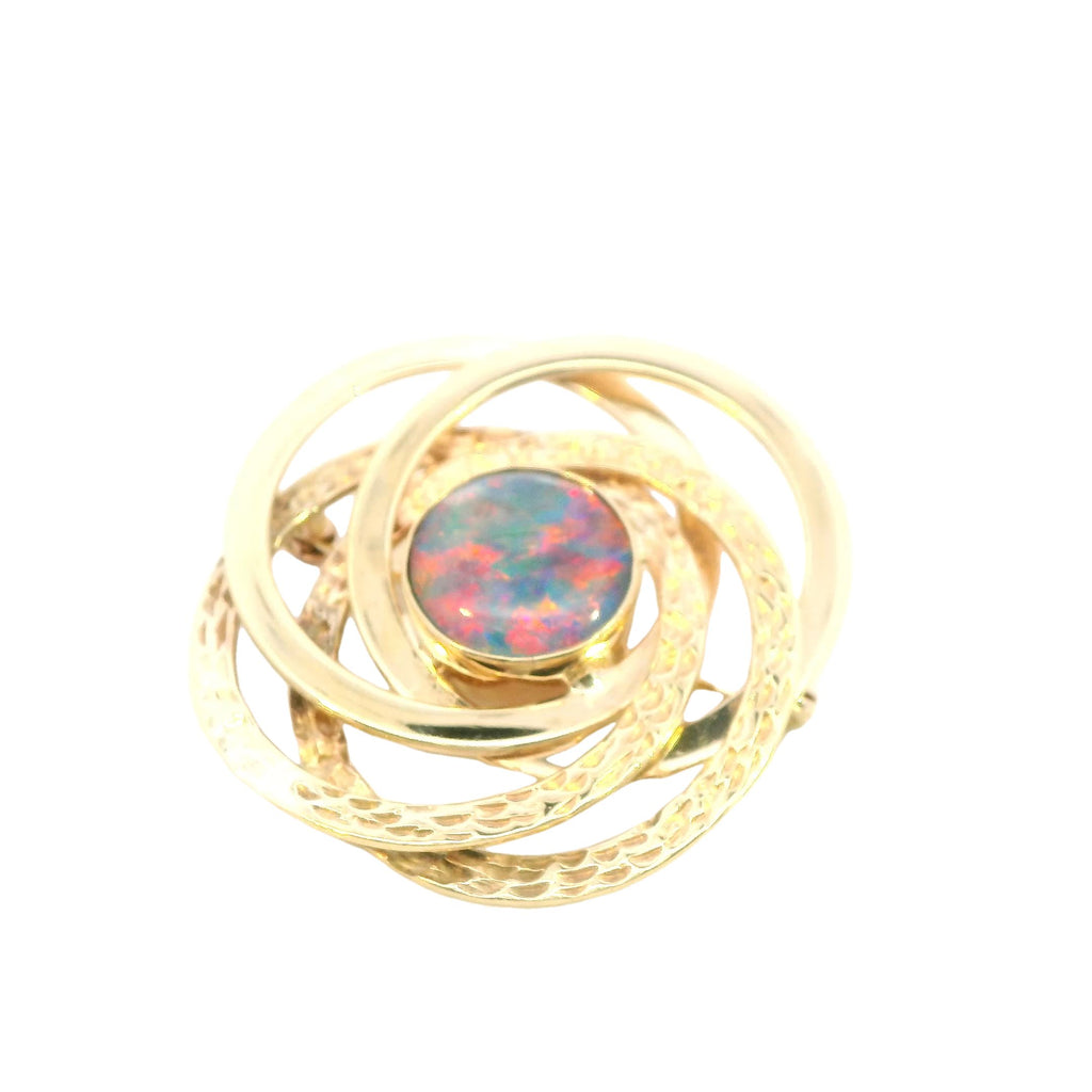 Description: An exquisite yellow gold opal brooch featuring a 12mm round opal triplet, set in a 9ct gold bezel. The brooch measures 37mm in diameter and weighs 11.7gms. Valued at $2,775.00.