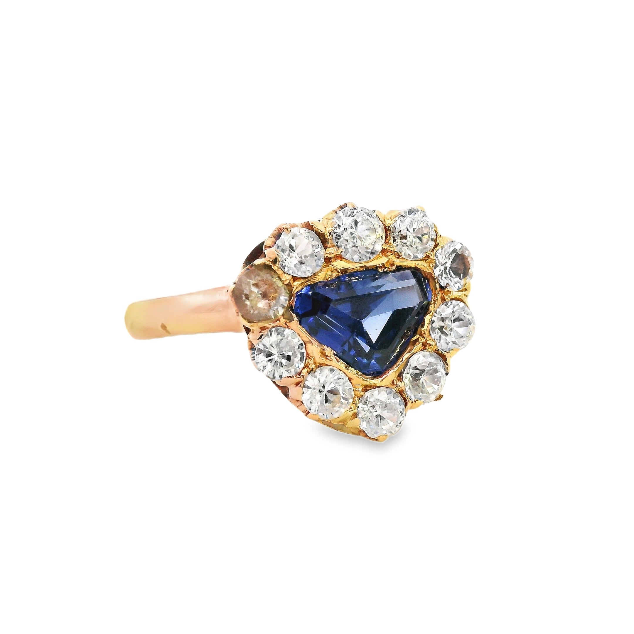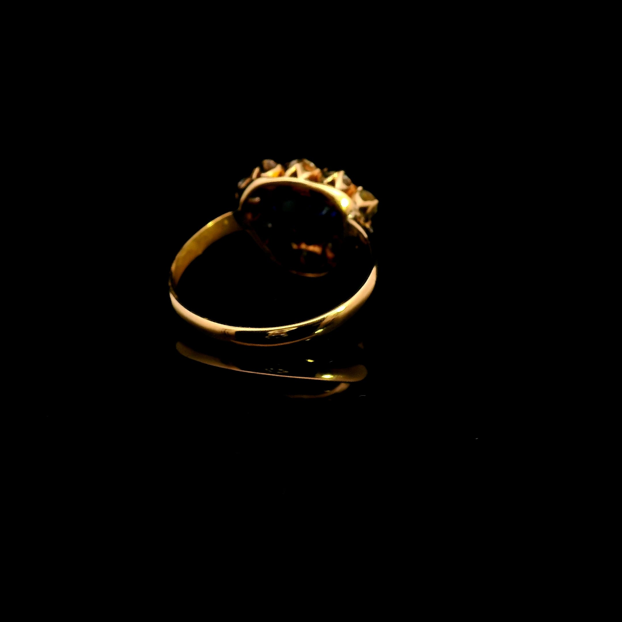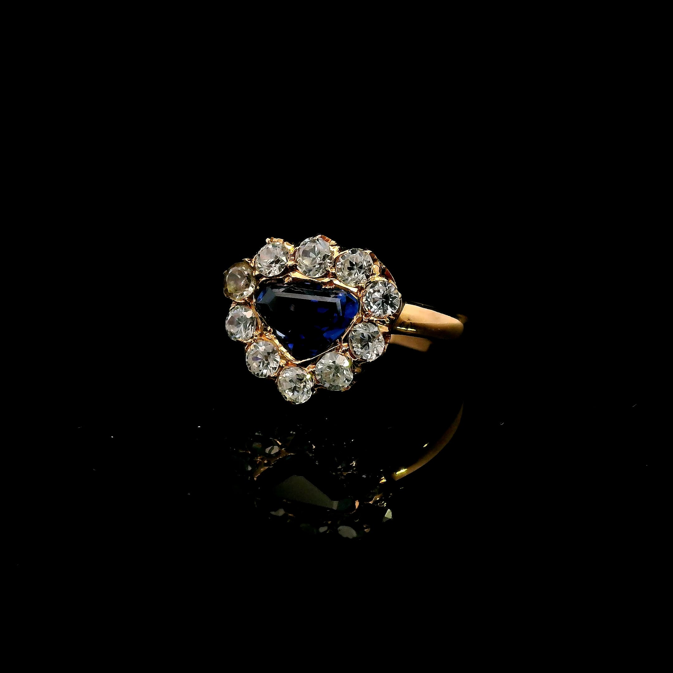 This remarkable 18ct yellow gold Sapphire, Zircon & Spinel ring is a one-of-a-kind handmade piece, designed with sophistication and elegance. At its center is a triangular-shaped sapphire, set in a secure grain setting, radiating a moderately bright mid-deep blue hue with exceptional clarity. Surrounding the sapphire are eight dazzling, colourless zircons and two expertly cut spinels, creating a mesmerizing contrast and brilliance.