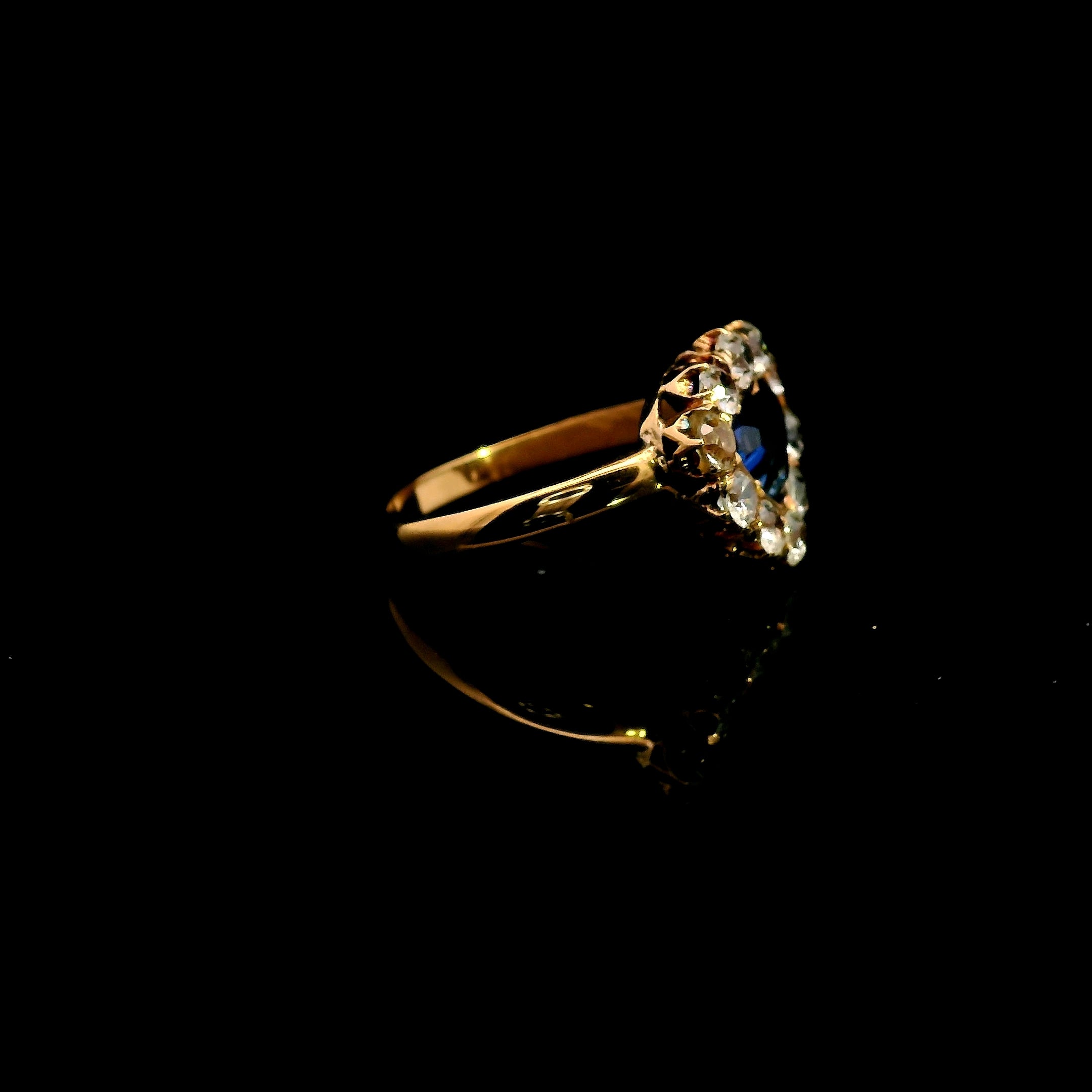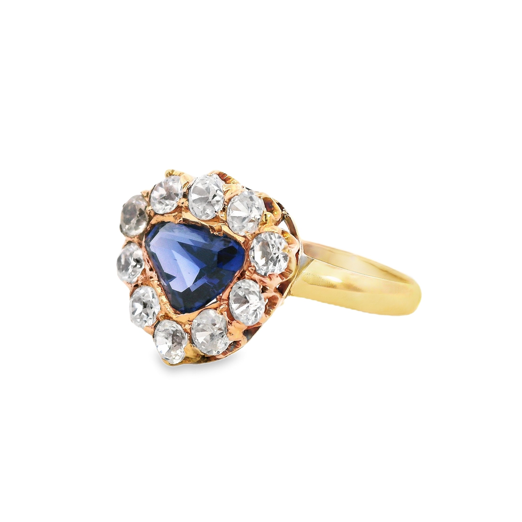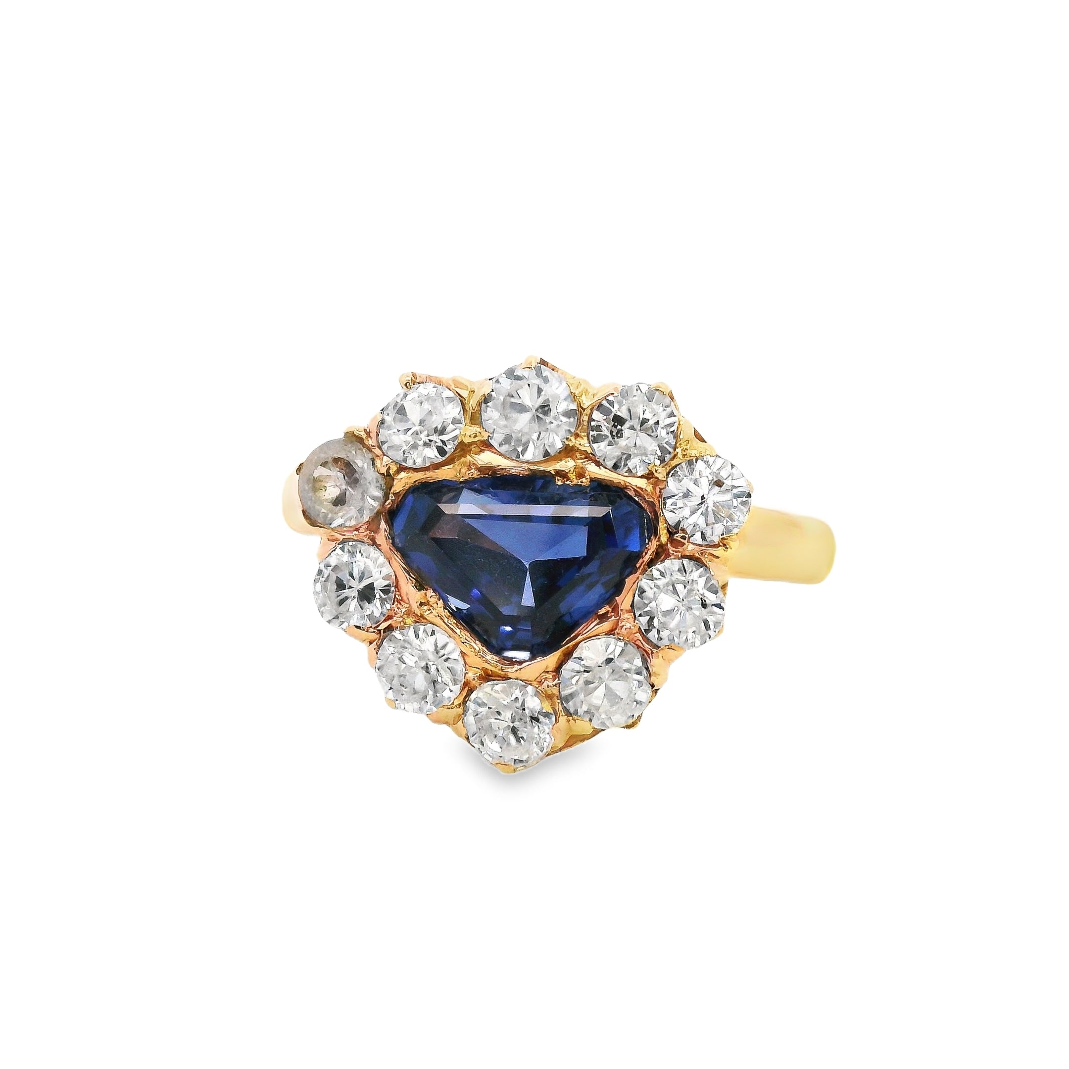 This remarkable 18ct yellow gold Sapphire, Zircon & Spinel ring is a one-of-a-kind handmade piece, designed with sophistication and elegance. At its center is a triangular-shaped sapphire, set in a secure grain setting, radiating a moderately bright mid-deep blue hue with exceptional clarity. Surrounding the sapphire are eight dazzling, colourless zircons and two expertly cut spinels, creating a mesmerizing contrast and brilliance.