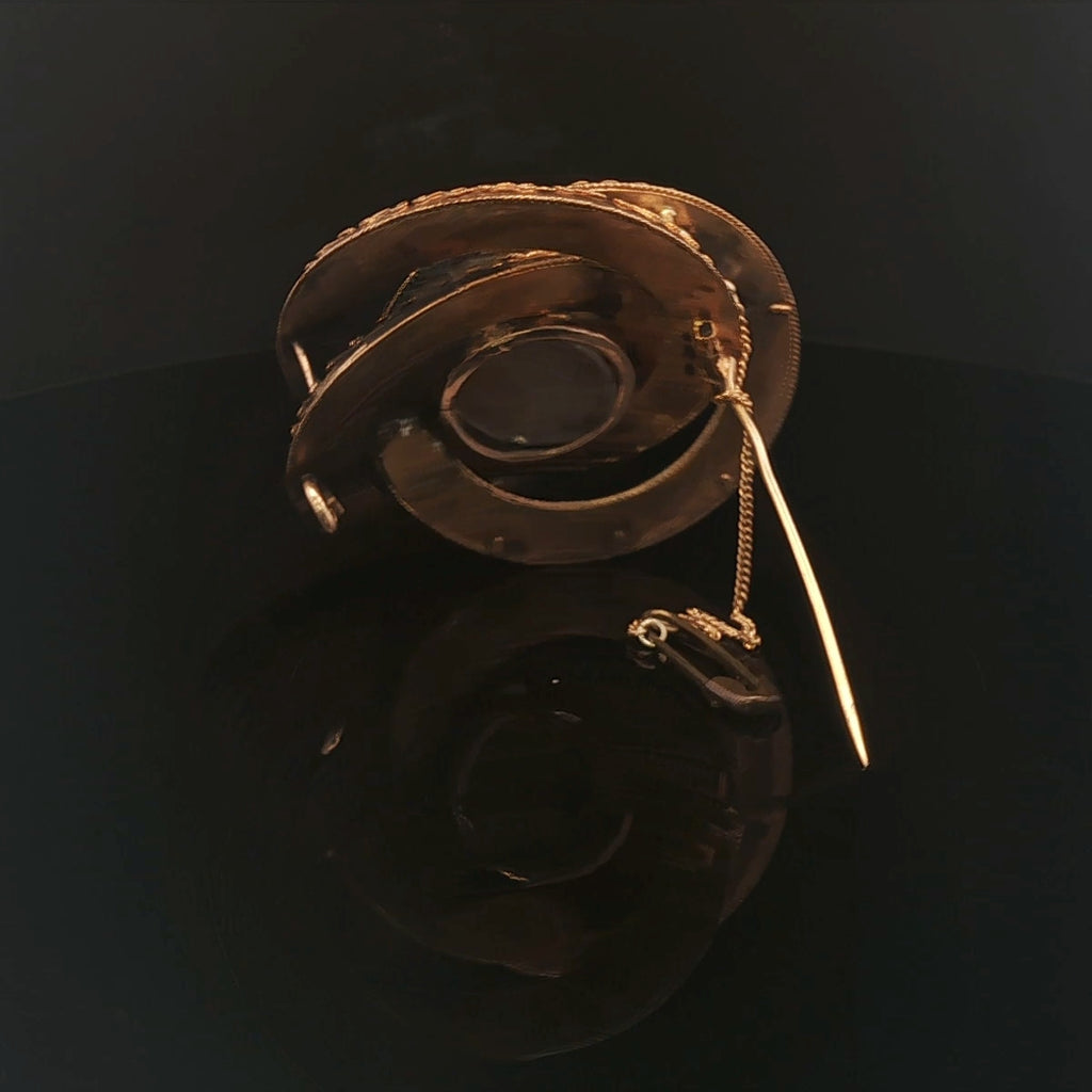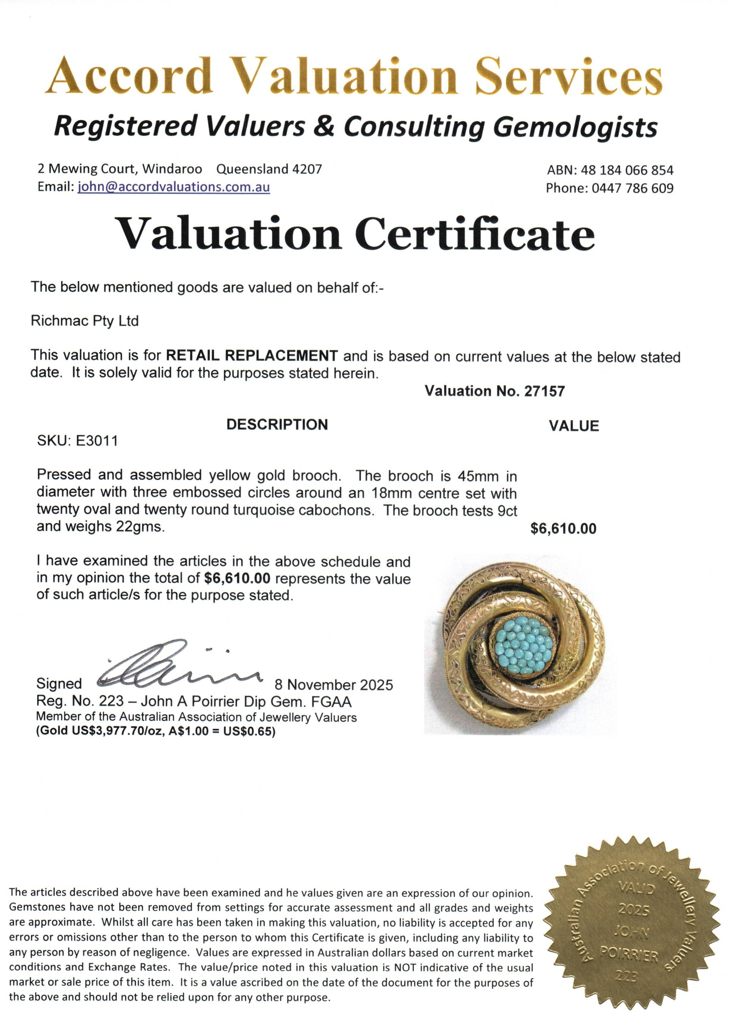 Weighing an impressive 22 grams, this brooch has been tested as 9ct gold and retains a soft, time-earned patina that enhances its vintage appeal. It is accompanied by an independent certificate of valuation, confirming an insurance replacement value of $6610.