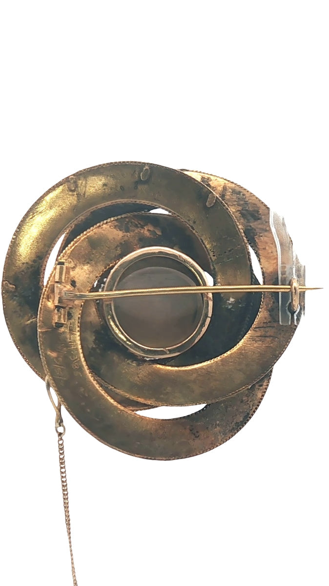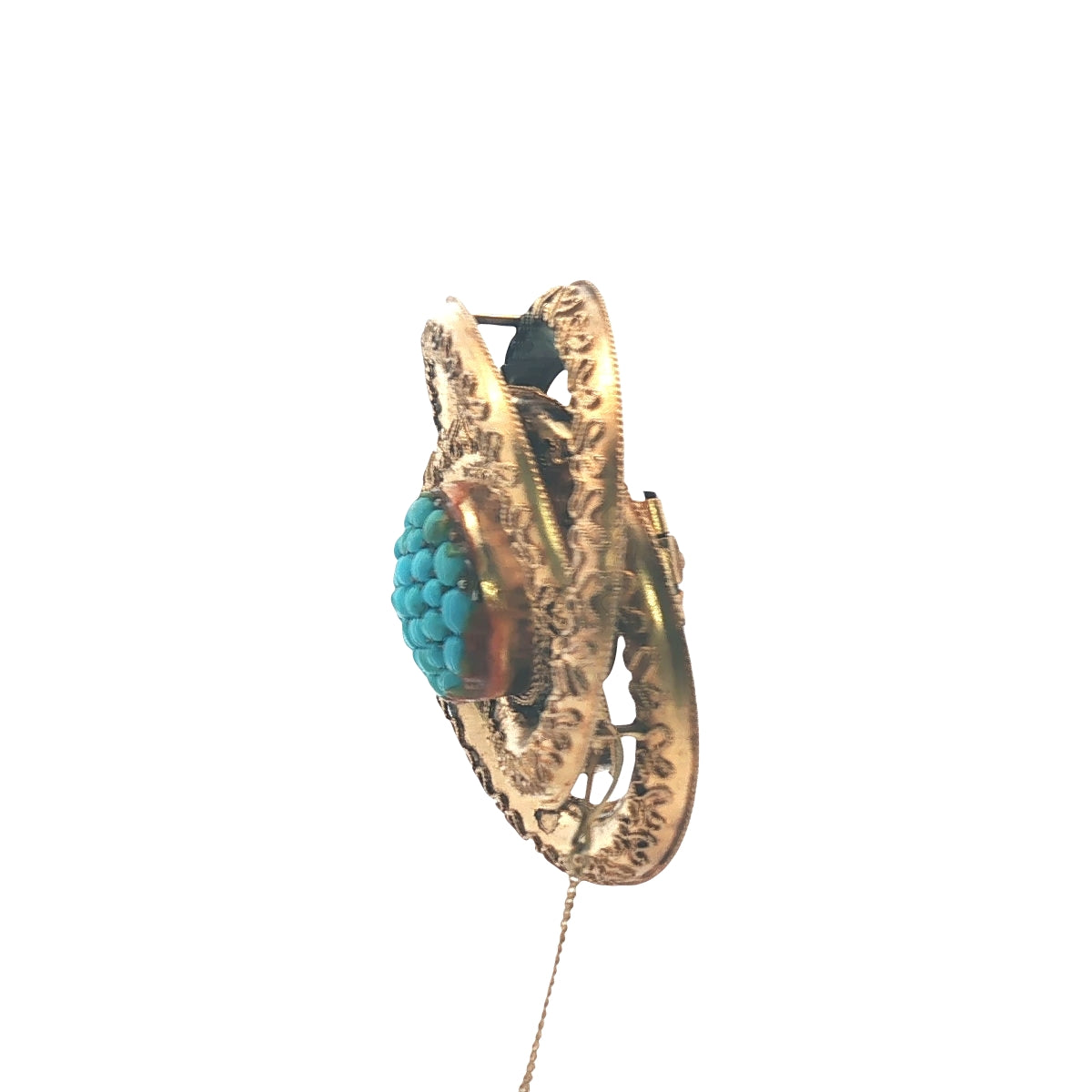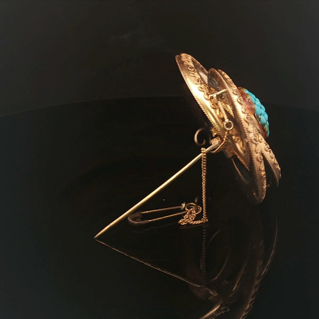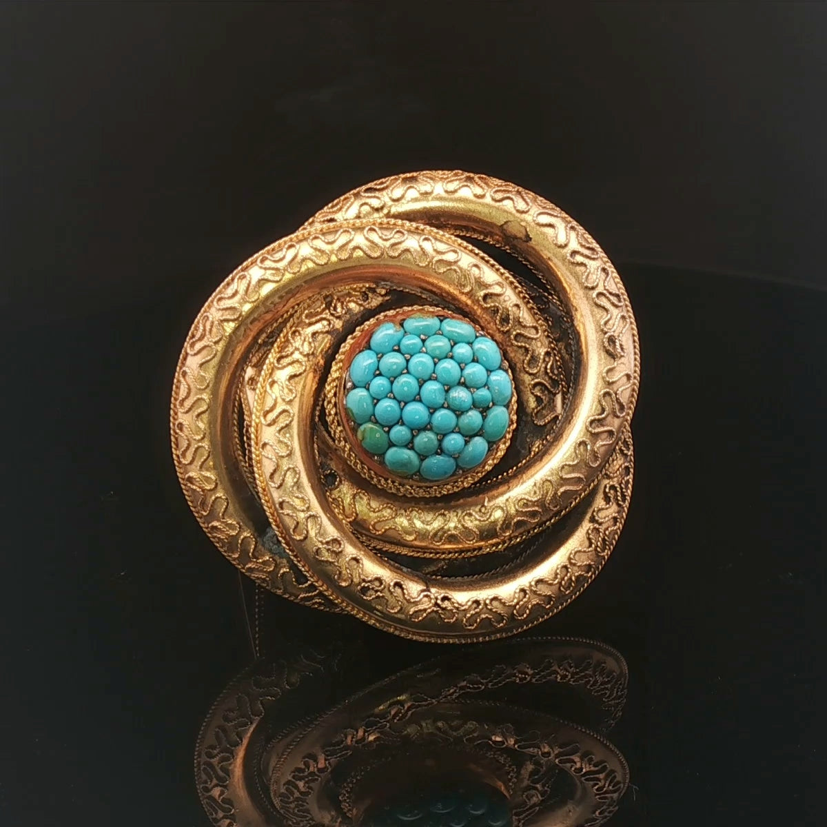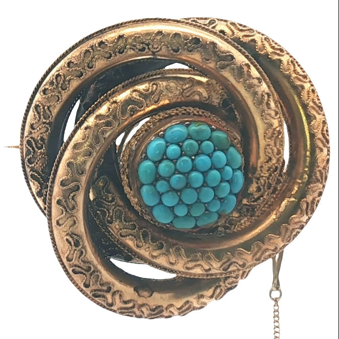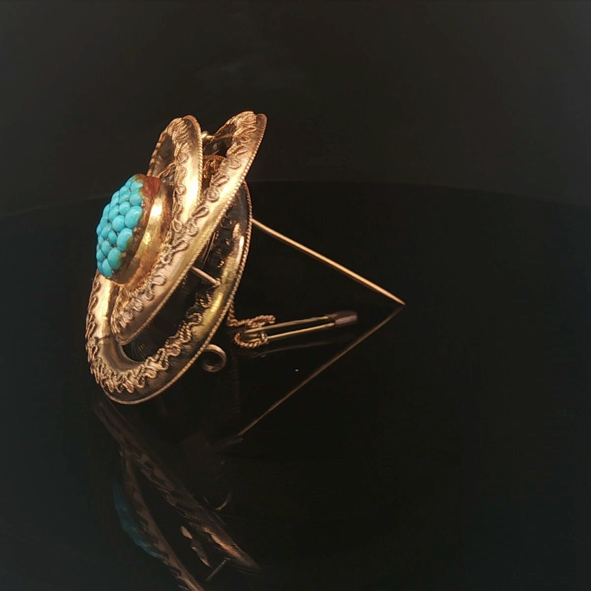 The brooch is fitted with a traditional extended c-clasp fastening, a hallmark of jewellery from the 1800s–1900s, offering both security and authenticity. Its intricate design consists of three entwined embossed gold circles surrounding an 18mm central panel set with a total of forty turquoise cabochons — twenty oval and twenty round — each carefully chosen for its distinctive sky-blue hue and natural charm.
