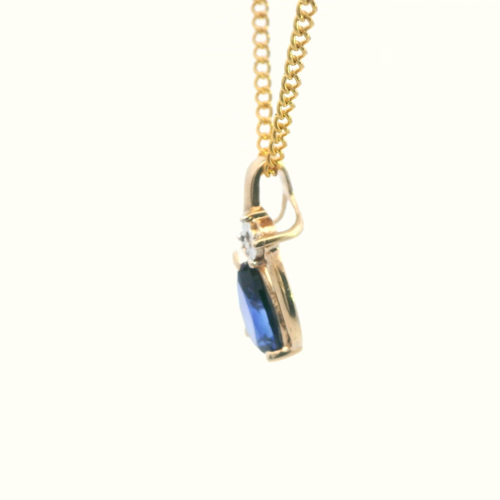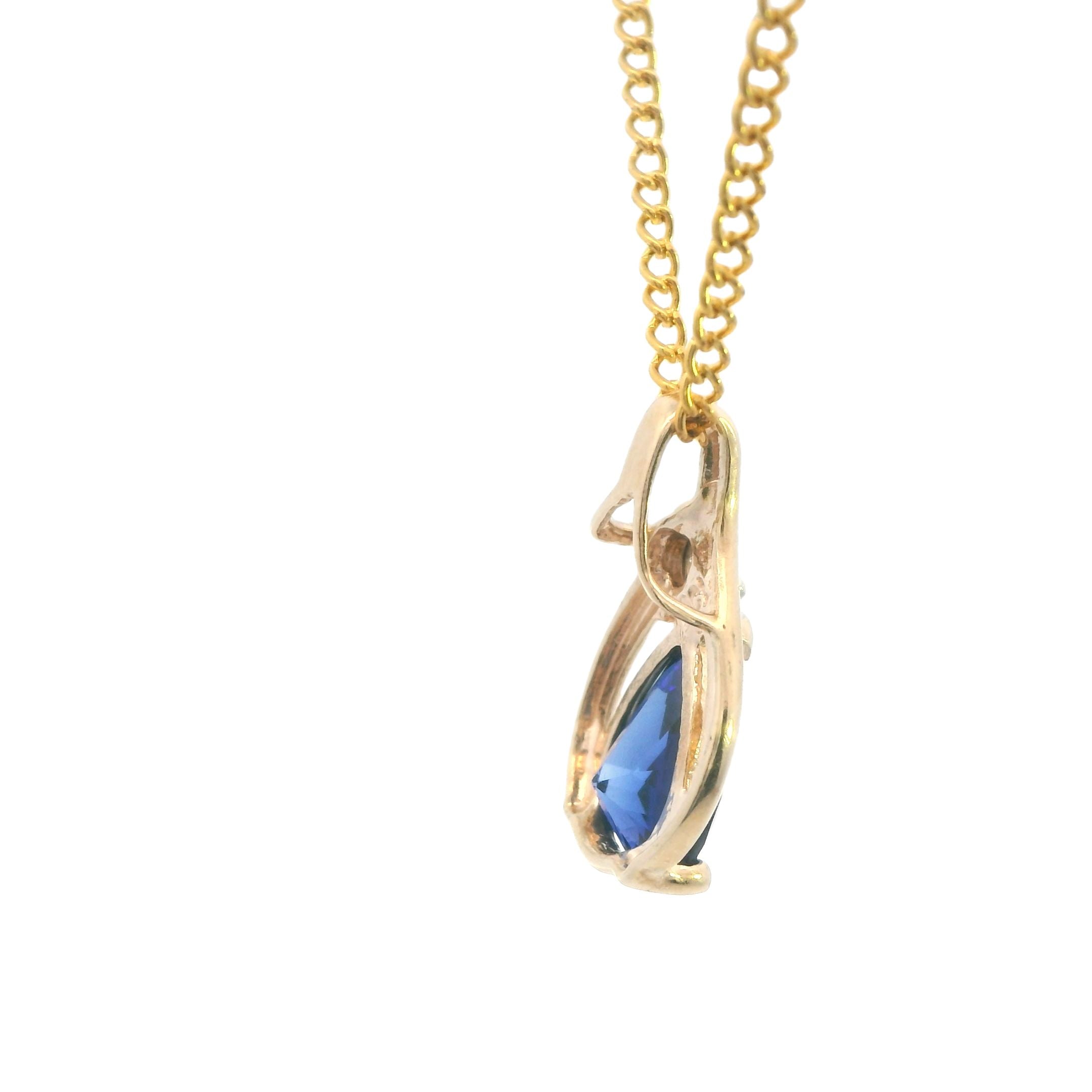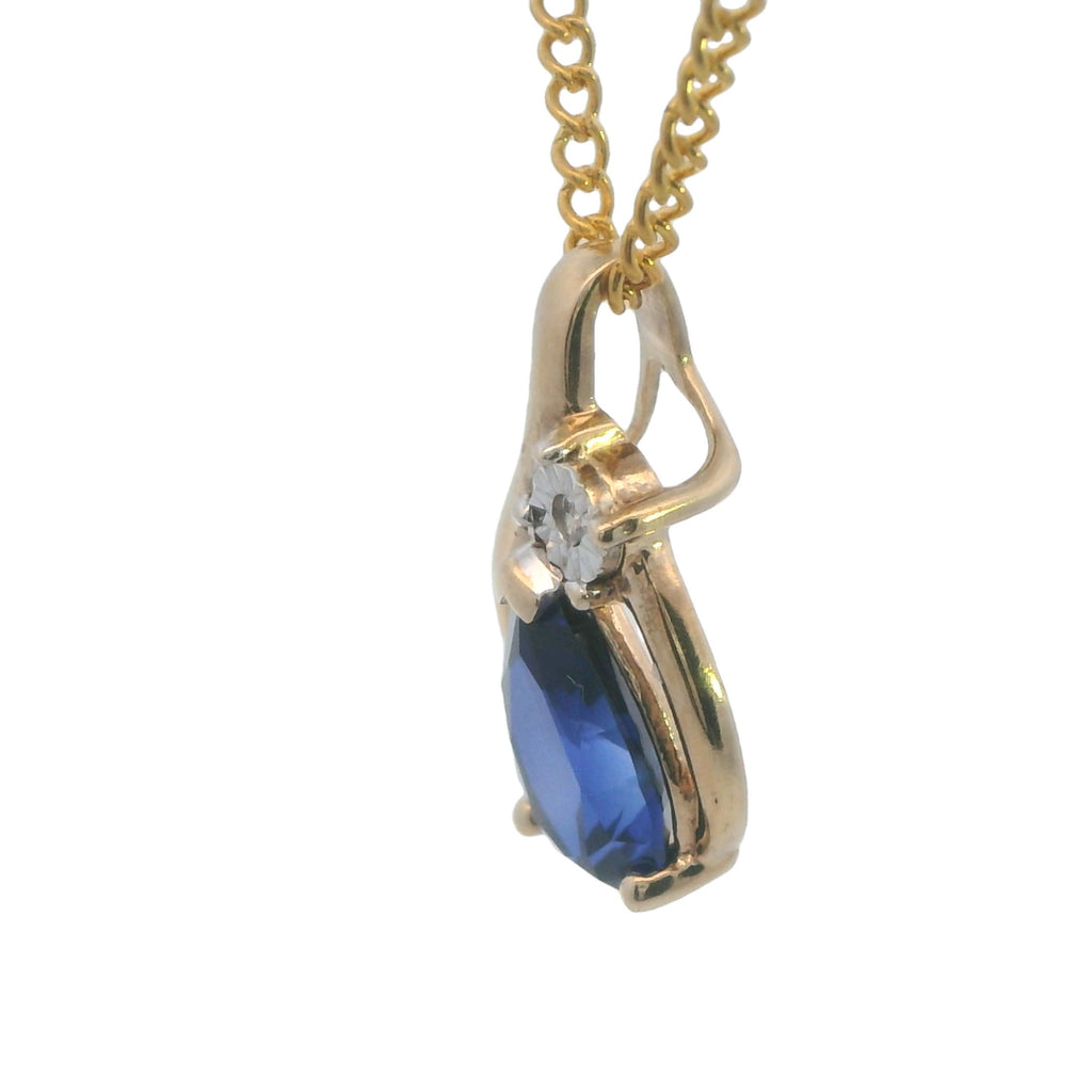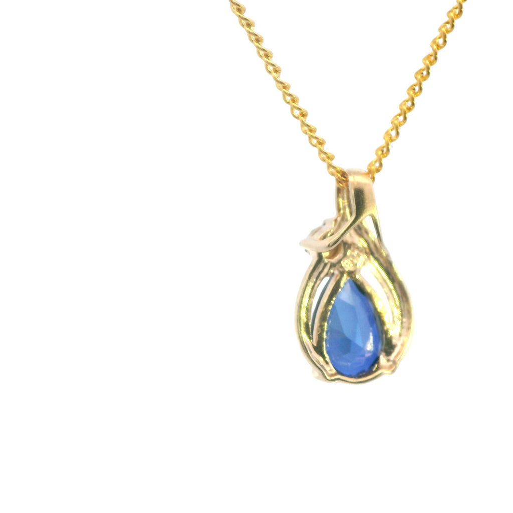 This sapphire and diamond pendant is a true classic, with its dark blue created sapphire in a delicate tear drop shape that symbolizes elegance and grace. The pendant is further enhanced by a sparkling round diamond set in a white gold accent, adding a touch of luxury and brilliance to the overall design. The combination of yellow gold and white gold creates a striking contrast, making this pendant perfect for any occasion.