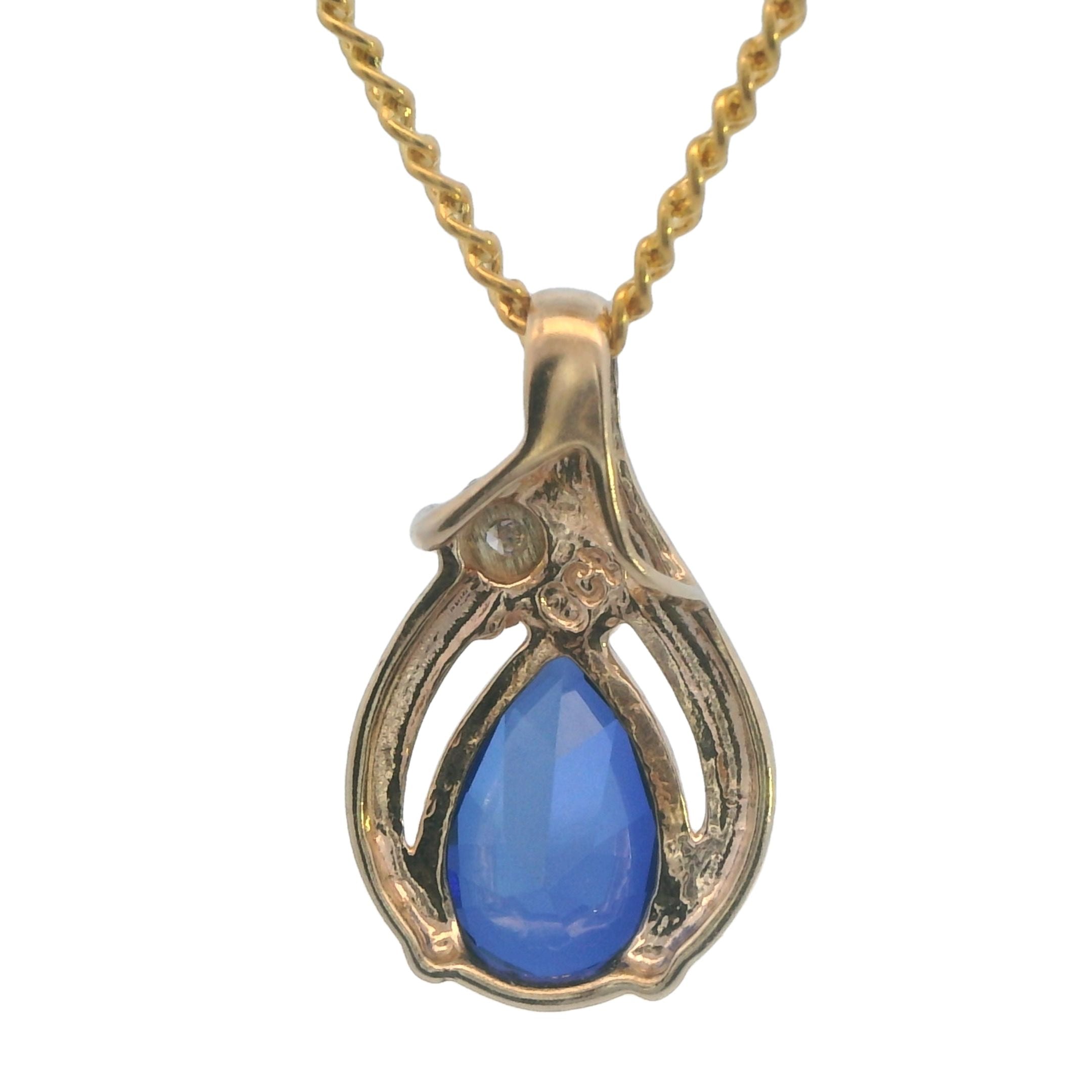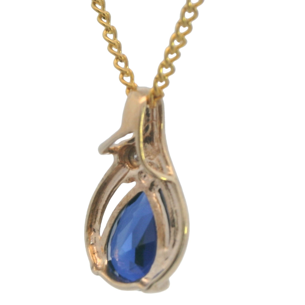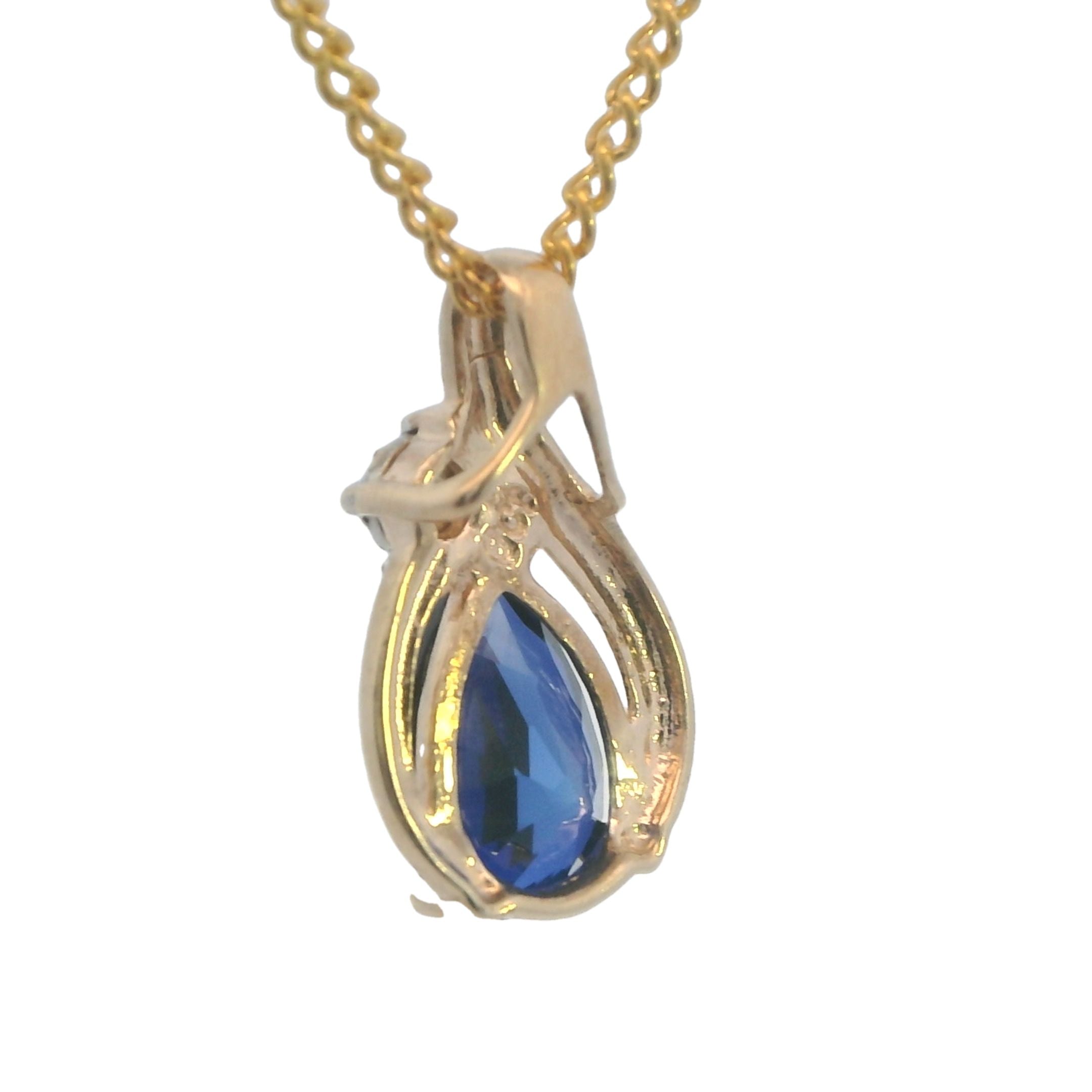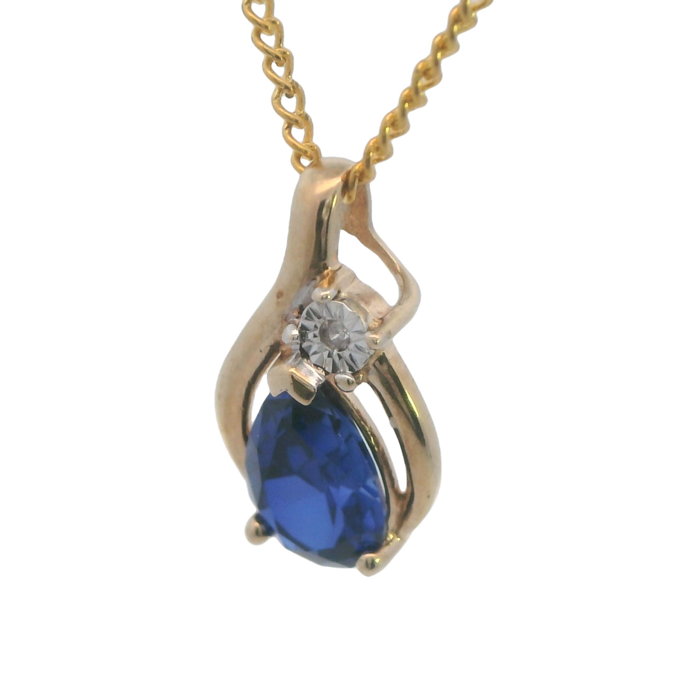 This sapphire and diamond pendant is a true classic, with its dark blue created sapphire in a delicate tear drop shape that symbolizes elegance and grace. The pendant is further enhanced by a sparkling round diamond set in a white gold accent, adding a touch of luxury and brilliance to the overall design. The combination of yellow gold and white gold creates a striking contrast, making this pendant perfect for any occasion.