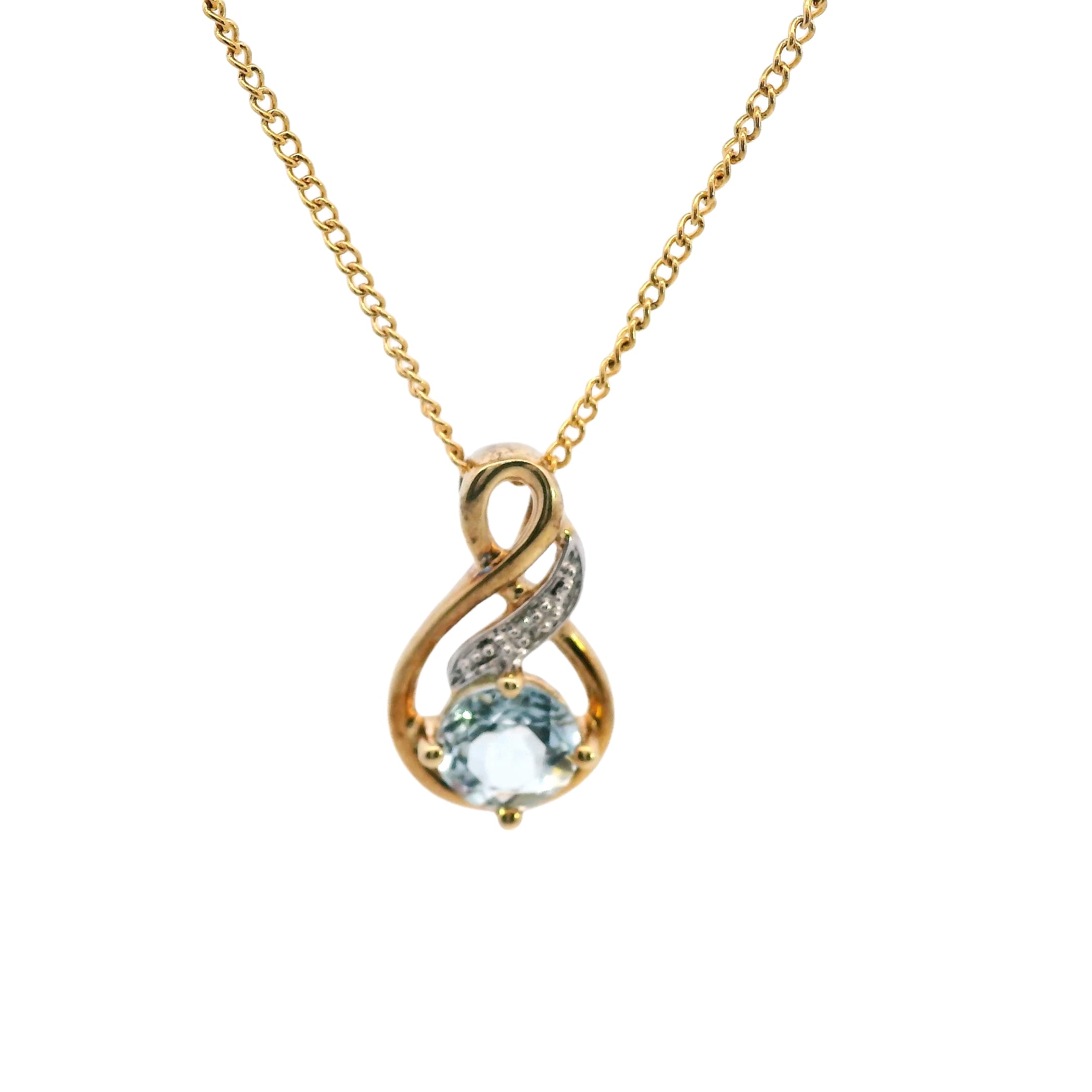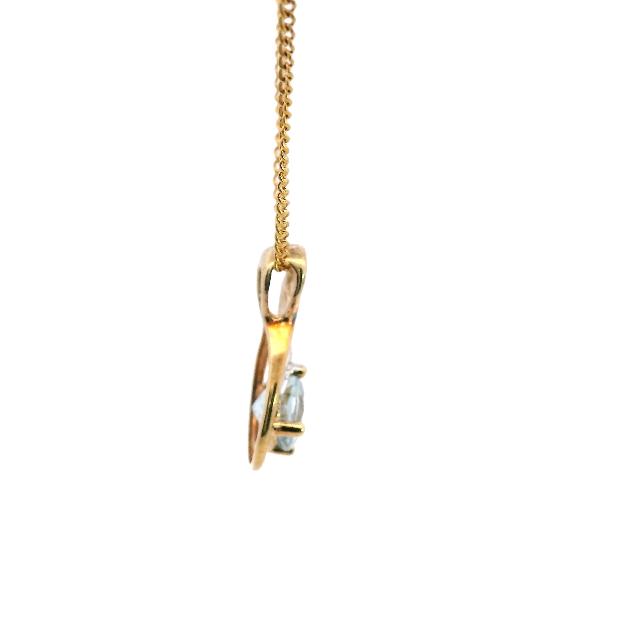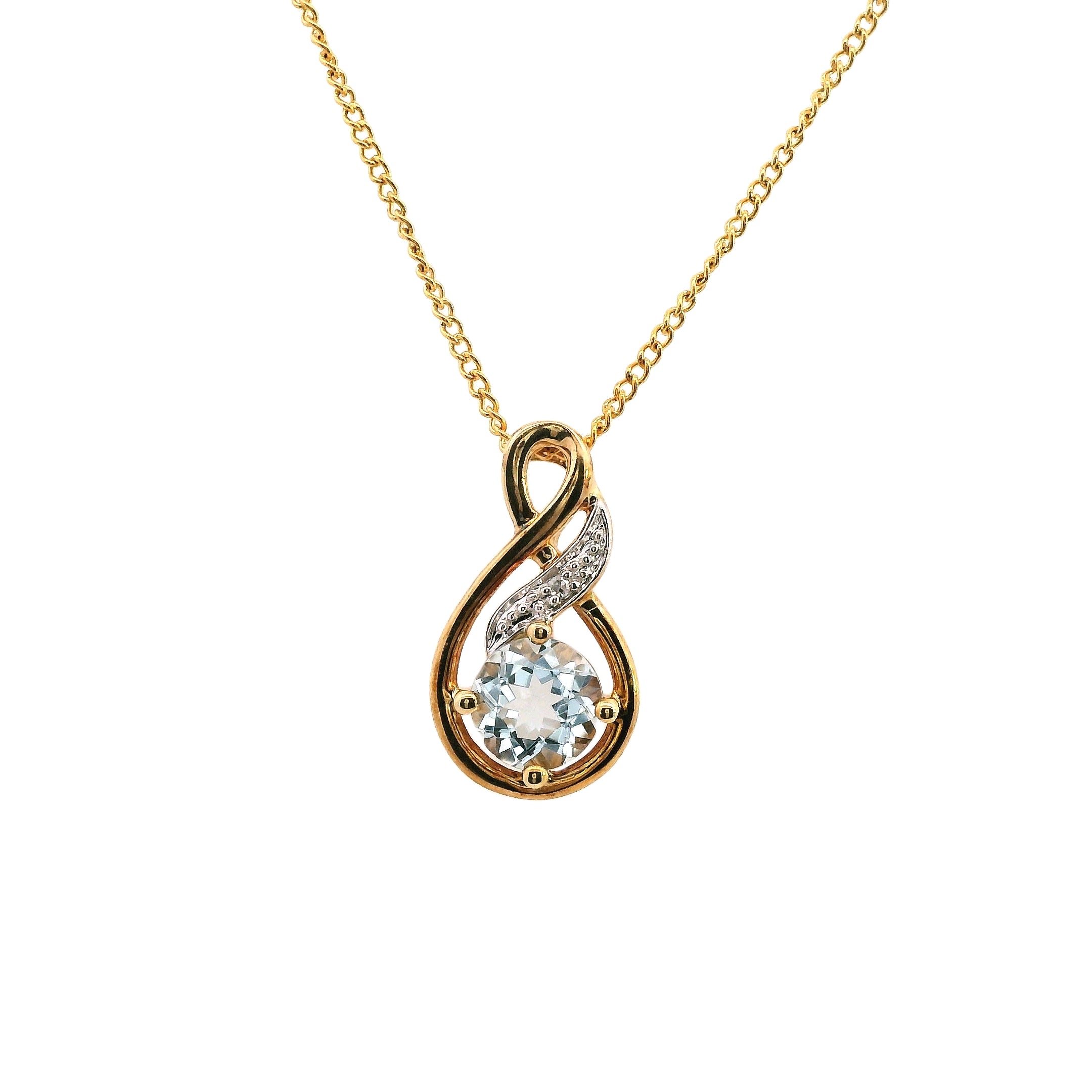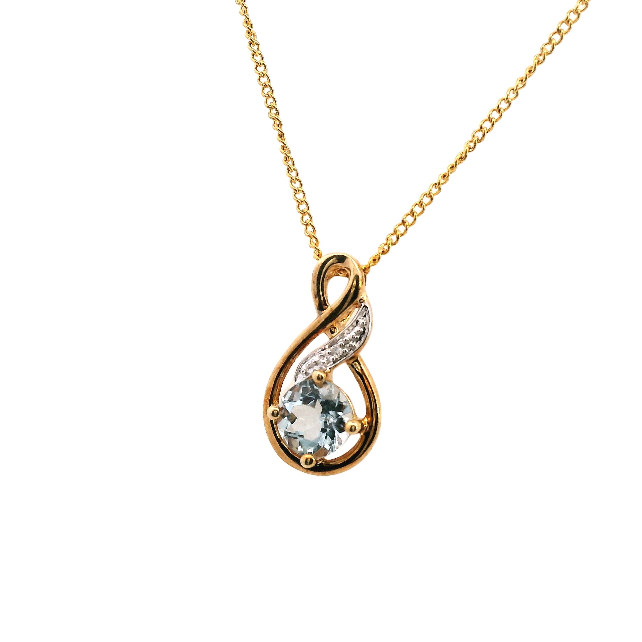 ThisΒ exquisite 9ct yellow gold Aquamarine & Diamond pendantΒ is aΒ delicate and sophisticated piece, perfect for those who loveΒ subtle elegance and timeless beauty. Featuring aΒ soft blue aquamarine, complemented by aΒ single sparkling diamond, this pendant embodiesΒ grace and serenity. TheΒ tapered leaf design with a pear-shaped looped surroundΒ enhances its natural charm, making it anΒ ideal gift or everyday luxury piece.