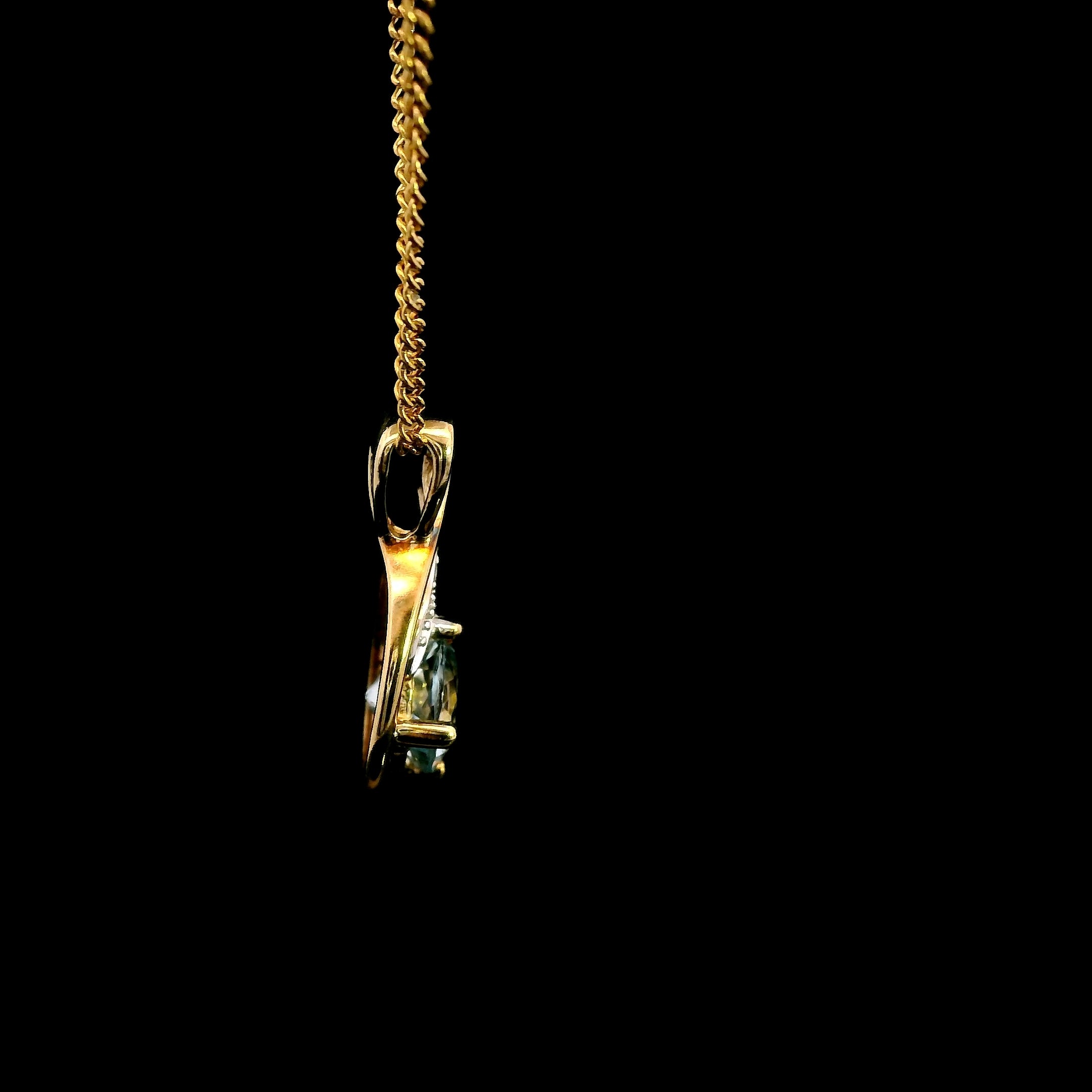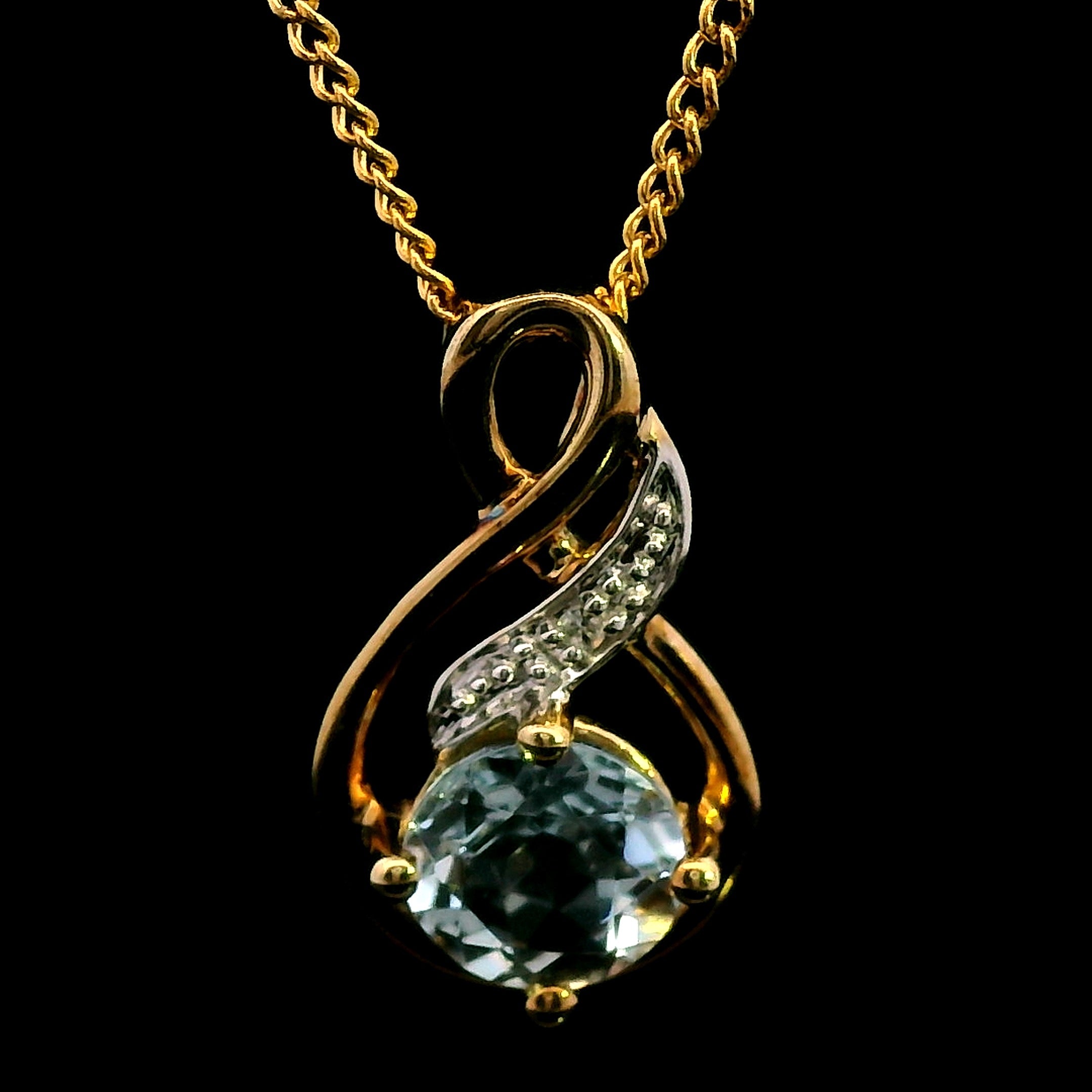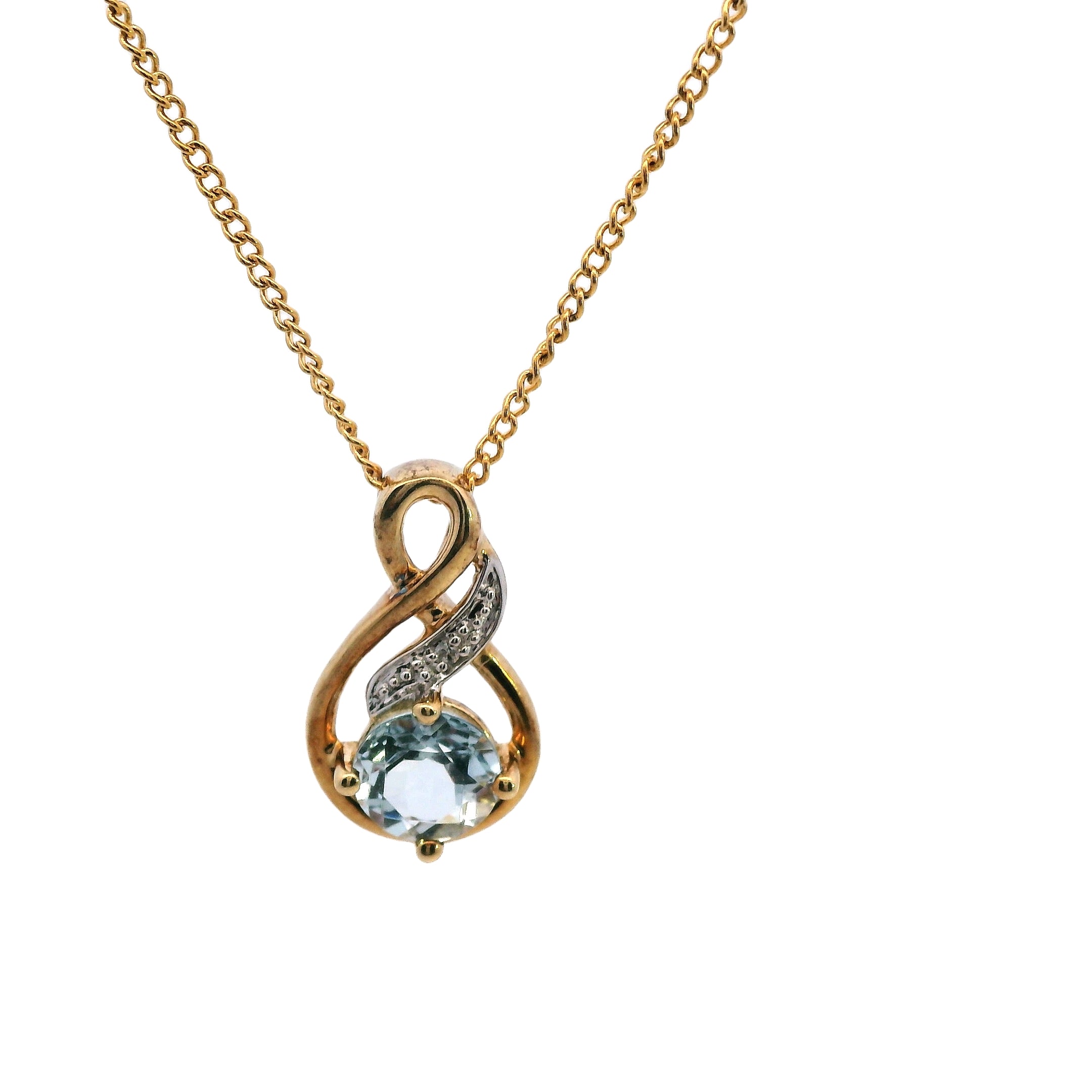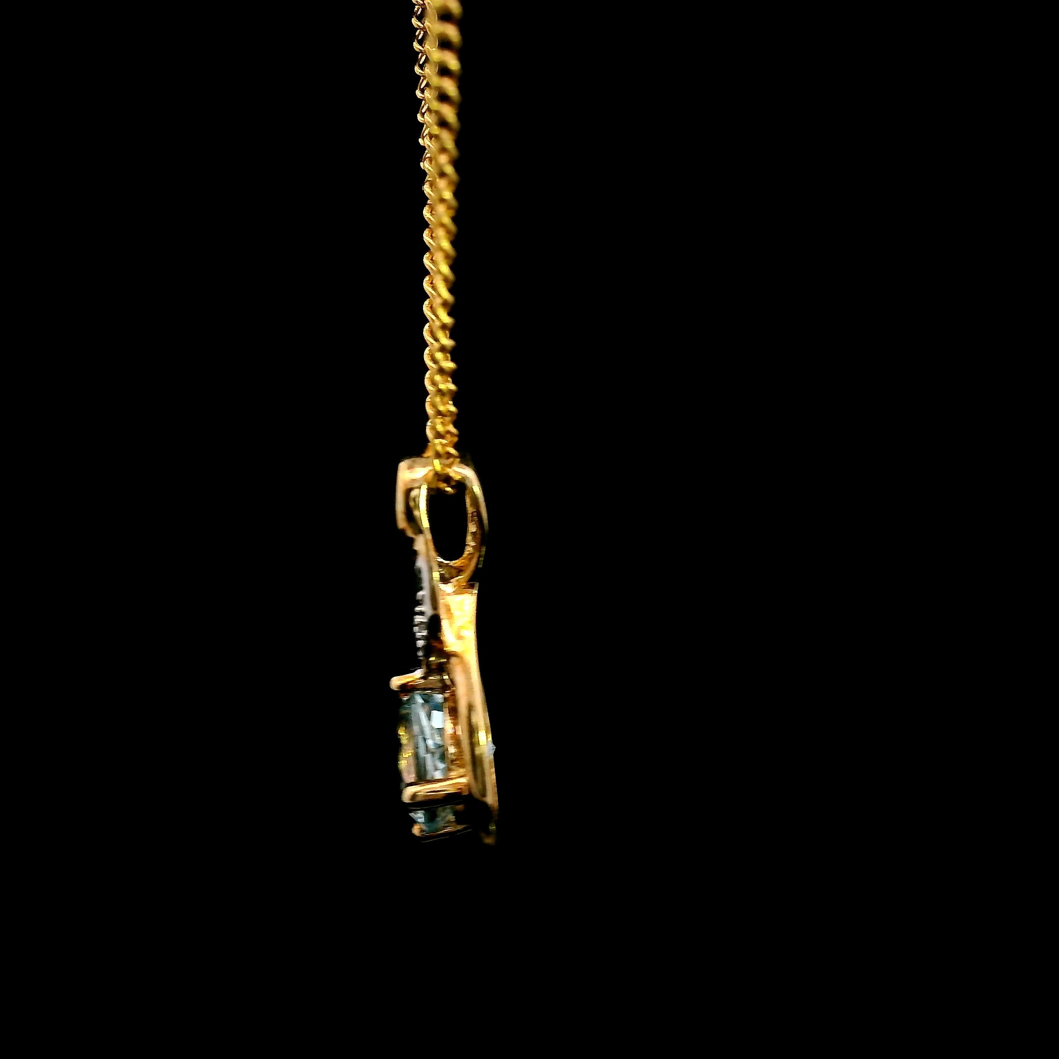ThisΒ exquisite 9ct yellow gold Aquamarine & Diamond pendantΒ is aΒ delicate and sophisticated piece, perfect for those who loveΒ subtle elegance and timeless beauty. Featuring aΒ soft blue aquamarine, complemented by aΒ single sparkling diamond, this pendant embodiesΒ grace and serenity. TheΒ tapered leaf design with a pear-shaped looped surroundΒ enhances its natural charm, making it anΒ ideal gift or everyday luxury piece.