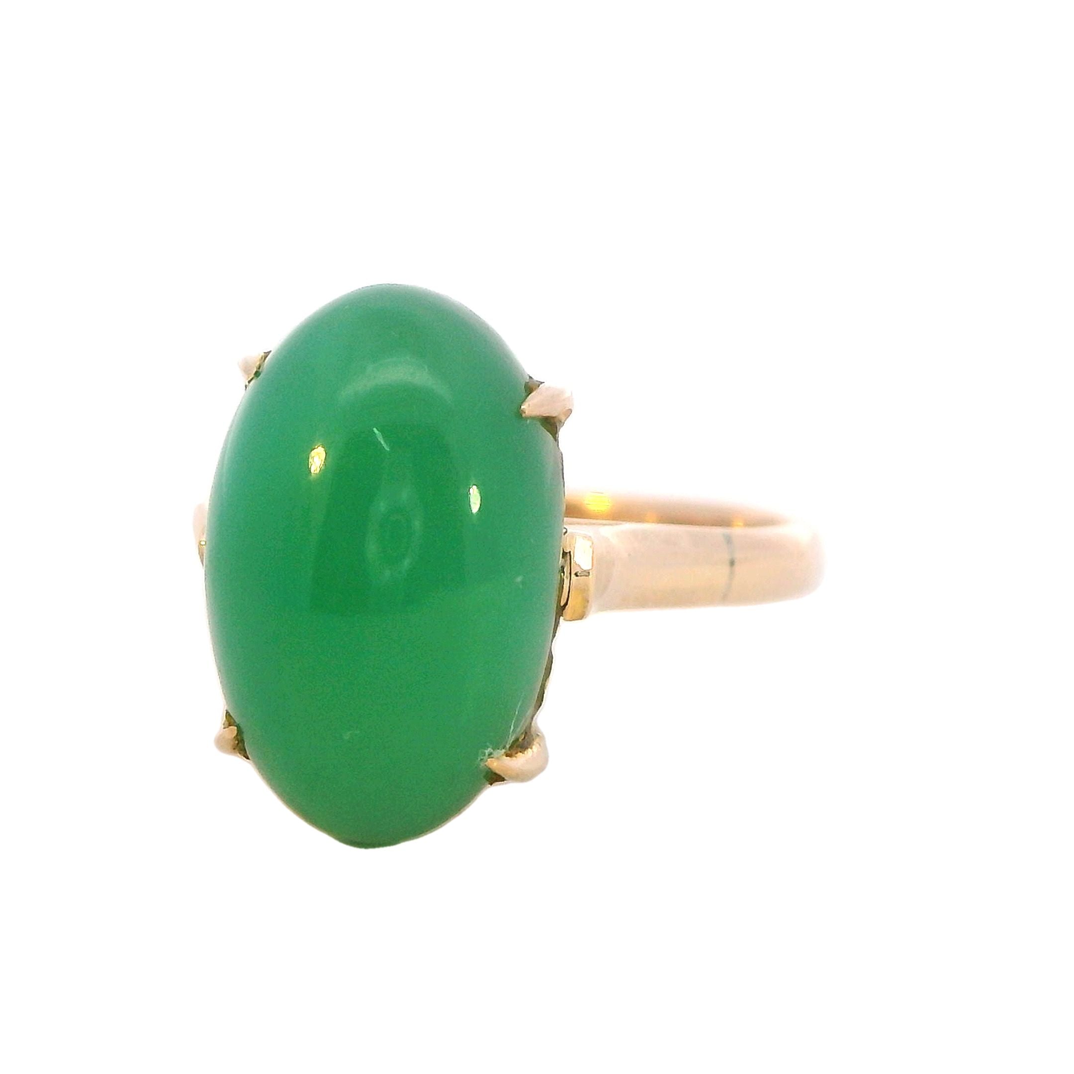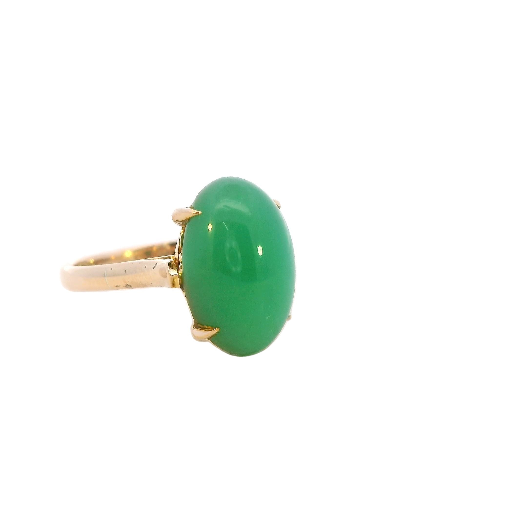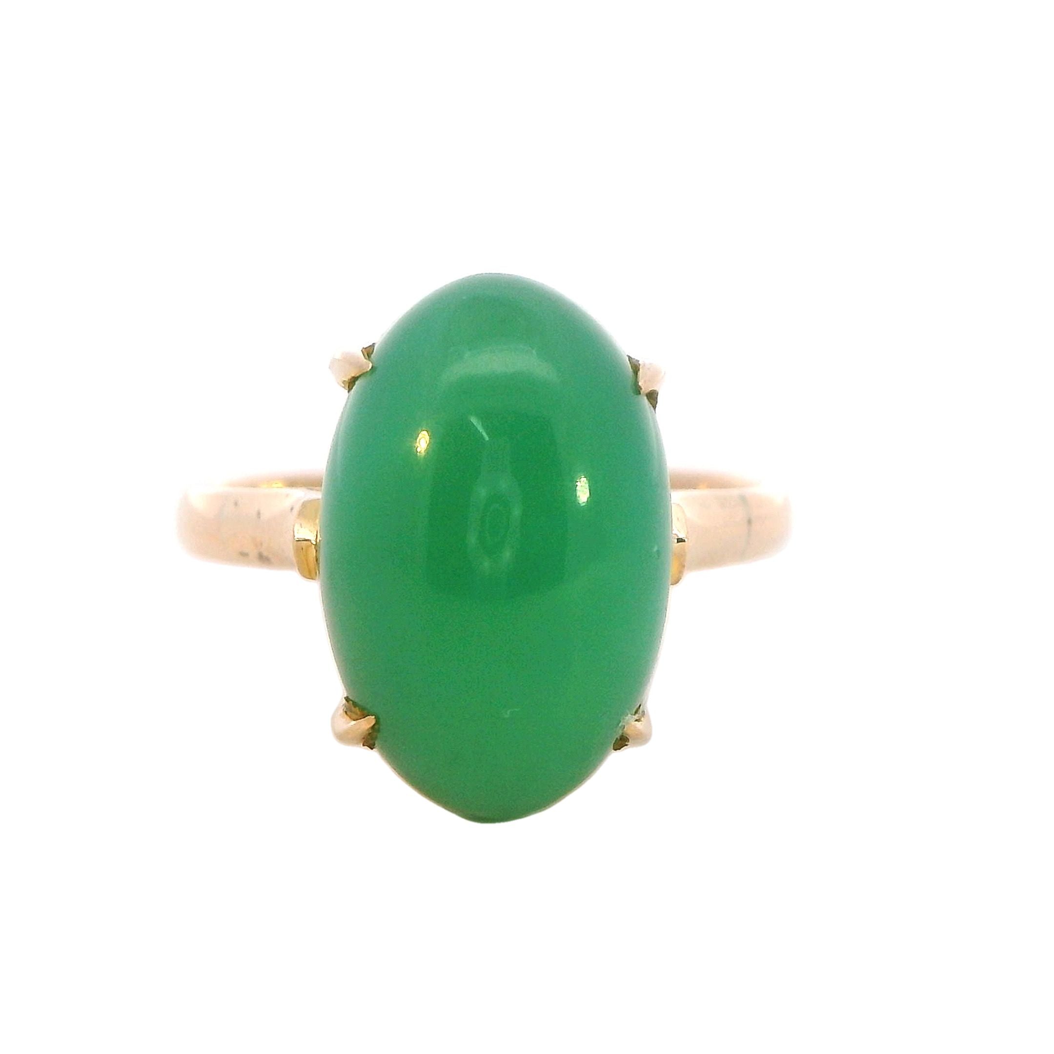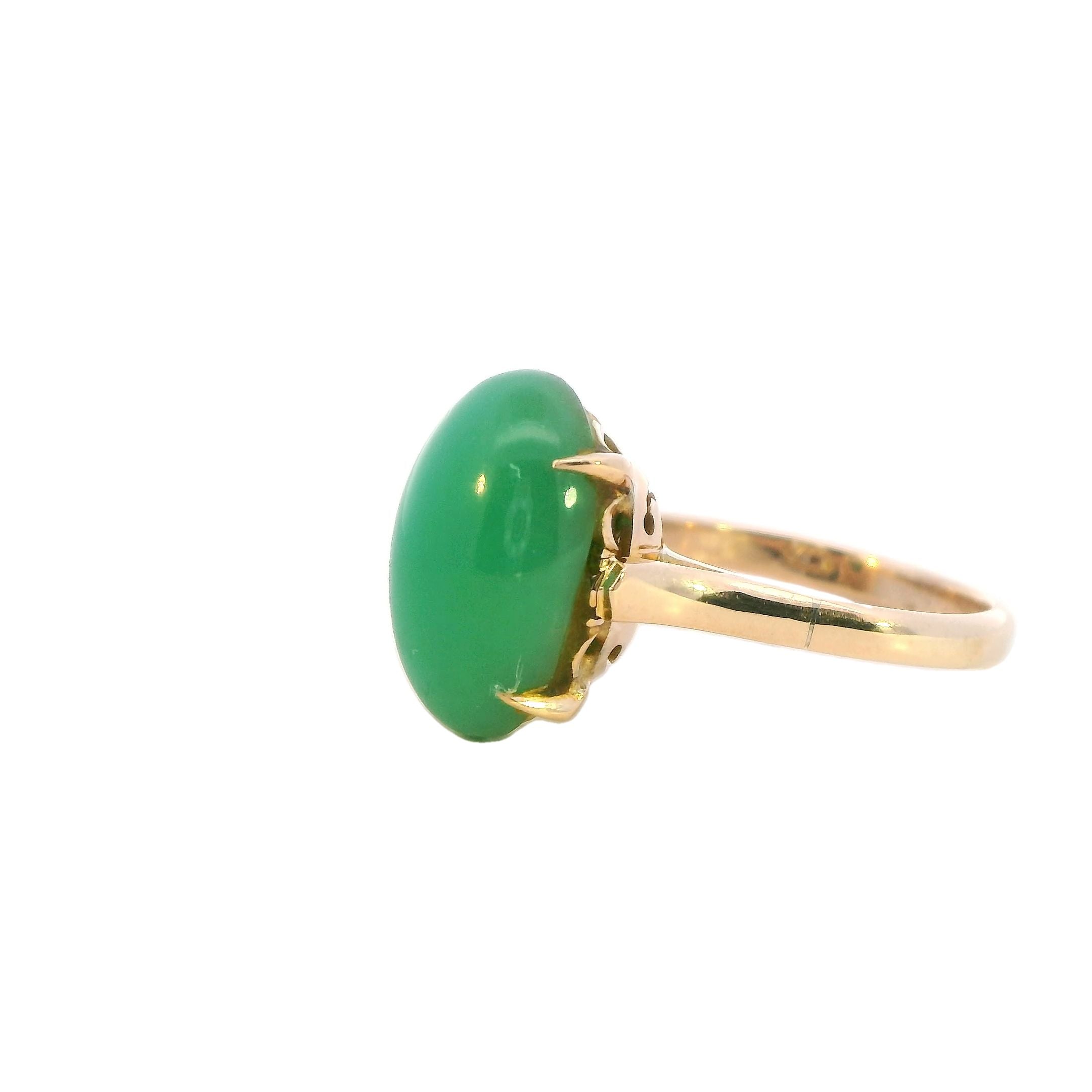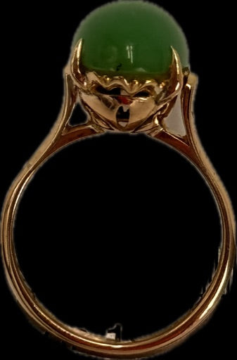 Description: This exquisite ring features a stunning 15mm x 10mm high domed cabochon of treated jadeite, set in a beautifully designed 14K yellow gold band. The jadeite stone, known for its rich green hue and smooth texture, is claw mounted, securely held by square flow-up shoulders on a 2.2mm rounded shank.