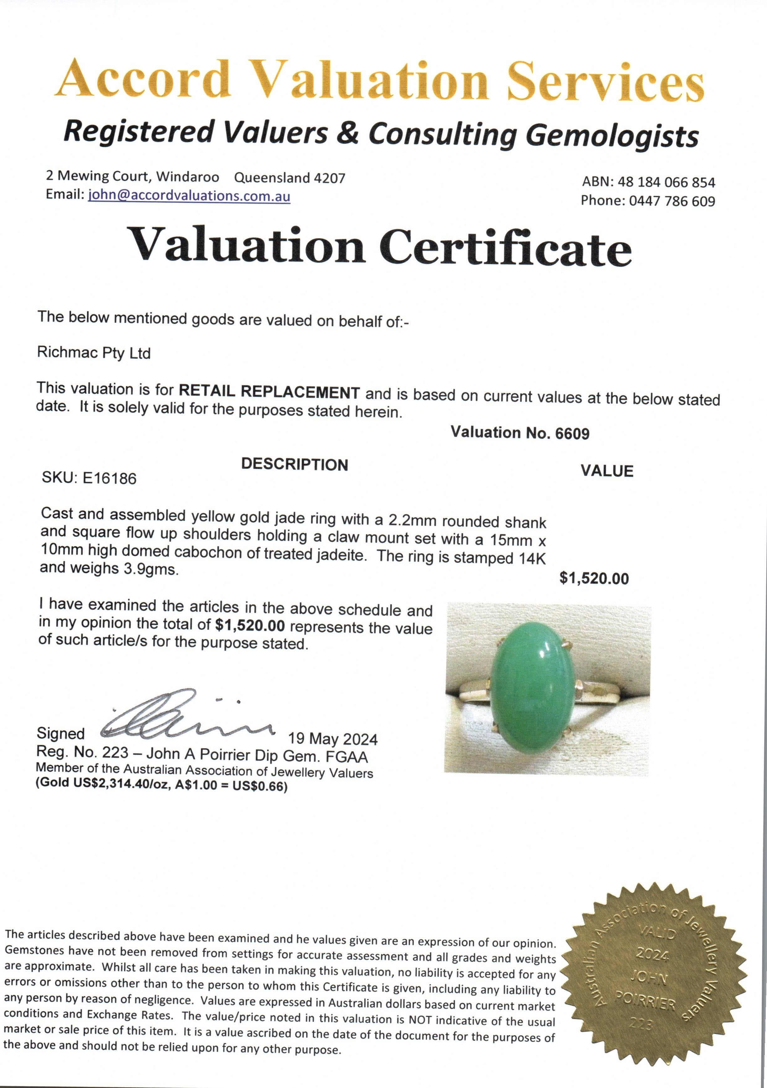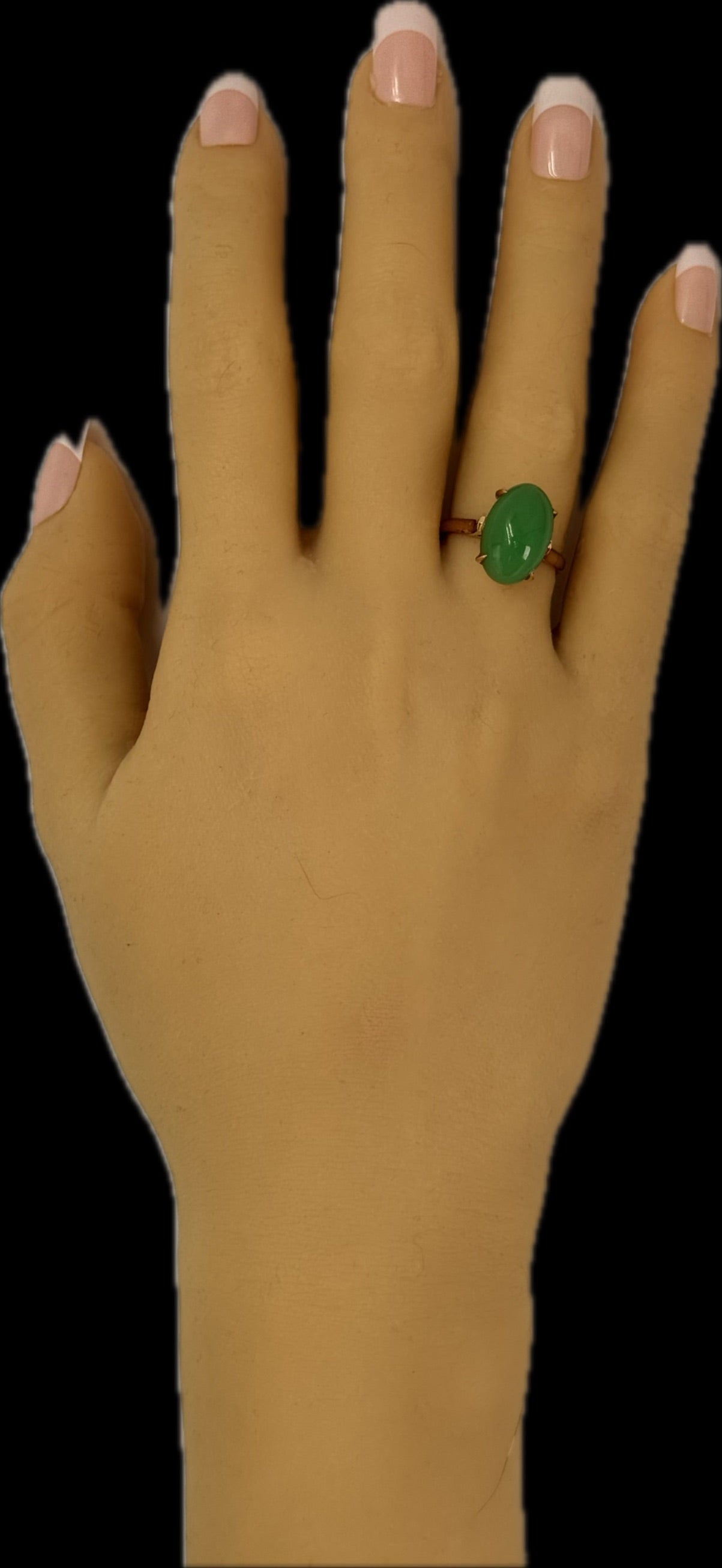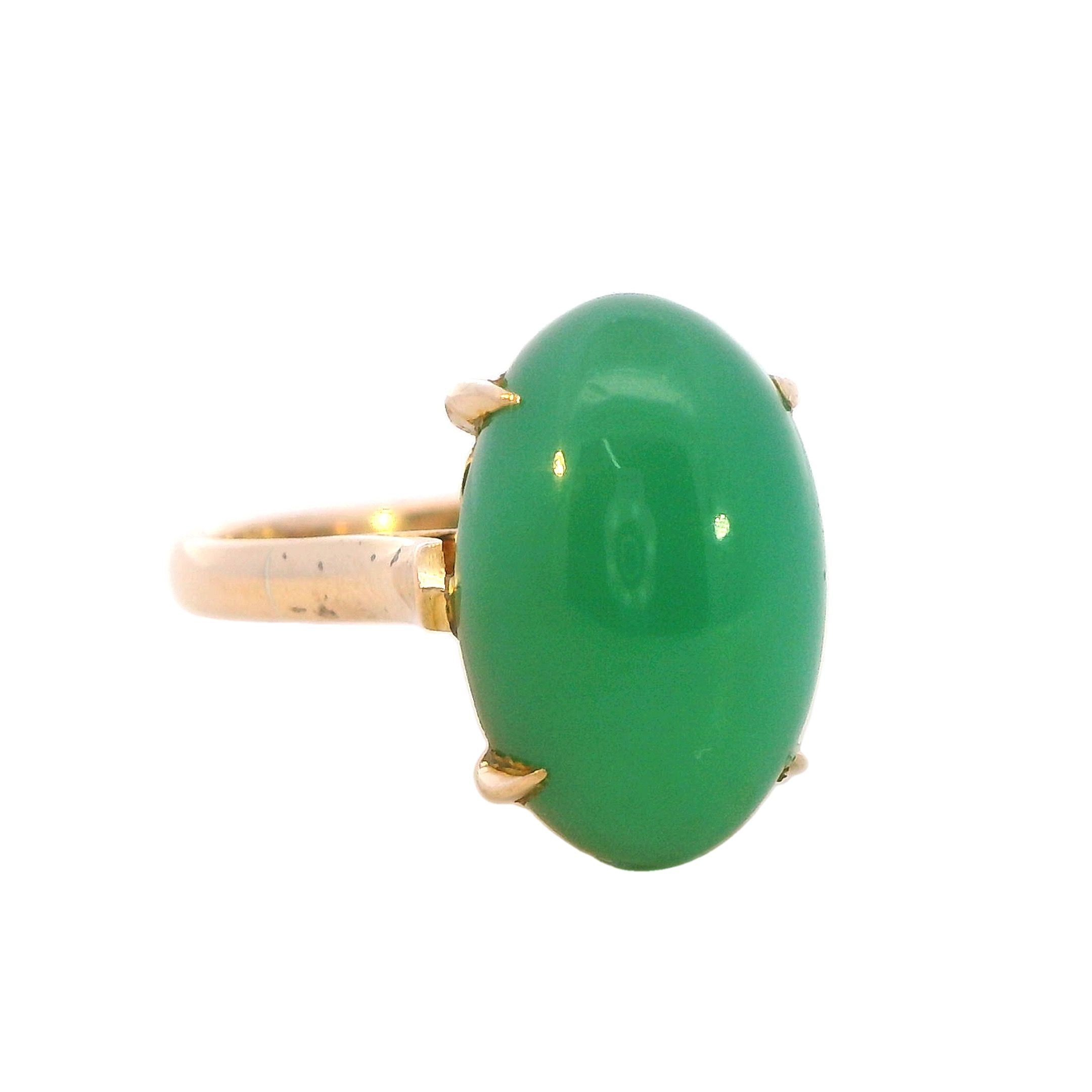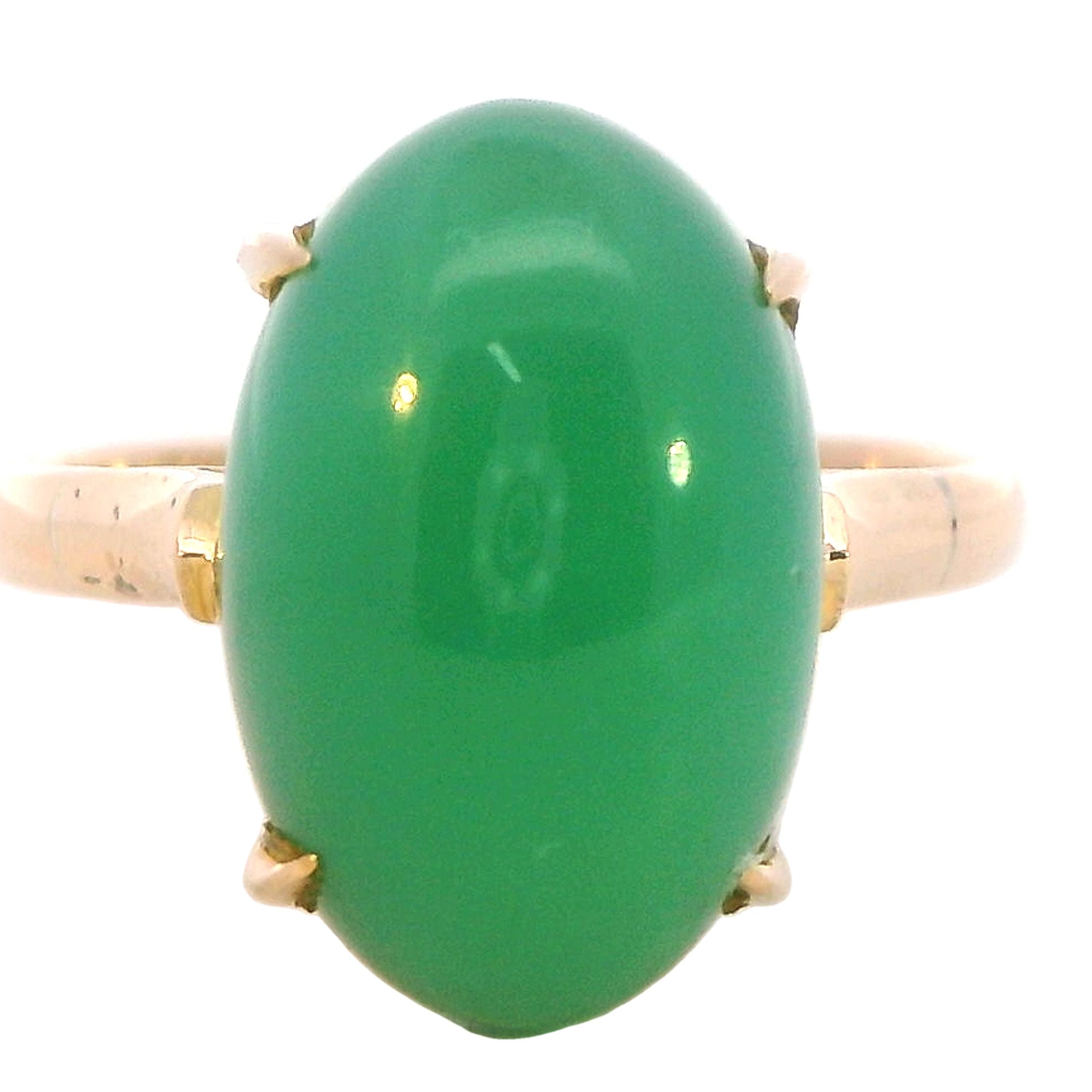 Description: This exquisite ring features a stunning 15mm x 10mm high domed cabochon of treated jadeite, set in a beautifully designed 14K yellow gold band. The jadeite stone, known for its rich green hue and smooth texture, is claw mounted, securely held by square flow-up shoulders on a 2.2mm rounded shank.