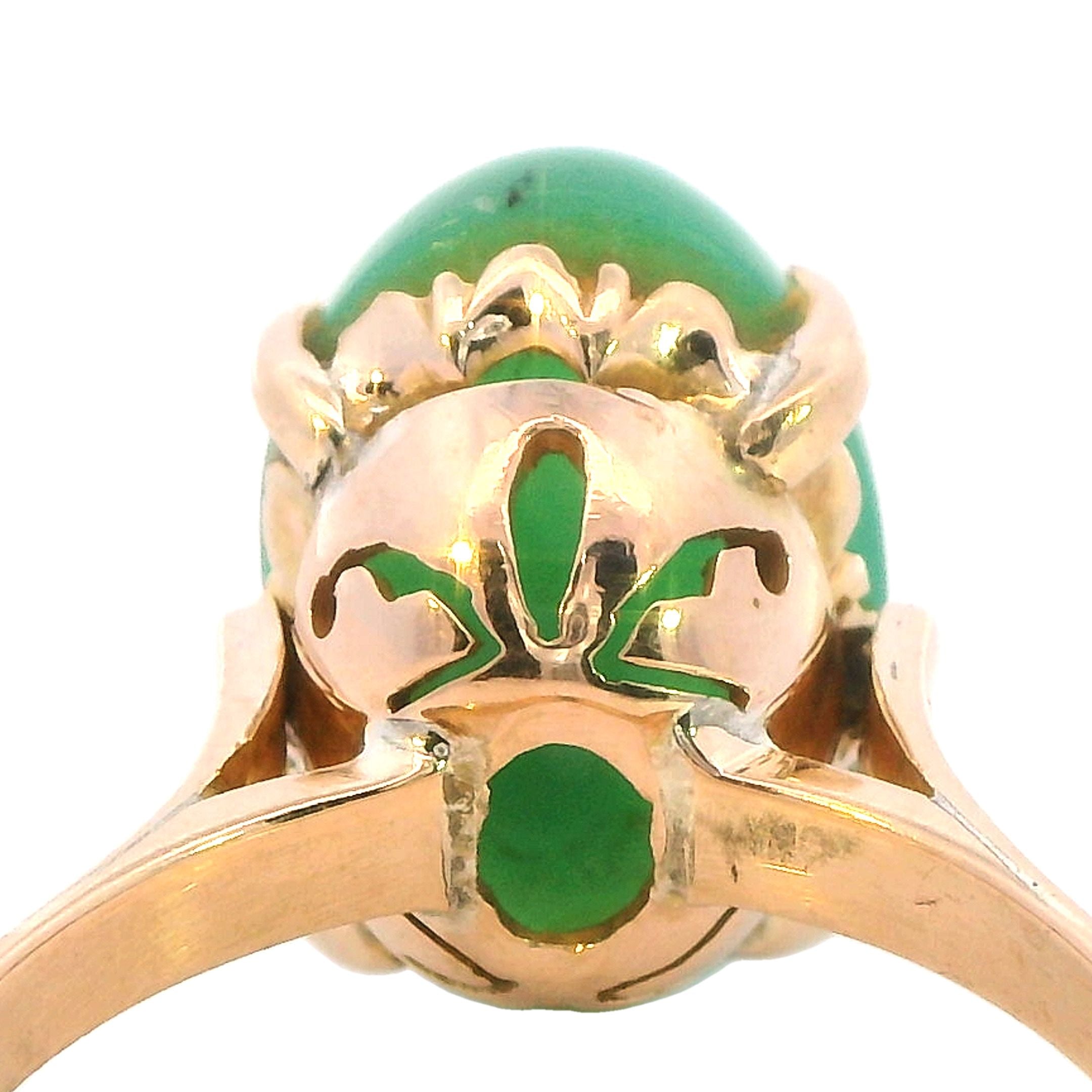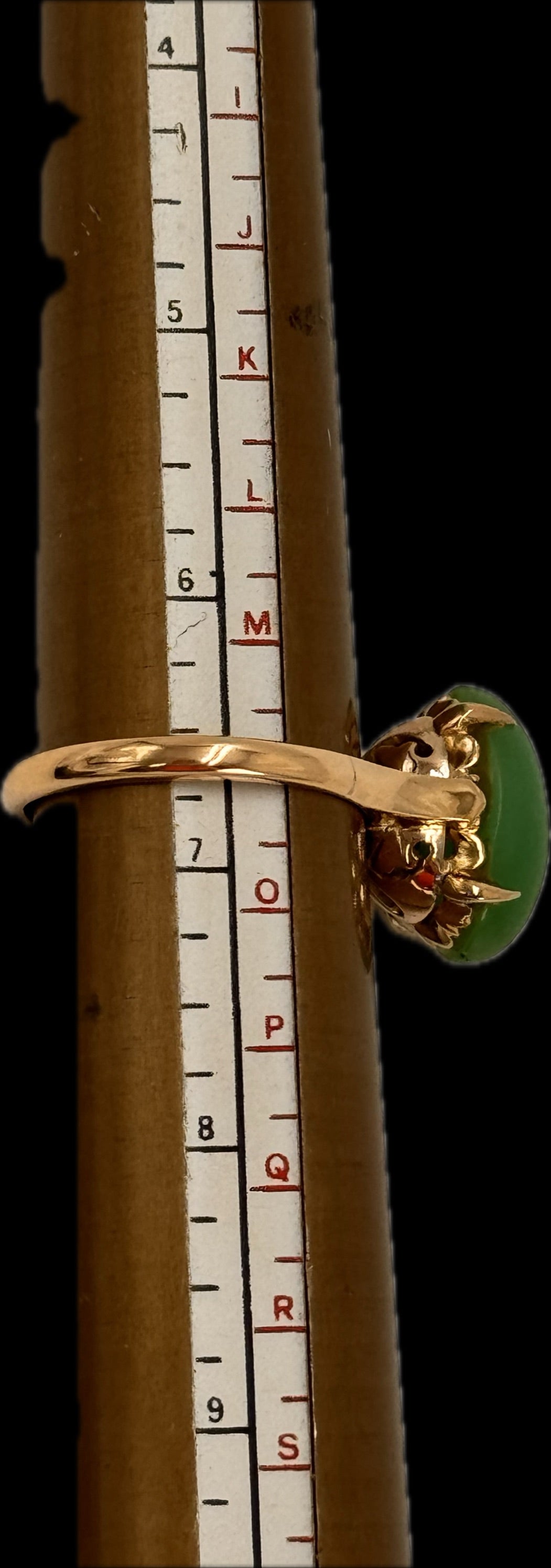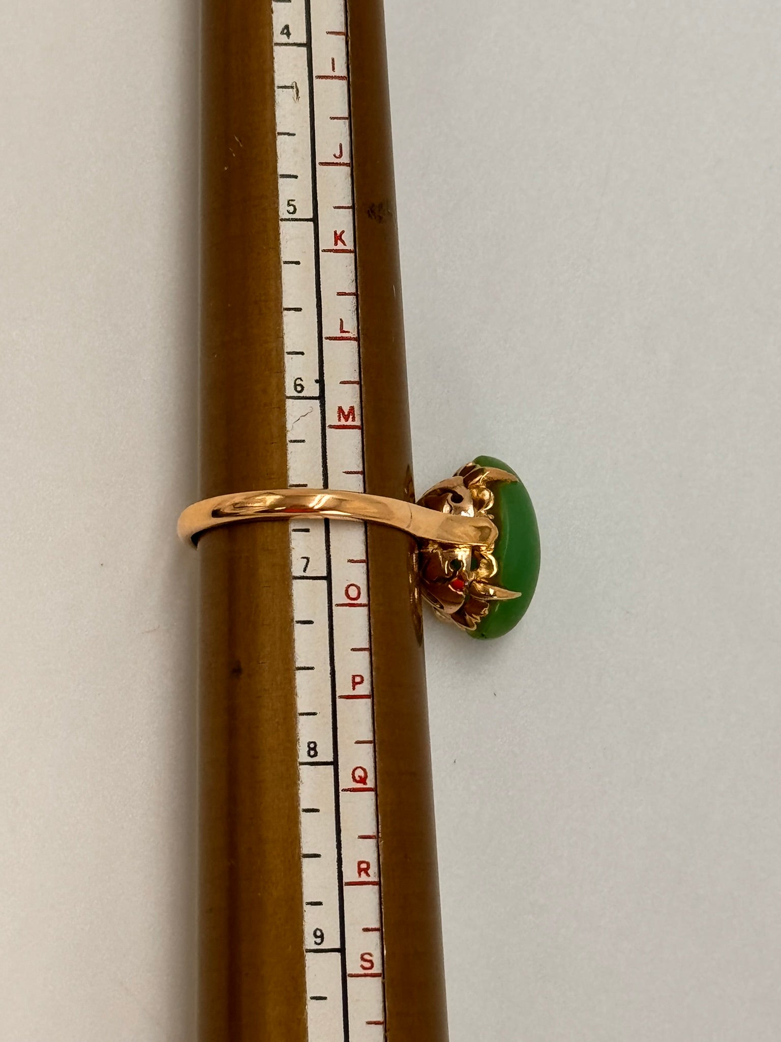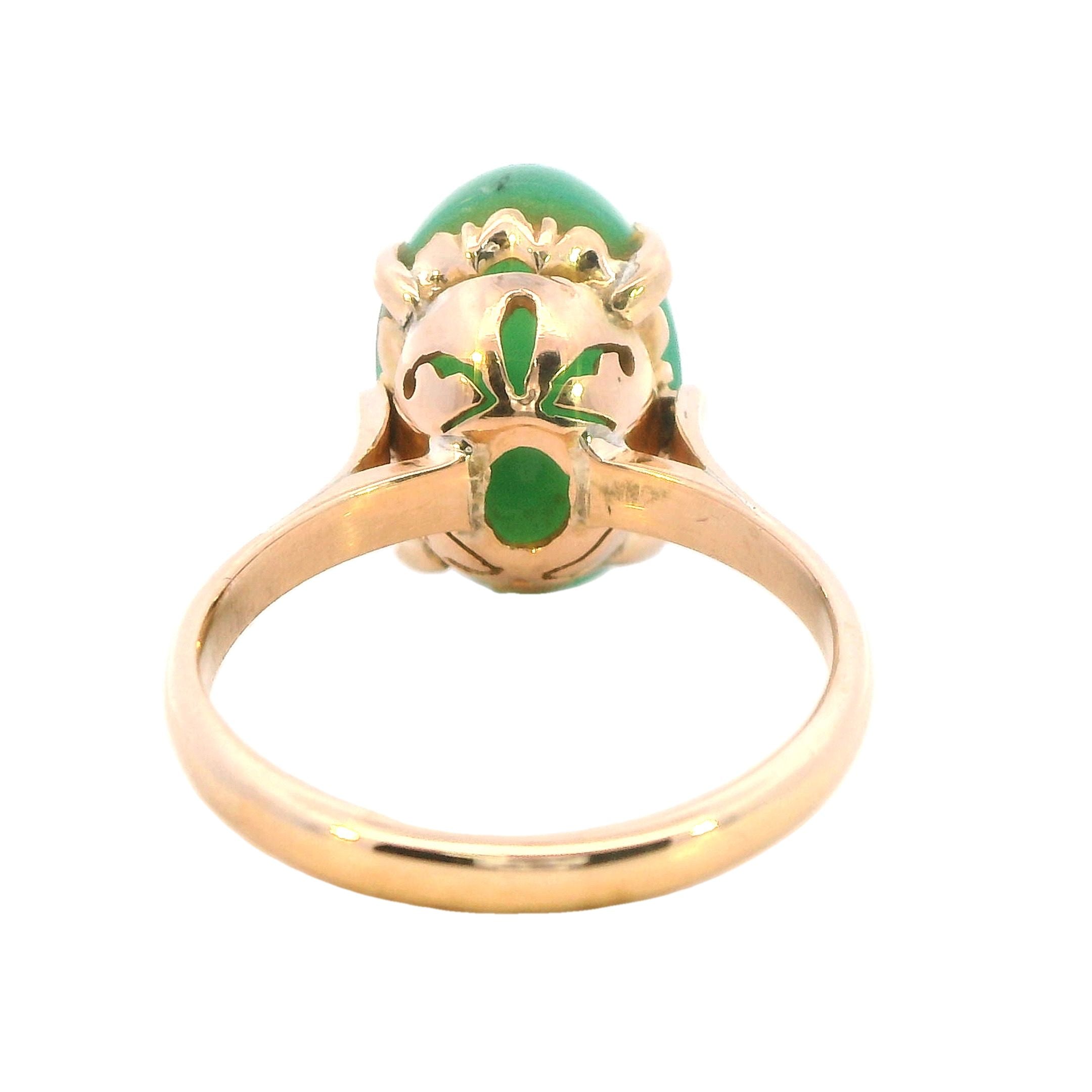 Description: This exquisite ring features a stunning 15mm x 10mm high domed cabochon of treated jadeite, set in a beautifully designed 14K yellow gold band. The jadeite stone, known for its rich green hue and smooth texture, is claw mounted, securely held by square flow-up shoulders on a 2.2mm rounded shank.