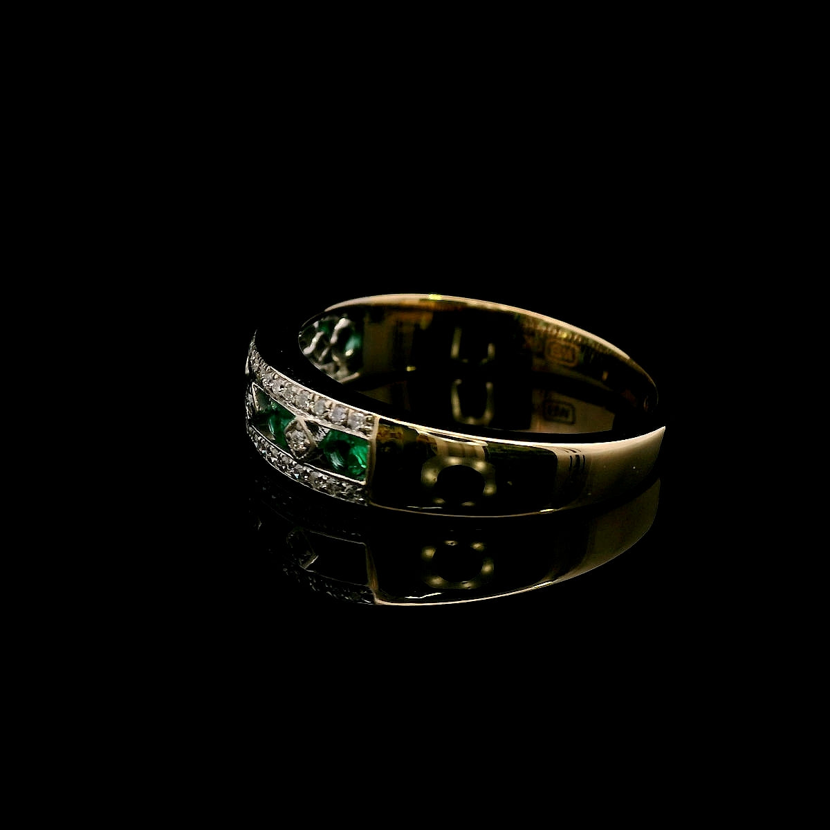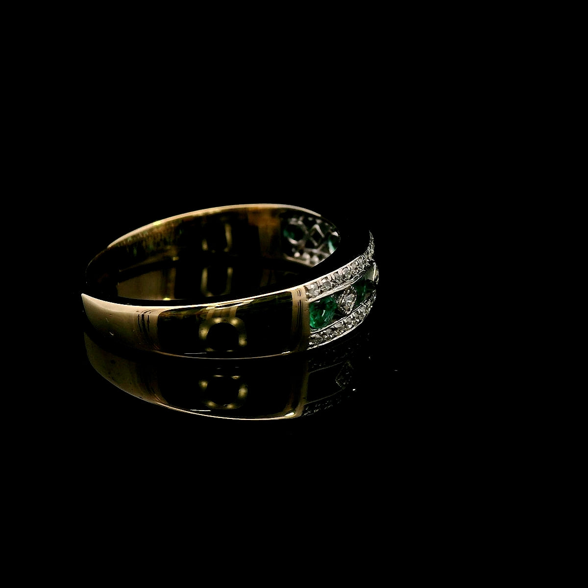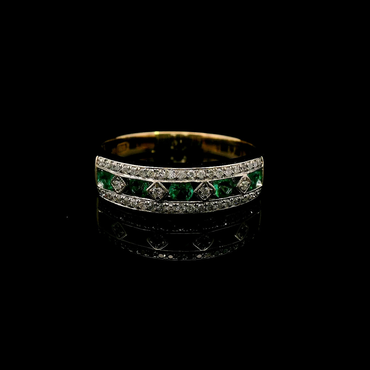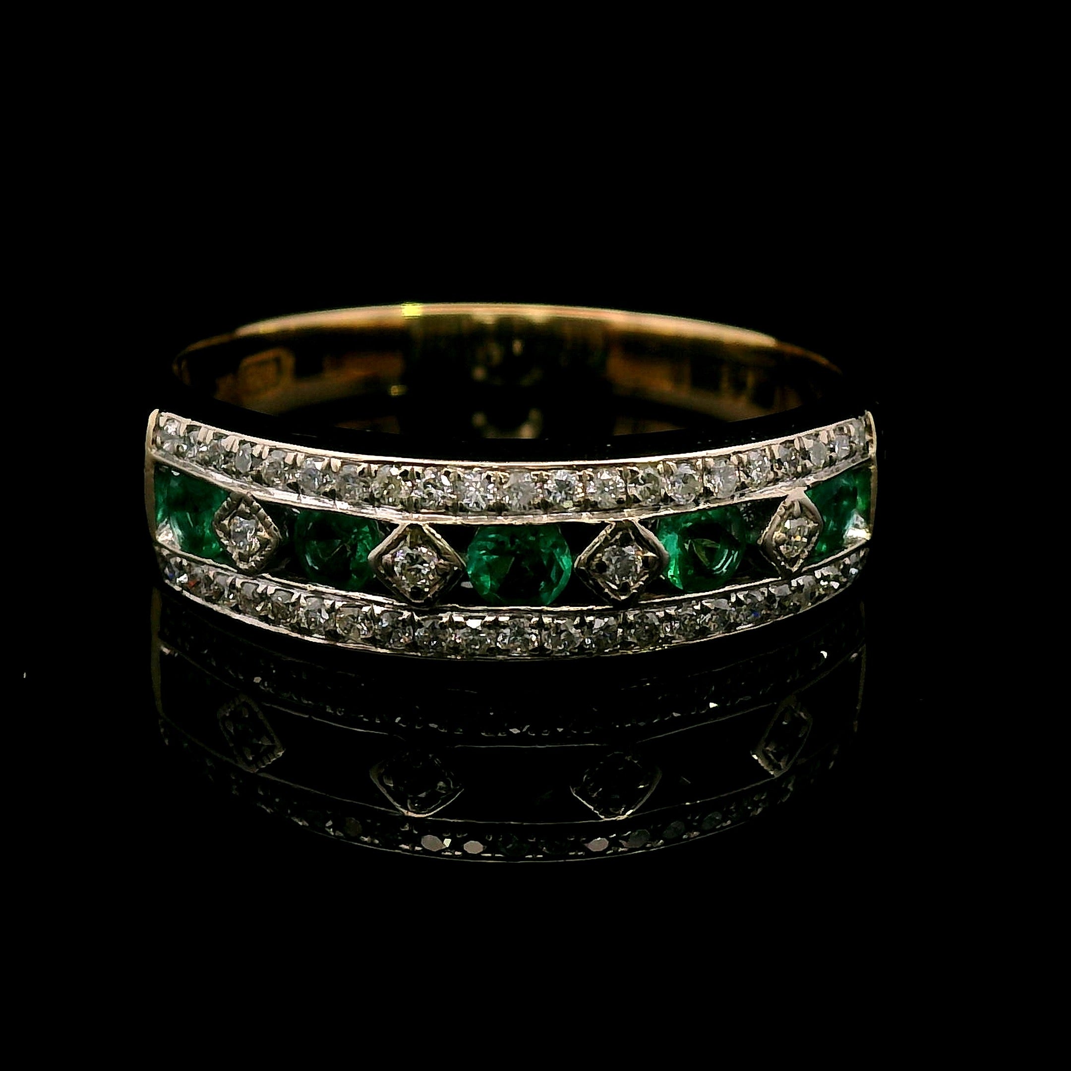 ThisΒ beautiful 9ct yellow & white gold Emerald & Diamond ringΒ is a true celebration of classic elegance and refined craftsmanship. The design featuresΒ five stunning emeralds,Β channel-setΒ in the center, interspersed withΒ four brilliant-cut diamondsΒ set diagonally in aΒ square grain setting. Enhancing the brilliance,Β an additional 42 diamondsΒ are delicately grain-set along the white gold top, creating a dazzling effect.
