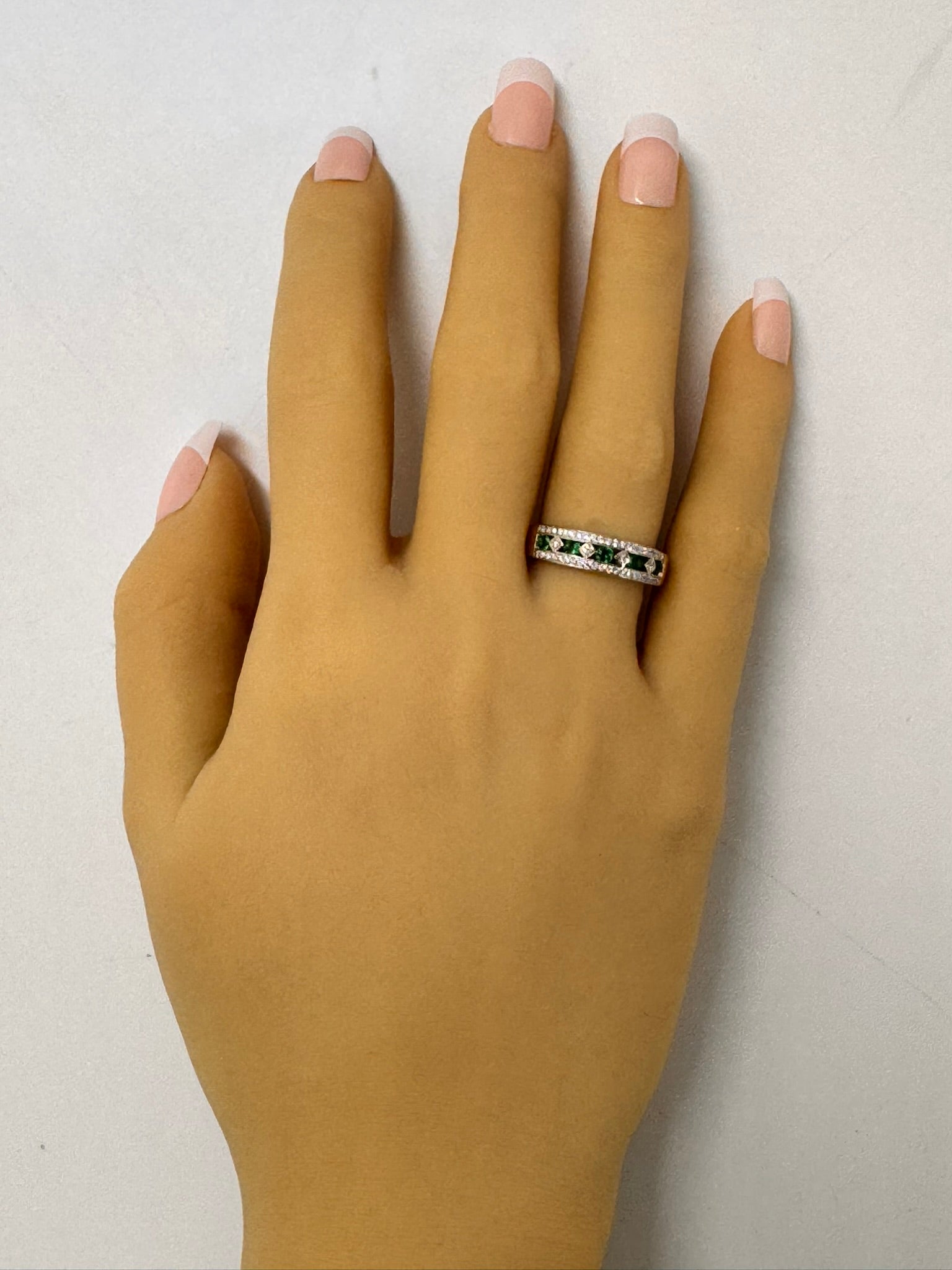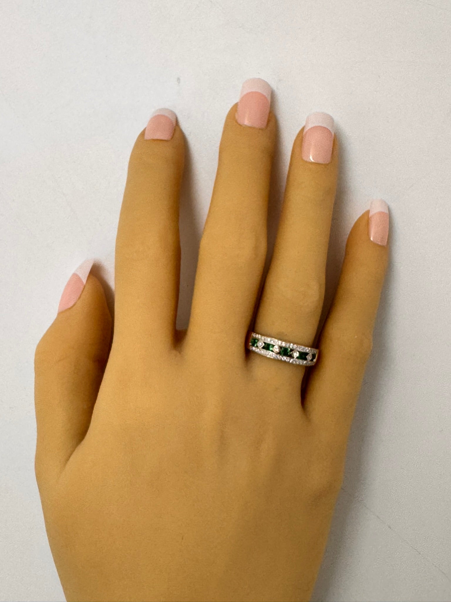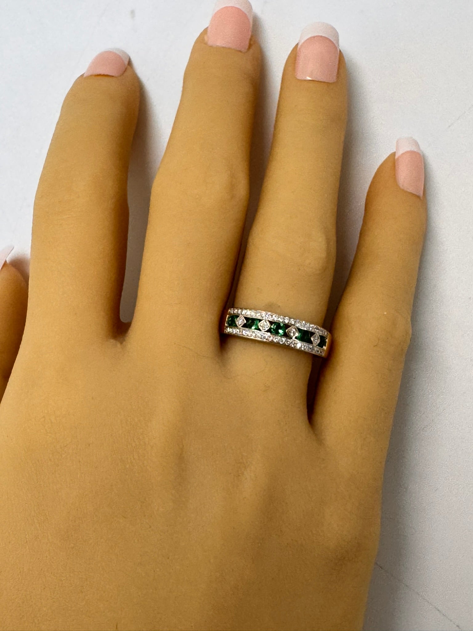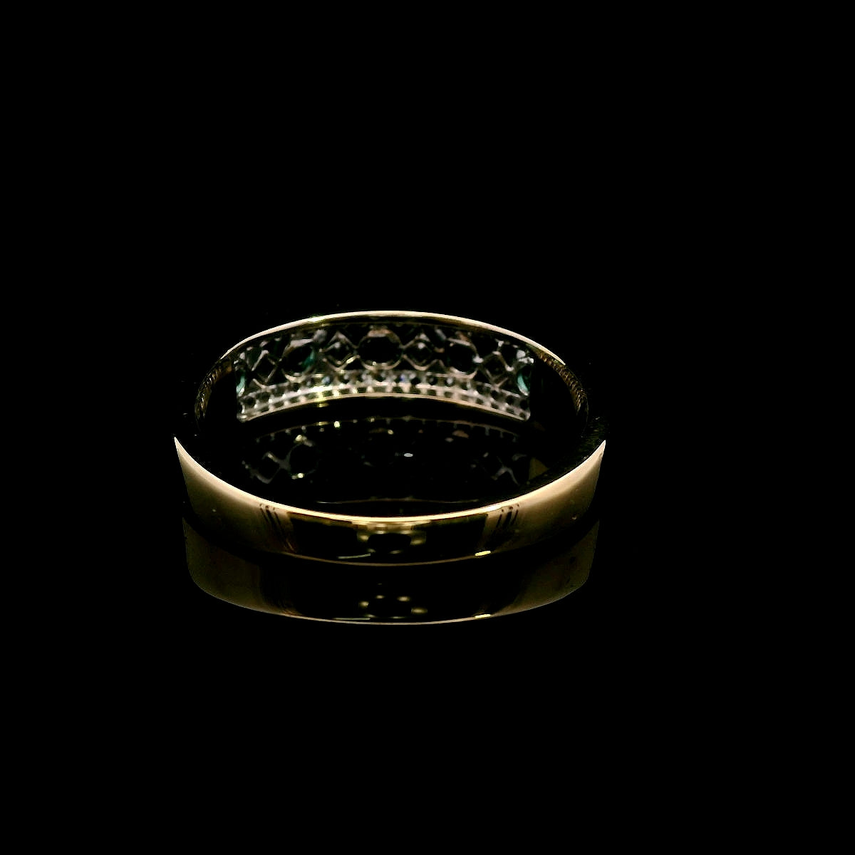 ThisΒ beautiful 9ct yellow & white gold Emerald & Diamond ringΒ is a true celebration of classic elegance and refined craftsmanship. The design featuresΒ five stunning emeralds,Β channel-setΒ in the center, interspersed withΒ four brilliant-cut diamondsΒ set diagonally in aΒ square grain setting. Enhancing the brilliance,Β an additional 42 diamondsΒ are delicately grain-set along the white gold top, creating a dazzling effect.