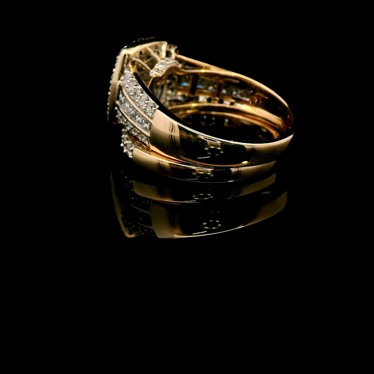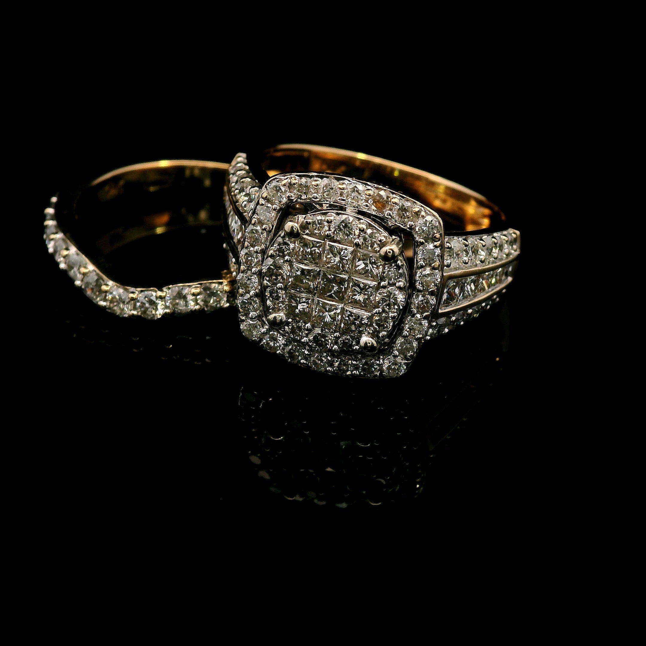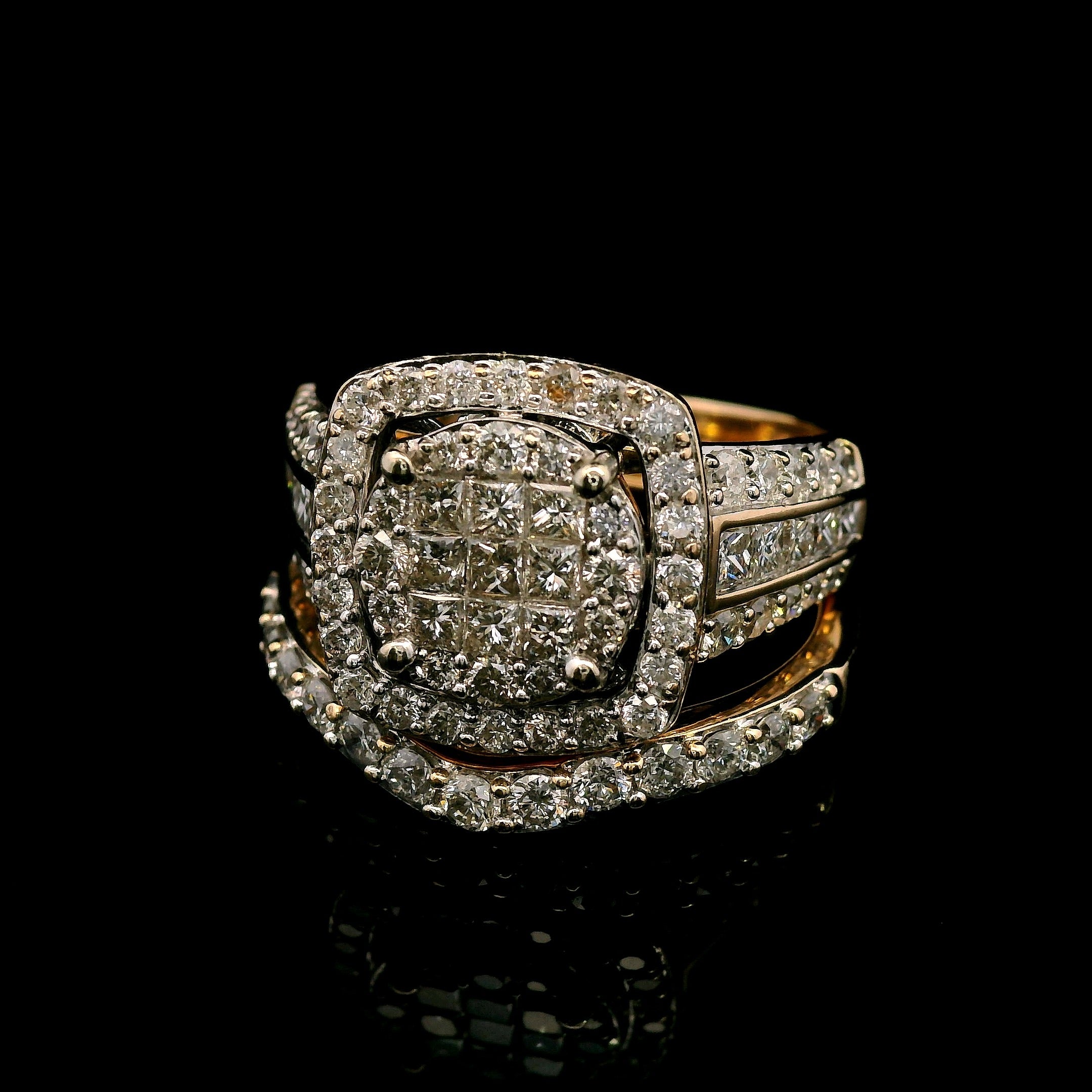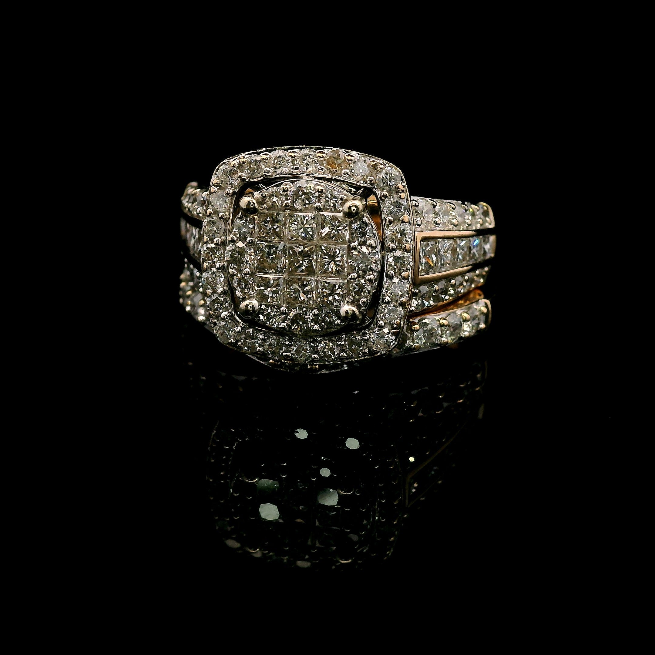- 9 Princess Cut Diamonds invisibly set in a square formation, creating a seamless and luminous centerpiece.