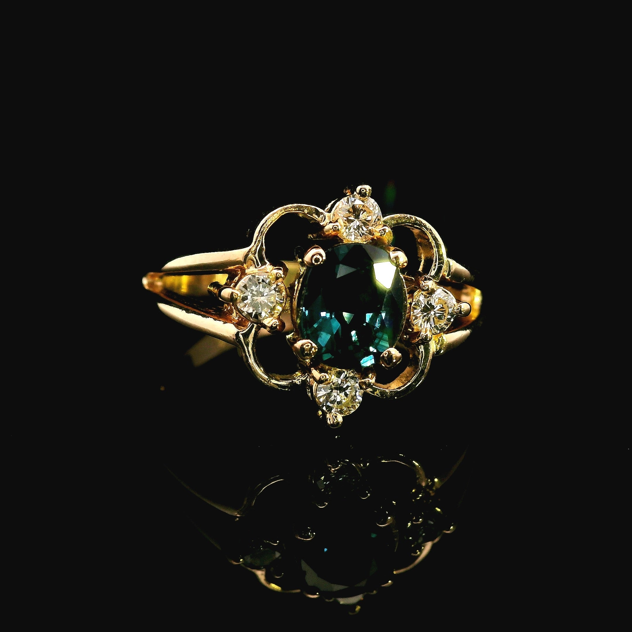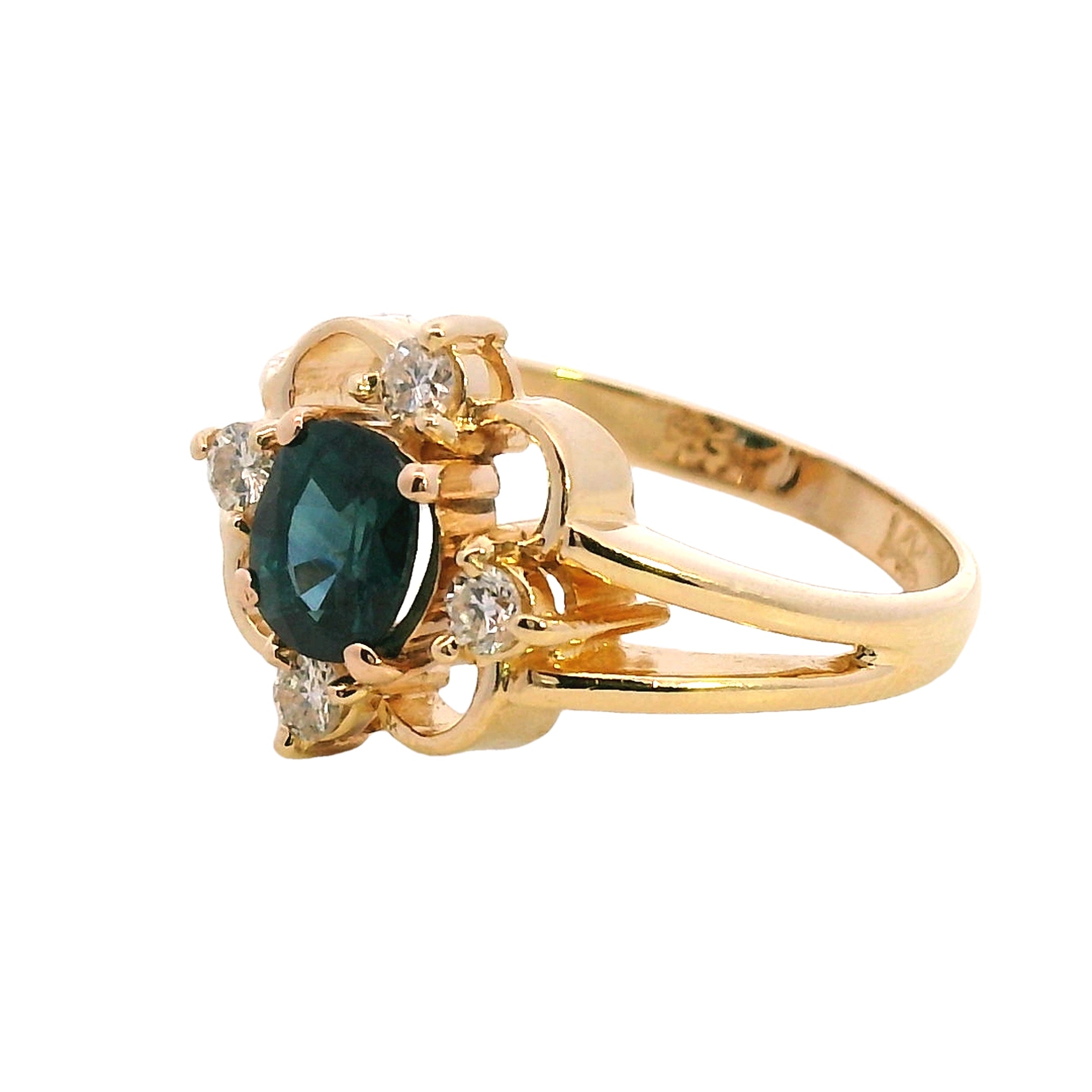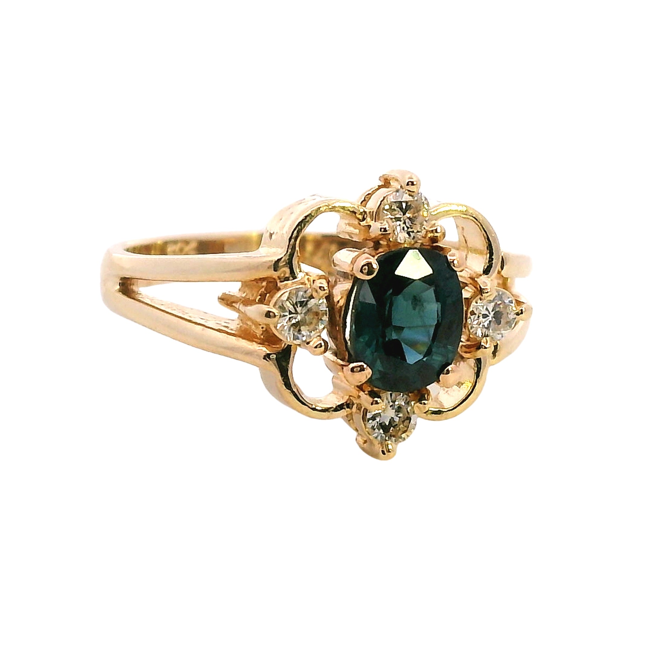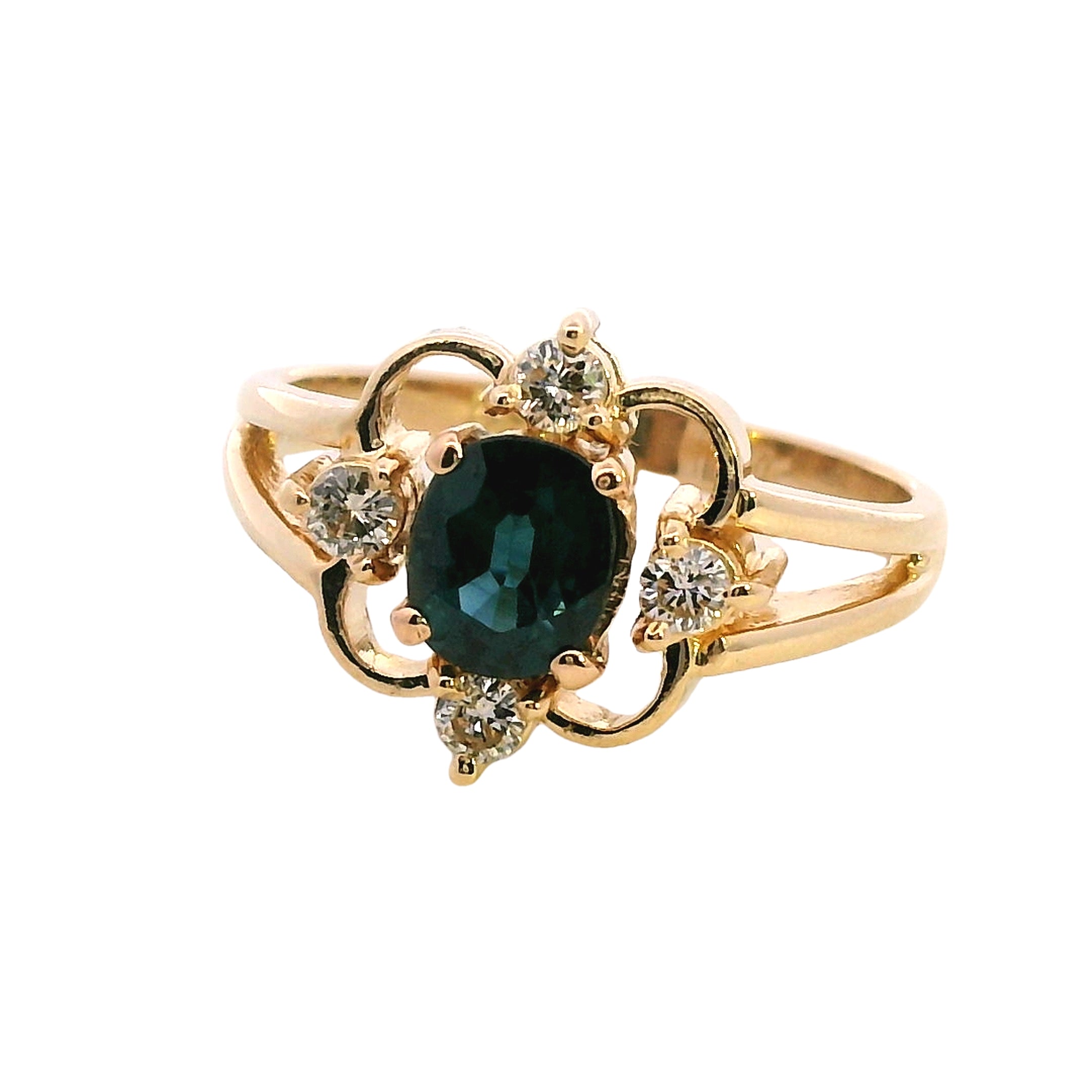 ThisΒ stunning 14ct yellow gold Sapphire & Diamond ringΒ is a true classic, featuring aΒ deep greenish-blue oval sapphire, beautifully accented byΒ four sparkling diamonds. Designed with aΒ scalloped wire surround and split shoulders, this elegant ring is perfect for those who appreciateΒ fine craftsmanship and timeless beauty.