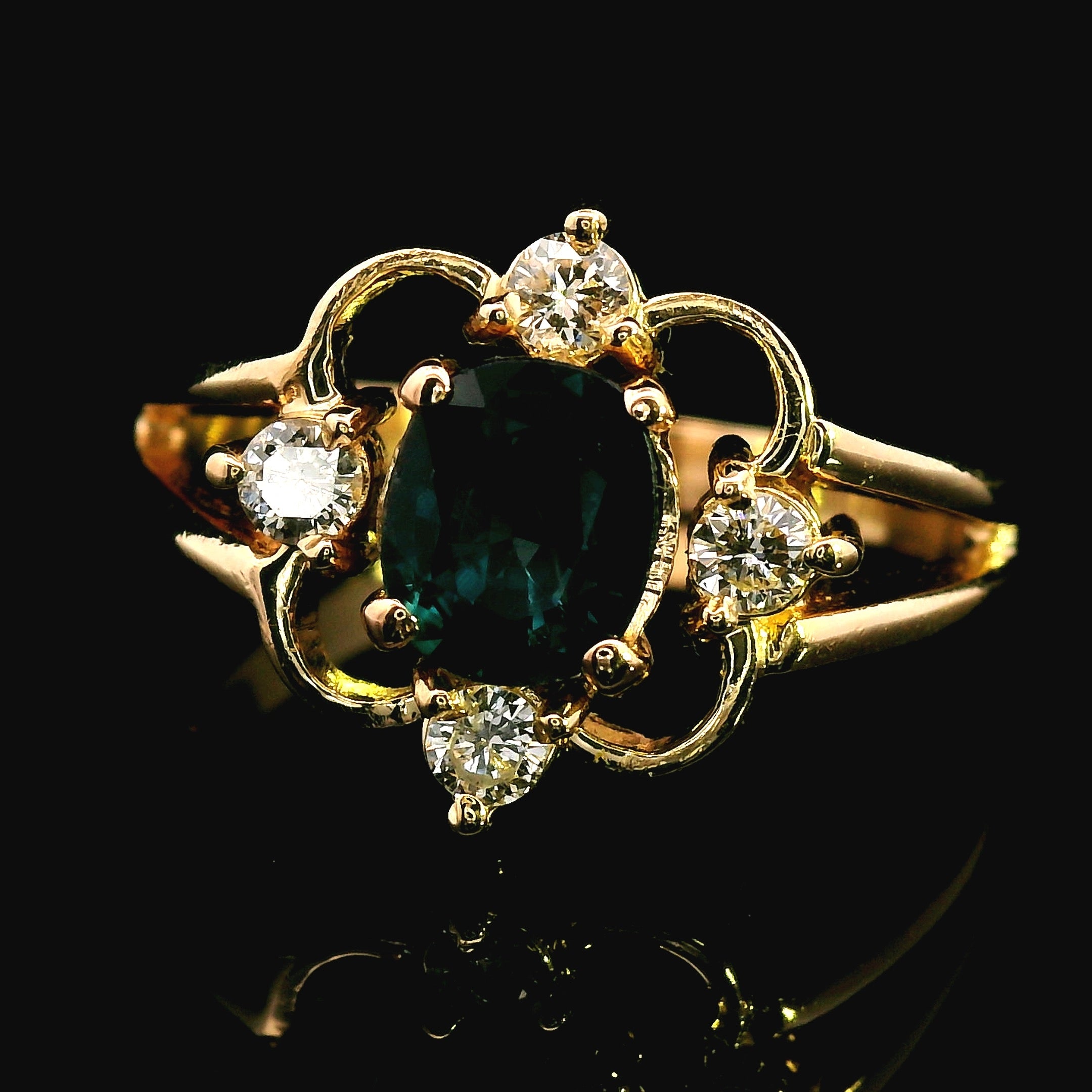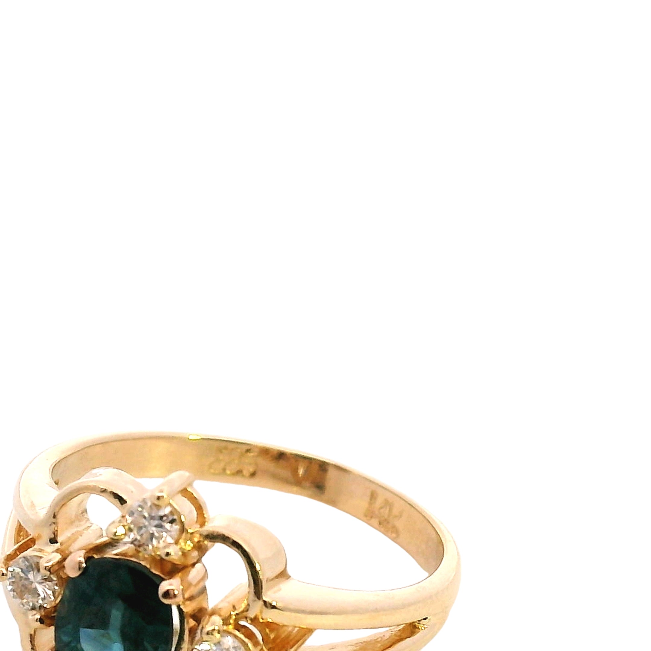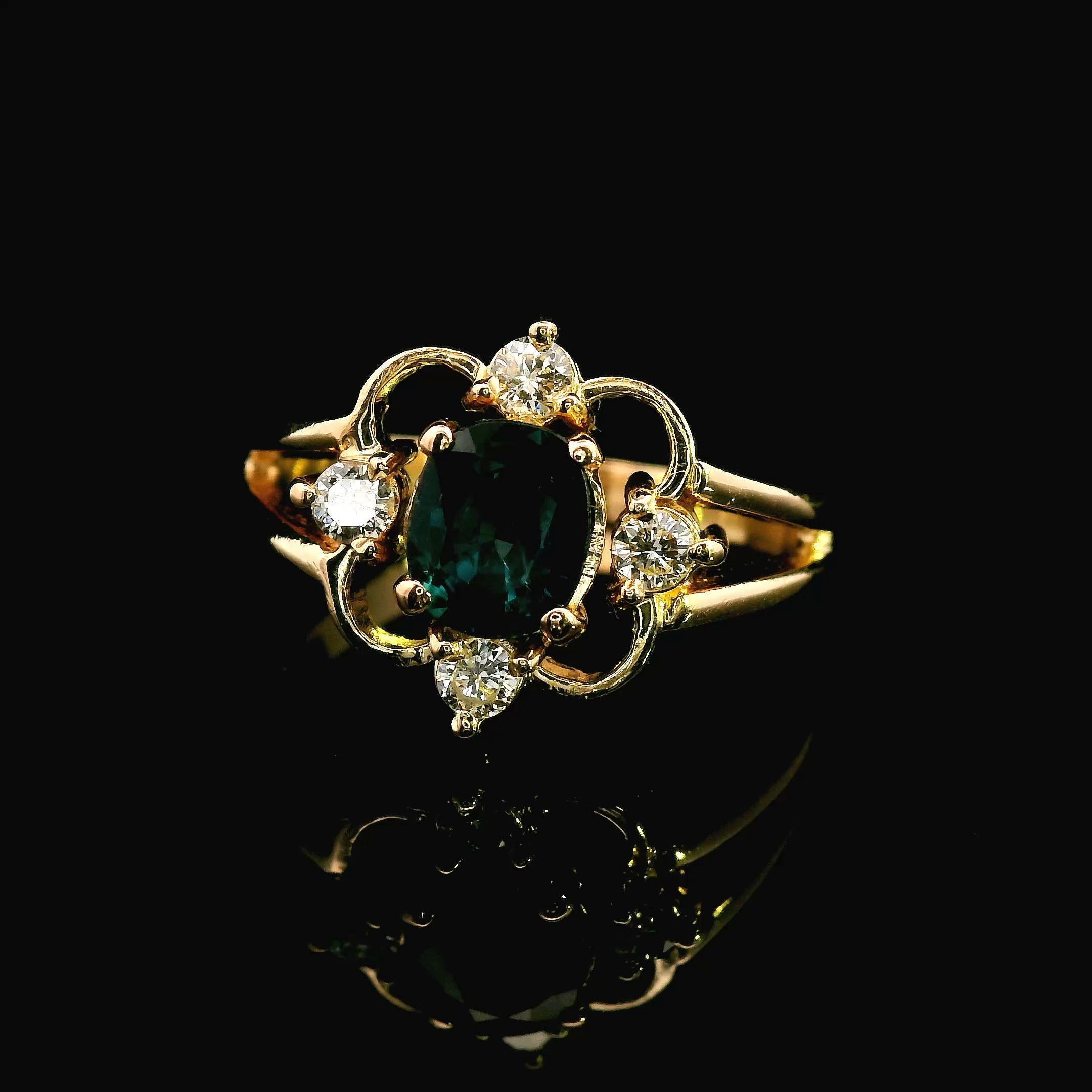 ThisΒ stunning 14ct yellow gold Sapphire & Diamond ringΒ is a true classic, featuring aΒ deep greenish-blue oval sapphire, beautifully accented byΒ four sparkling diamonds. Designed with aΒ scalloped wire surround and split shoulders, this elegant ring is perfect for those who appreciateΒ fine craftsmanship and timeless beauty.