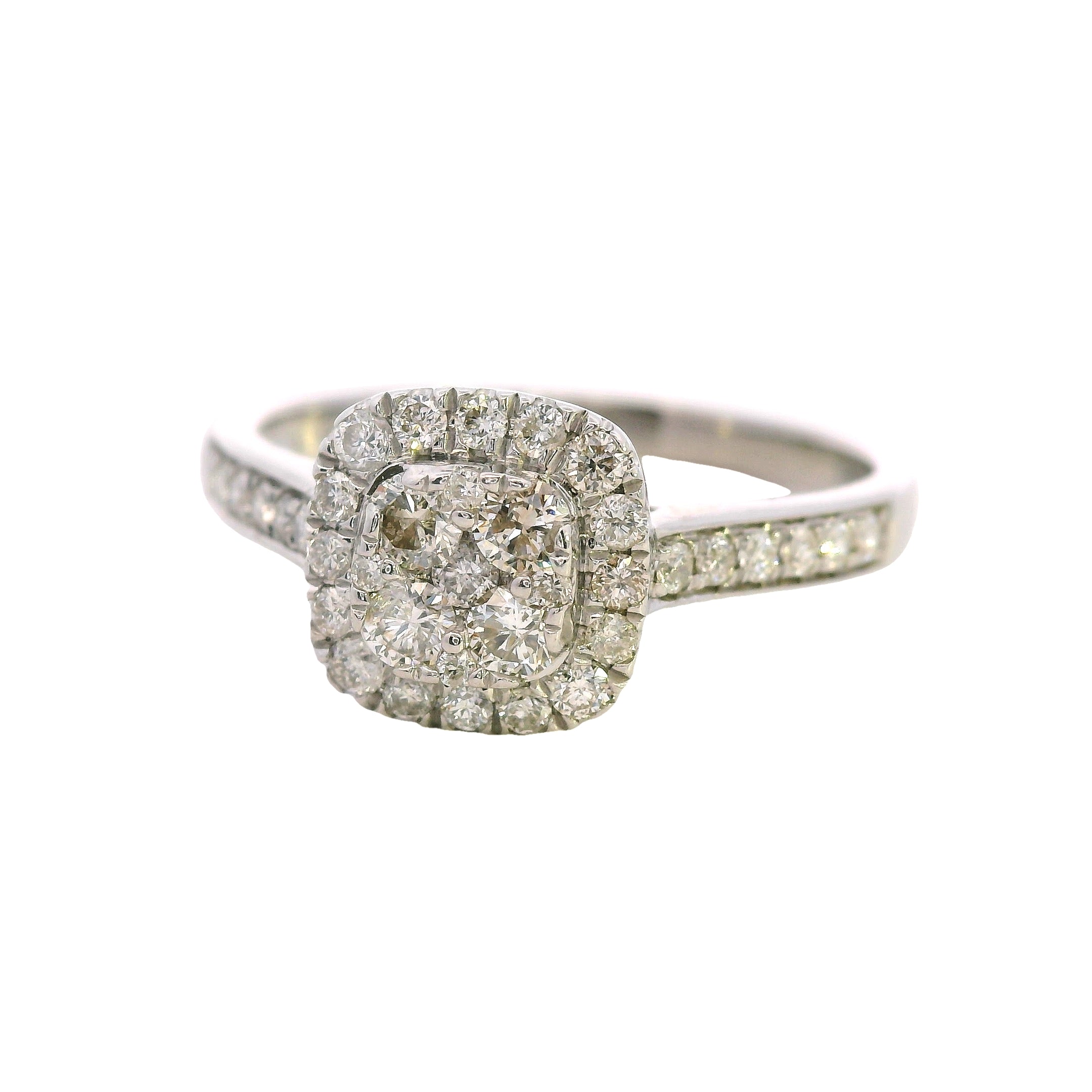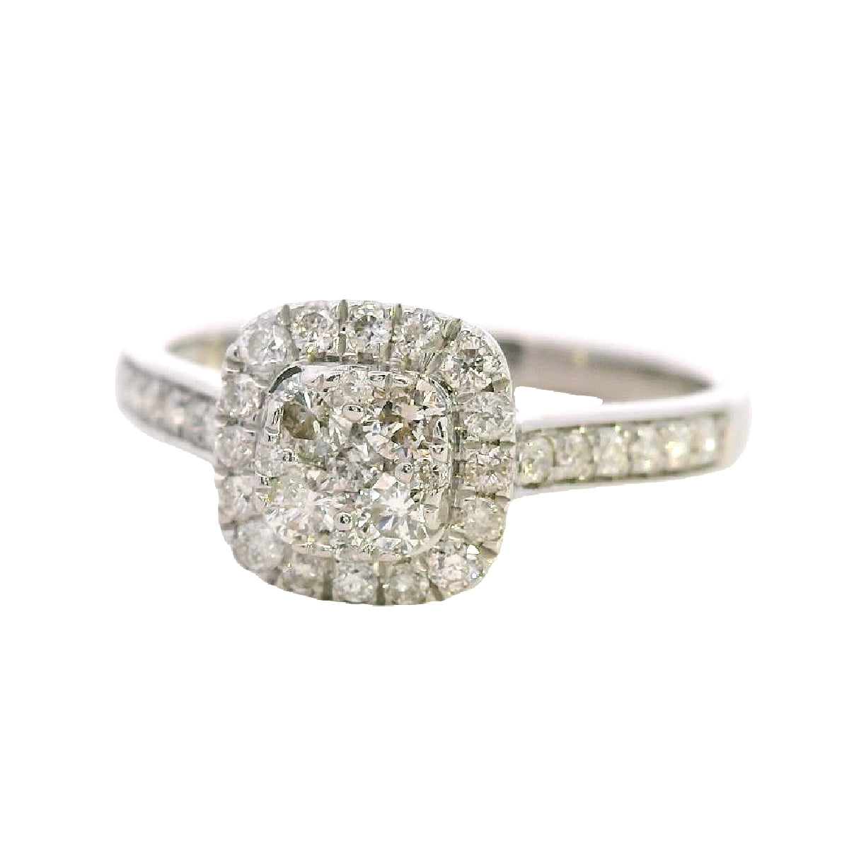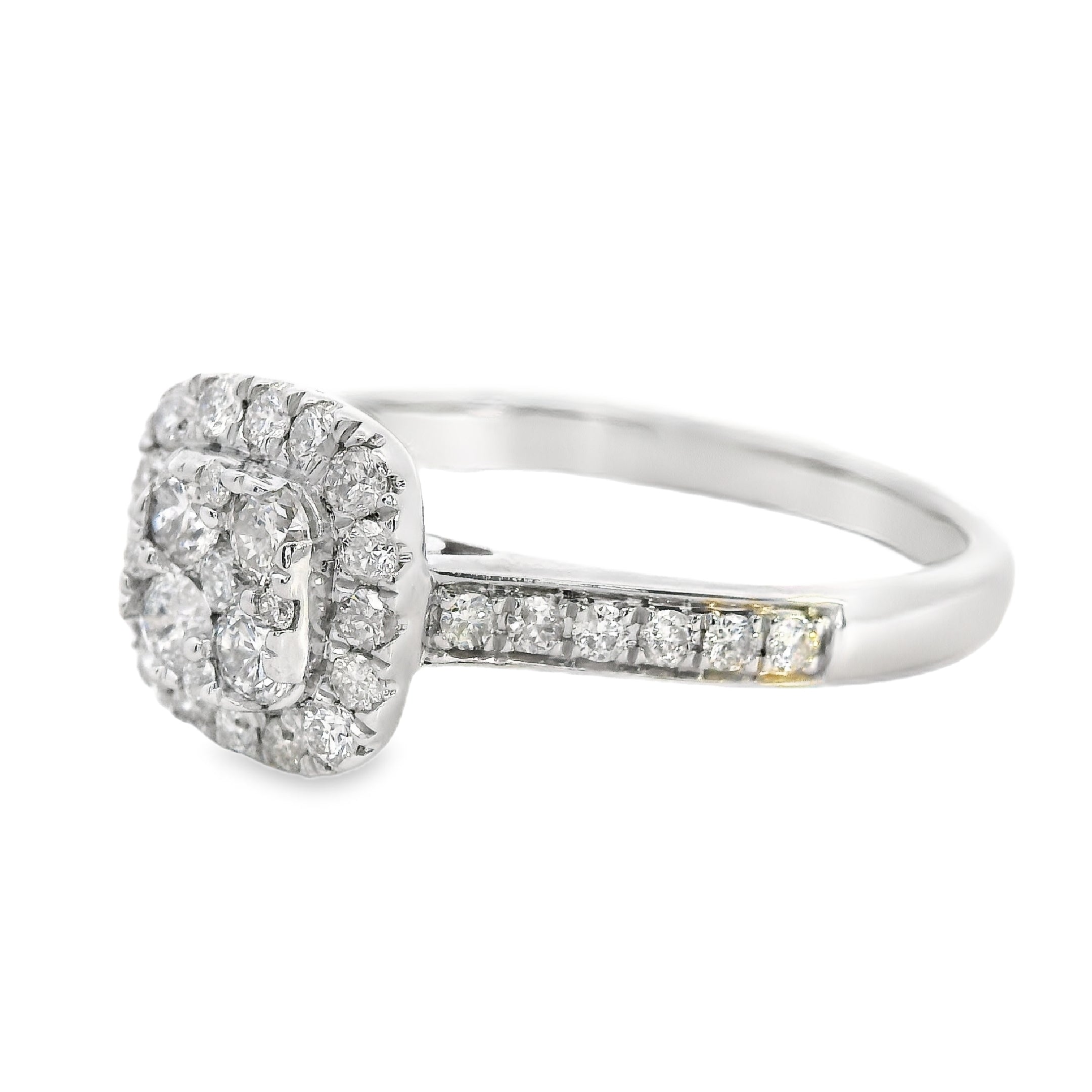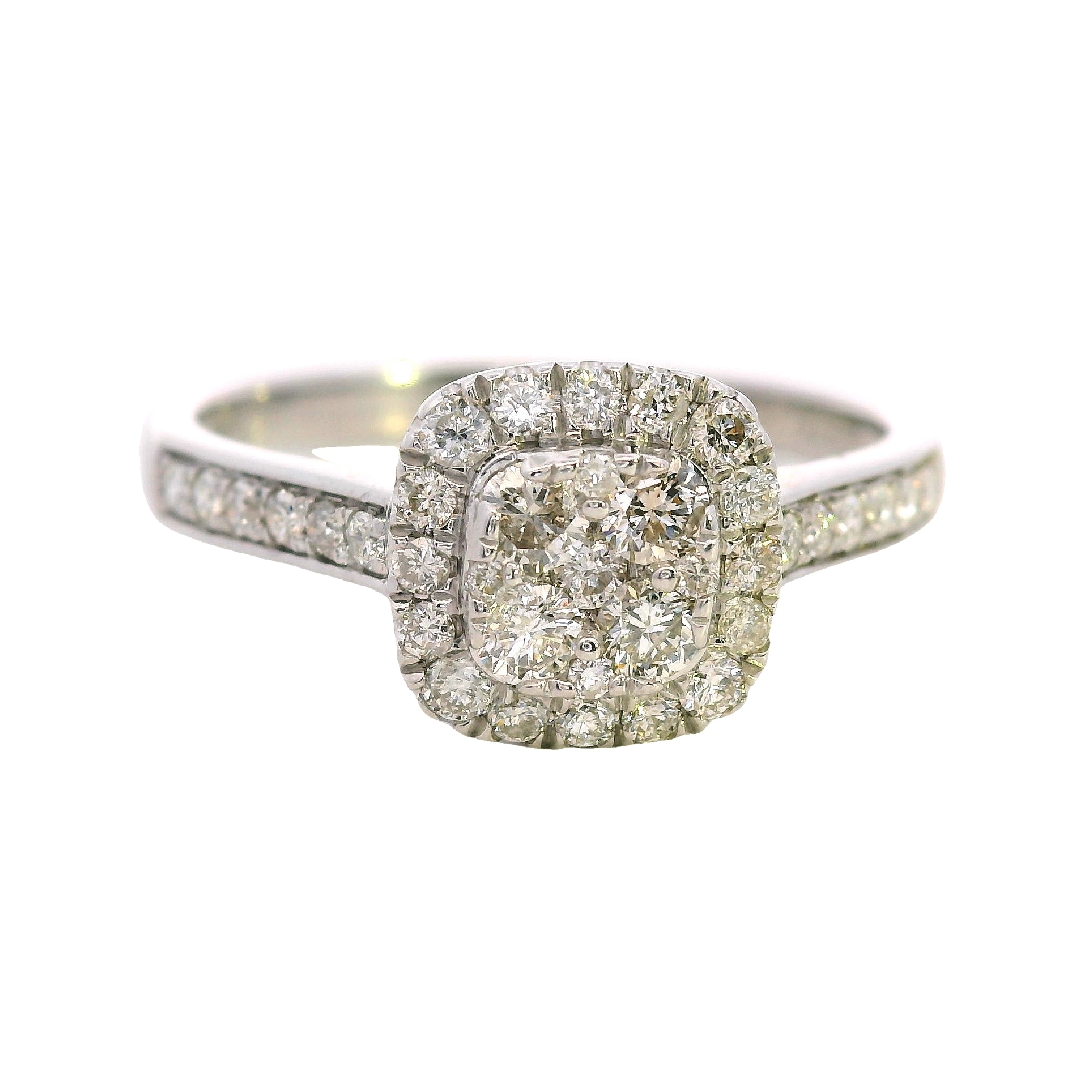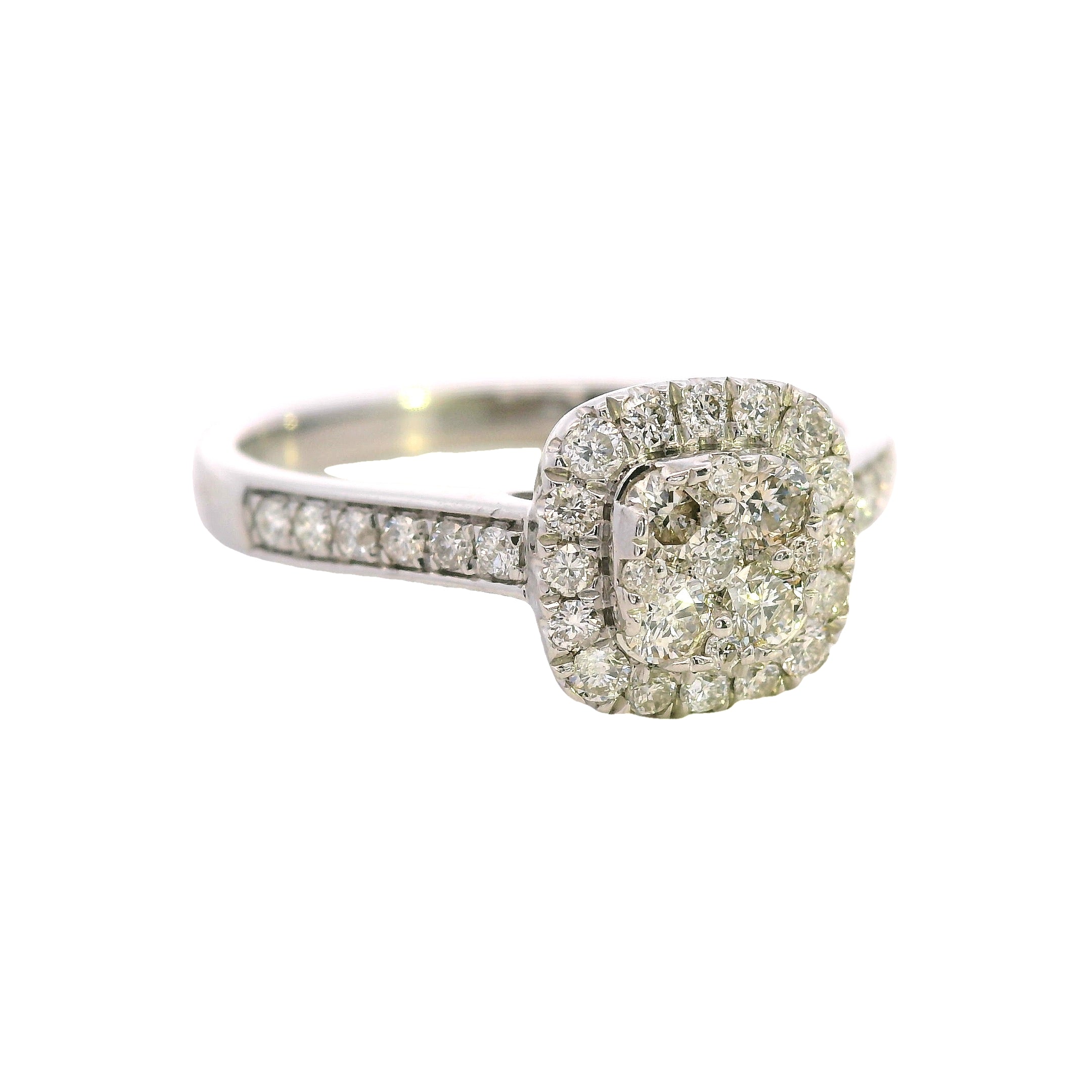This 9ct white gold ring showcases 37 dazzling round brilliant cut diamonds, carefully arranged in an intricate square cluster design for maximum brilliance. The invisible-set center stone is enhanced by a halo of sparkling diamonds, creating a truly mesmerizing piece. The wire scroll gallery adds an elegant touch, while the swept-up shoulders are adorned with additional diamonds, ensuring shimmer from every angle.