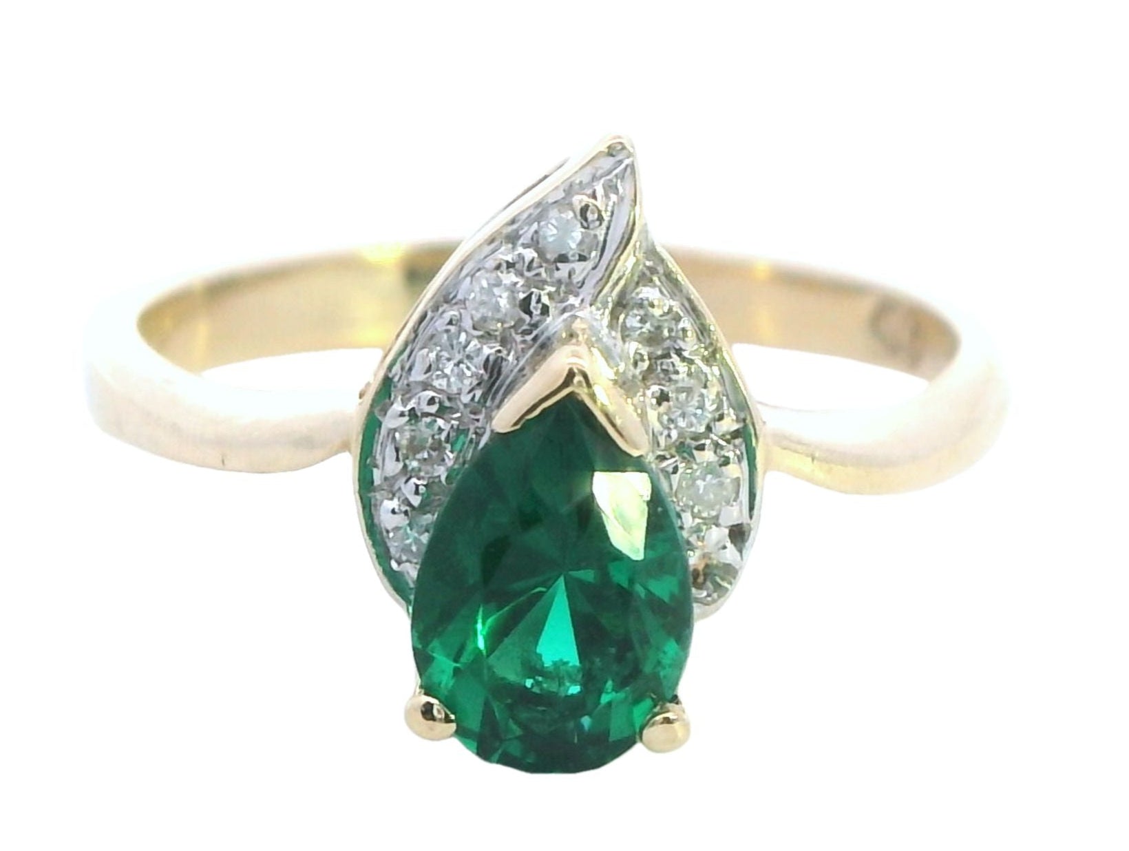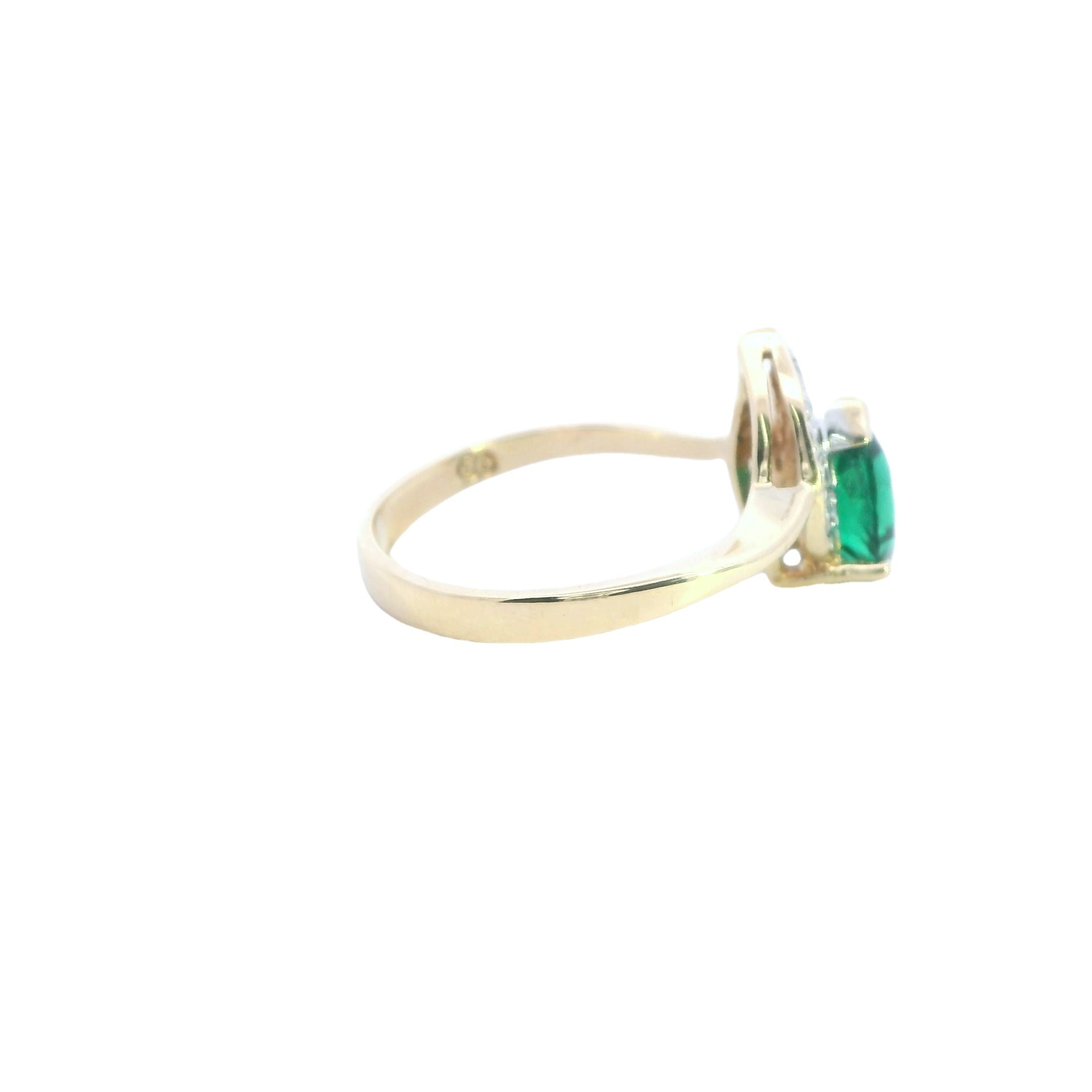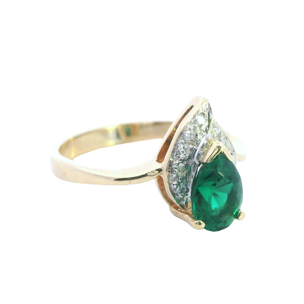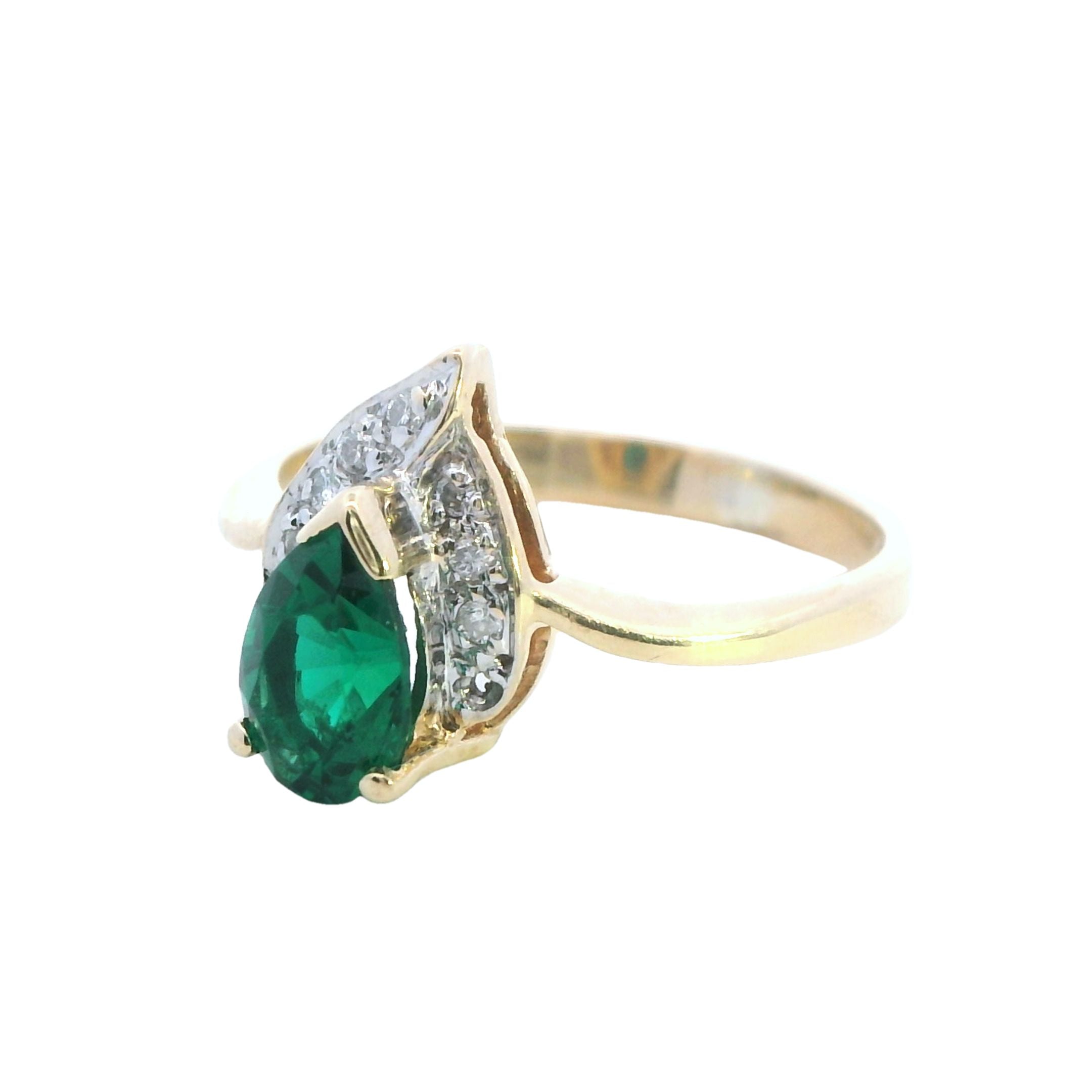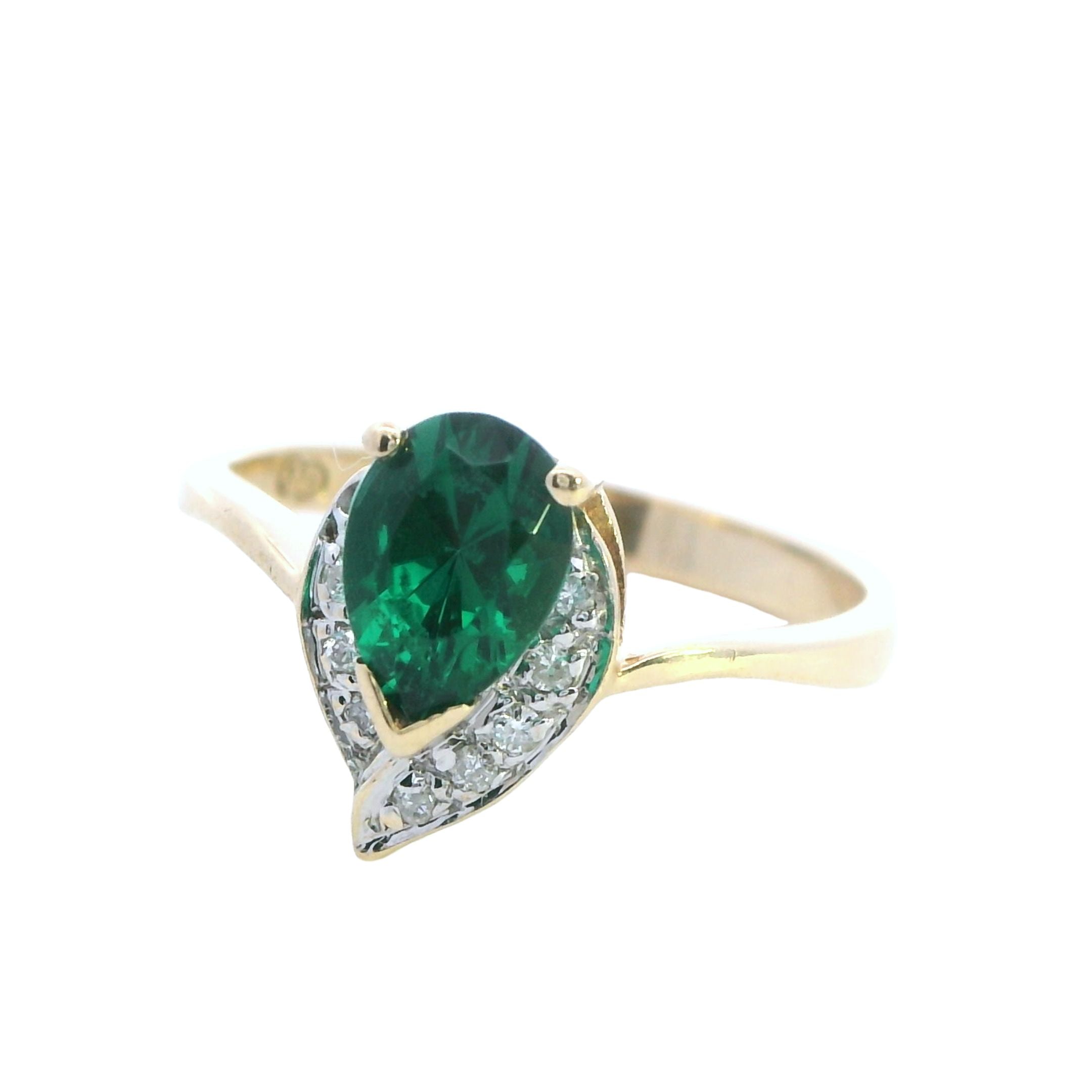 This stunning yellow gold ring with its vibrant created emerald and shimmering diamonds is a gorgeous, affordable way to add elegance to your jewellery collection. Whether it's for a special occasion or a thoughtful gift, this piece is bound to impress.